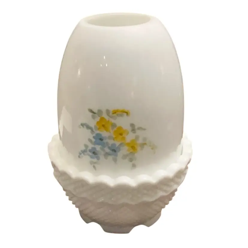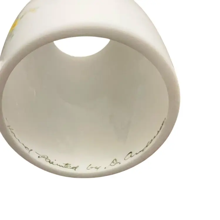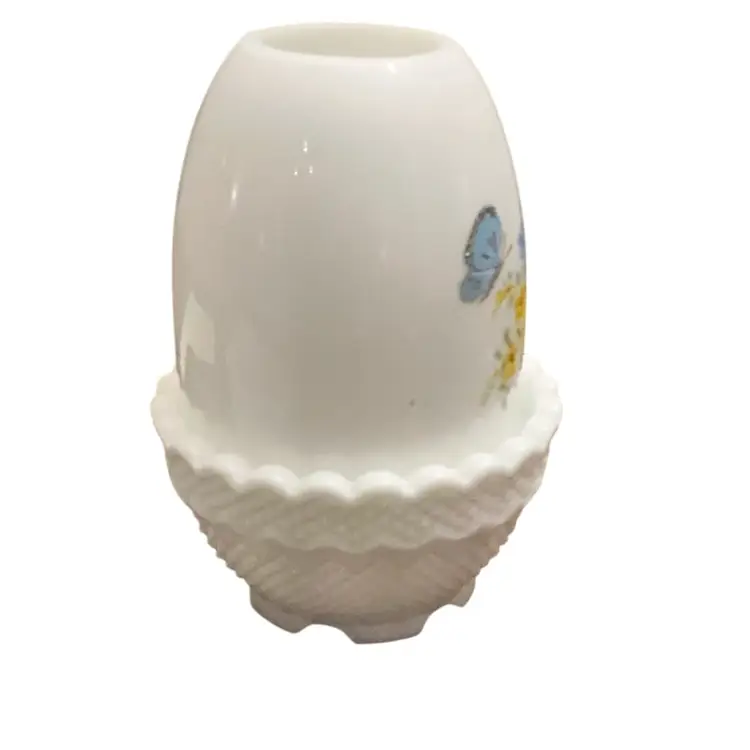 Beautiful hand painted butterflies with a raised frit outline on their wings. No original Fenton sticker is in place but an older Fenton stamped logo is on the base. This style of logo was used mid to late 1970’s. Artist signed and no condition issues.