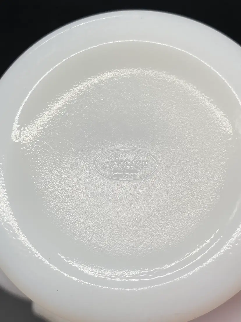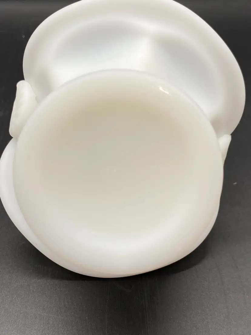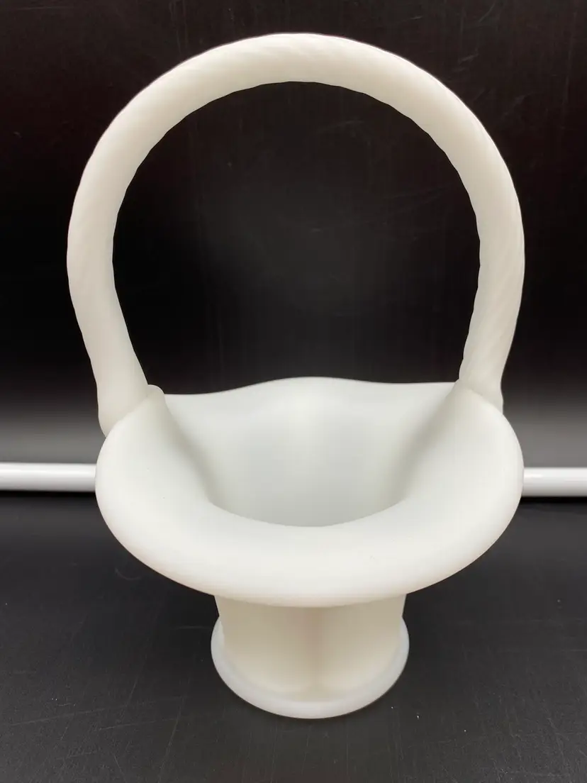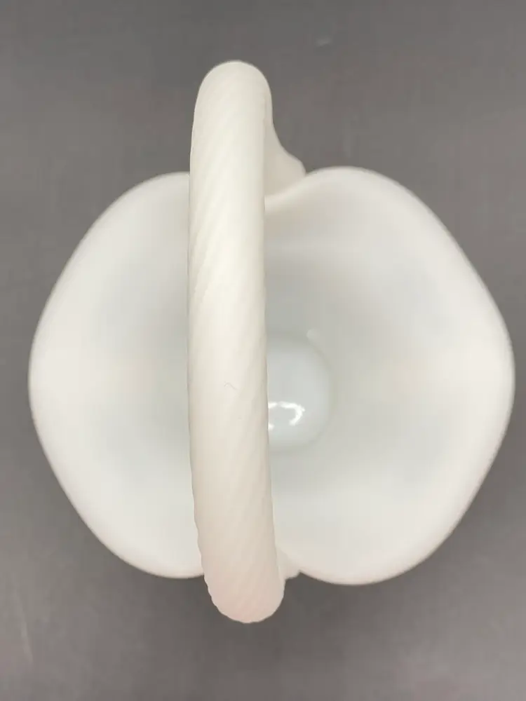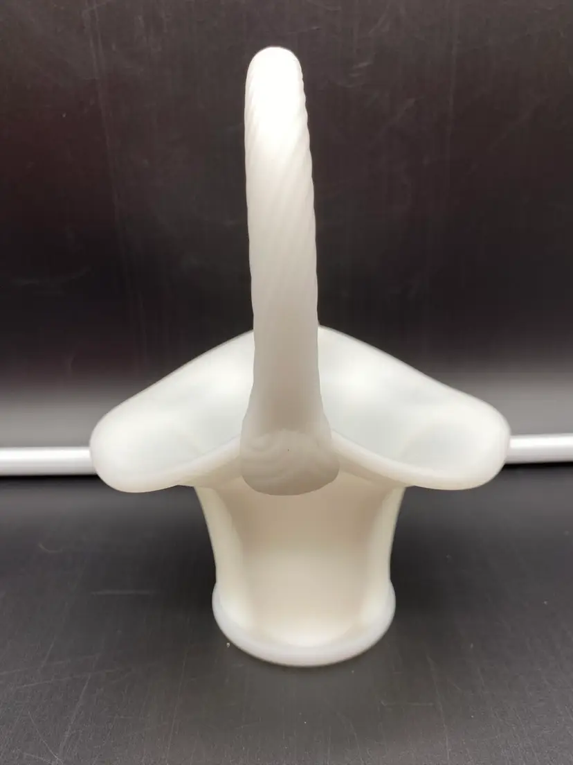 This is in very good condition. There are no chips, cracks or scratches. This is a sold White satin basket which would be stunning with some brightly colored flowers in it. It does have the Fenton logo on the bottom with the number "8" which dates it to the 1980's.