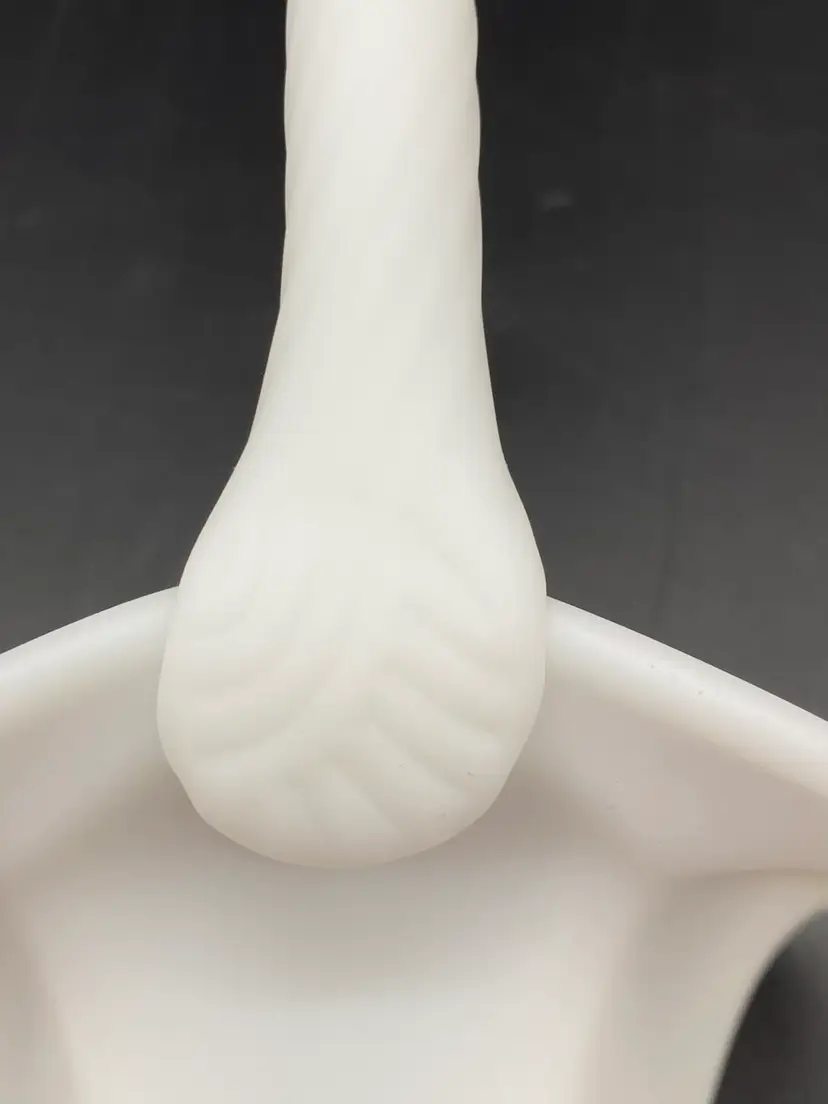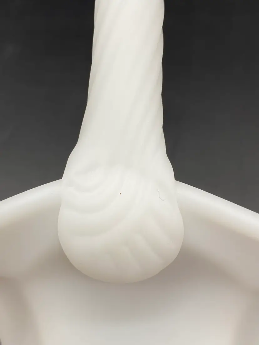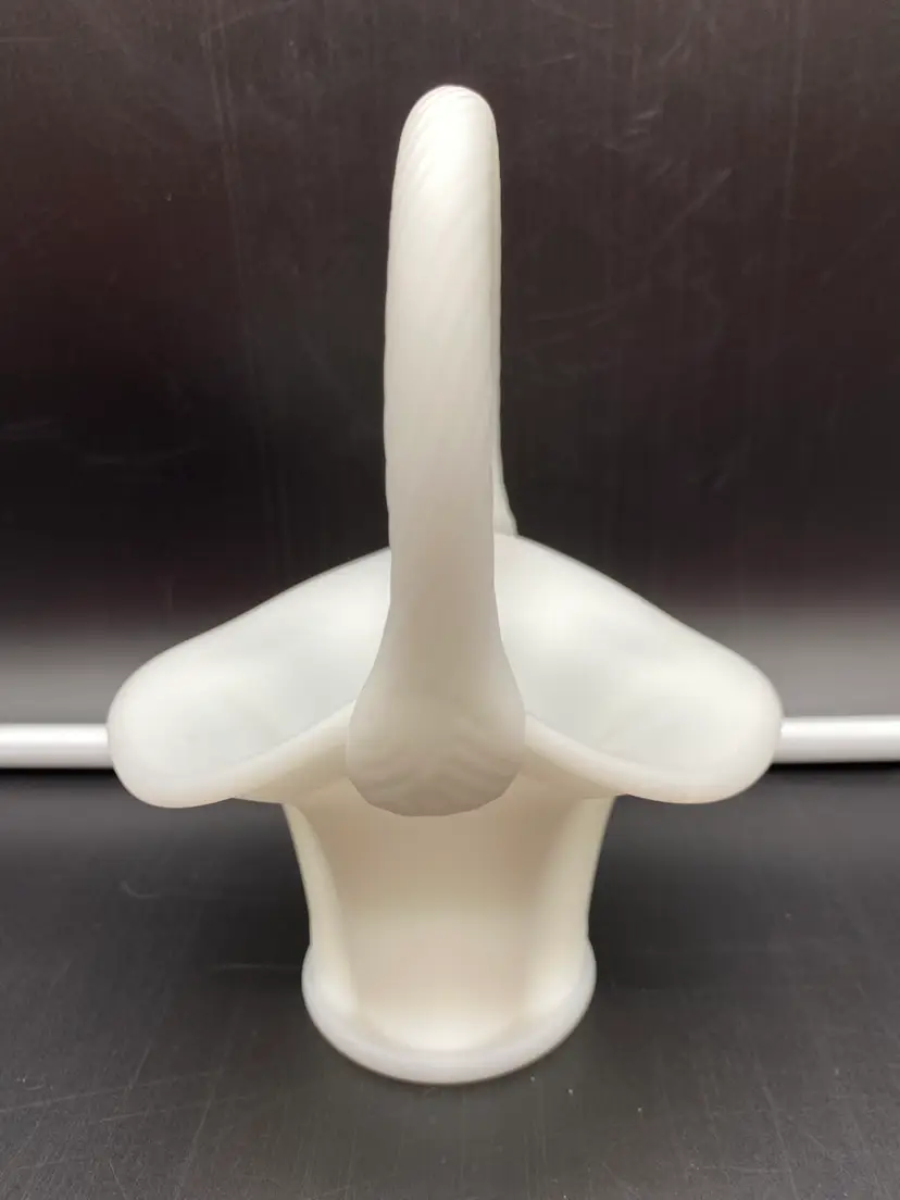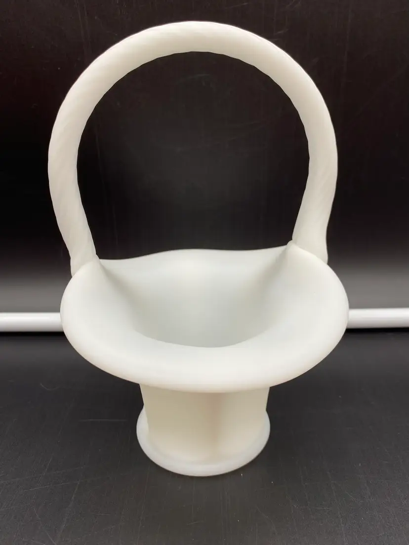 This is in very good condition. There are no chips, cracks or scratches. This is a sold White satin basket which would be stunning with some brightly colored flowers in it. It does have the Fenton logo on the bottom with the number "8" which dates it to the 1980's.