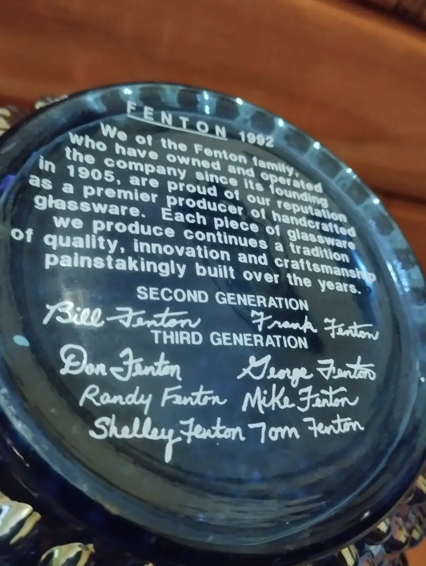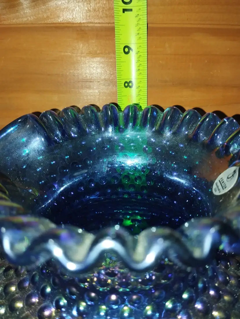 1992 Fenton Twilight Blue Iridescent Carnival Hobnail 8” Pitcher with Handle and 8 Matching Glasses. Excellent Condition. Signed With Stickers.