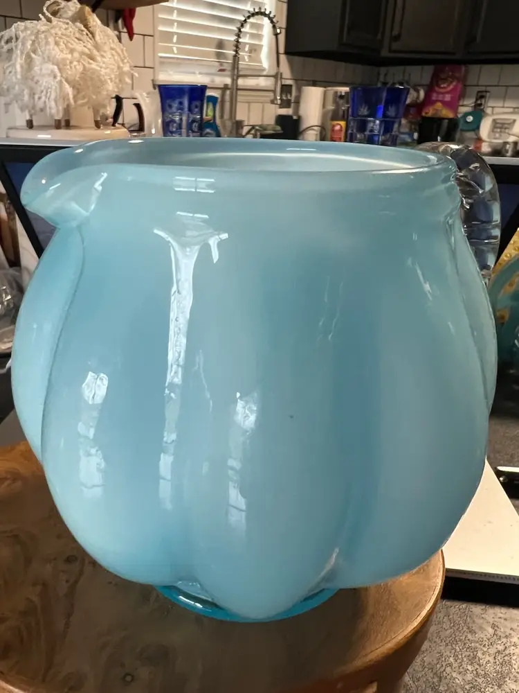 This vintage Fenton glass pitcher is a blue overlay melon pitcher, featuring a distinct cased glass technique with a pale aqua blue exterior over a crystal interior layer.