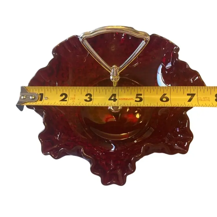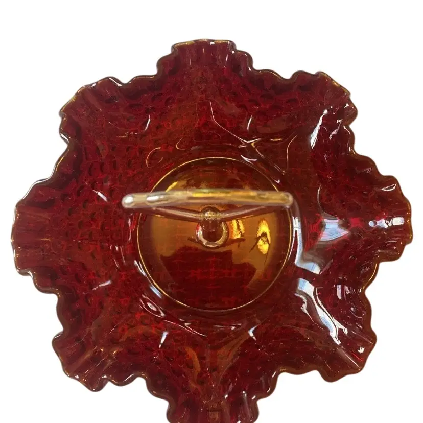 This beautiful Fenton candy dish features a stunning amberina hobnail design with crimped edges. The dish is perfect for displaying as a decorative piece or serving candies and other small treats. Made by Fenton, a well-known brand in the glassware industry, this dish is sure to impress your guests. Its classic design and high-quality craftsmanship make it a timeless addition to any collection. Whether you're a fan of Fenton glass or just looking for a unique piece to add to your home, this candy dish is a must-have.