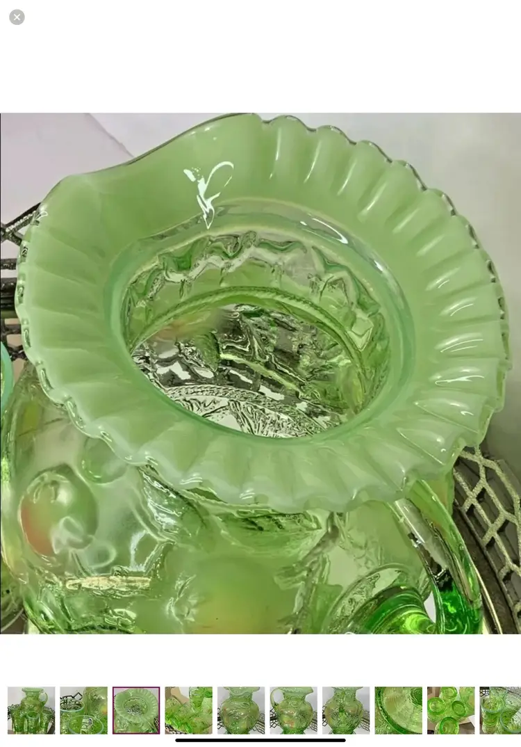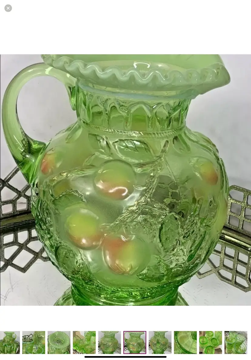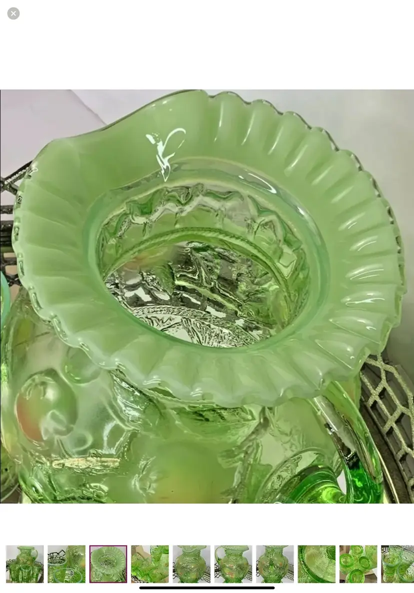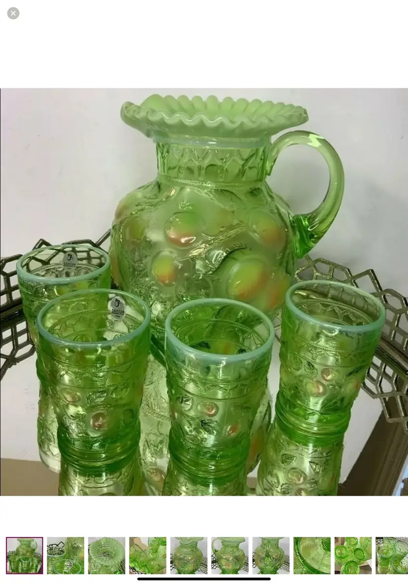 Fenton Apple green with ruffled top Water Set Pitcher and 4 Tumblers Artist Signed Pitcher 9”tall Tumblers 4” tall Mint condition This is a gorgeous Fenton set