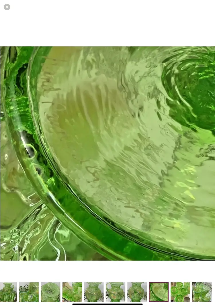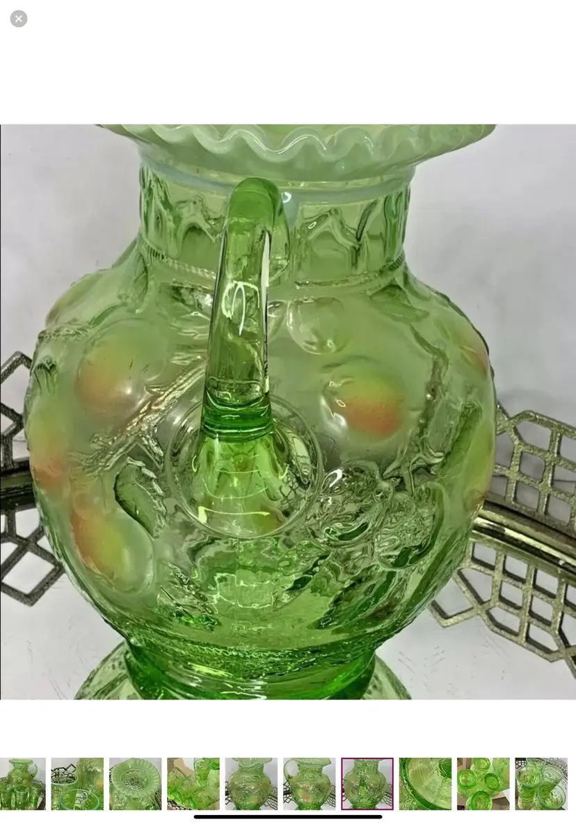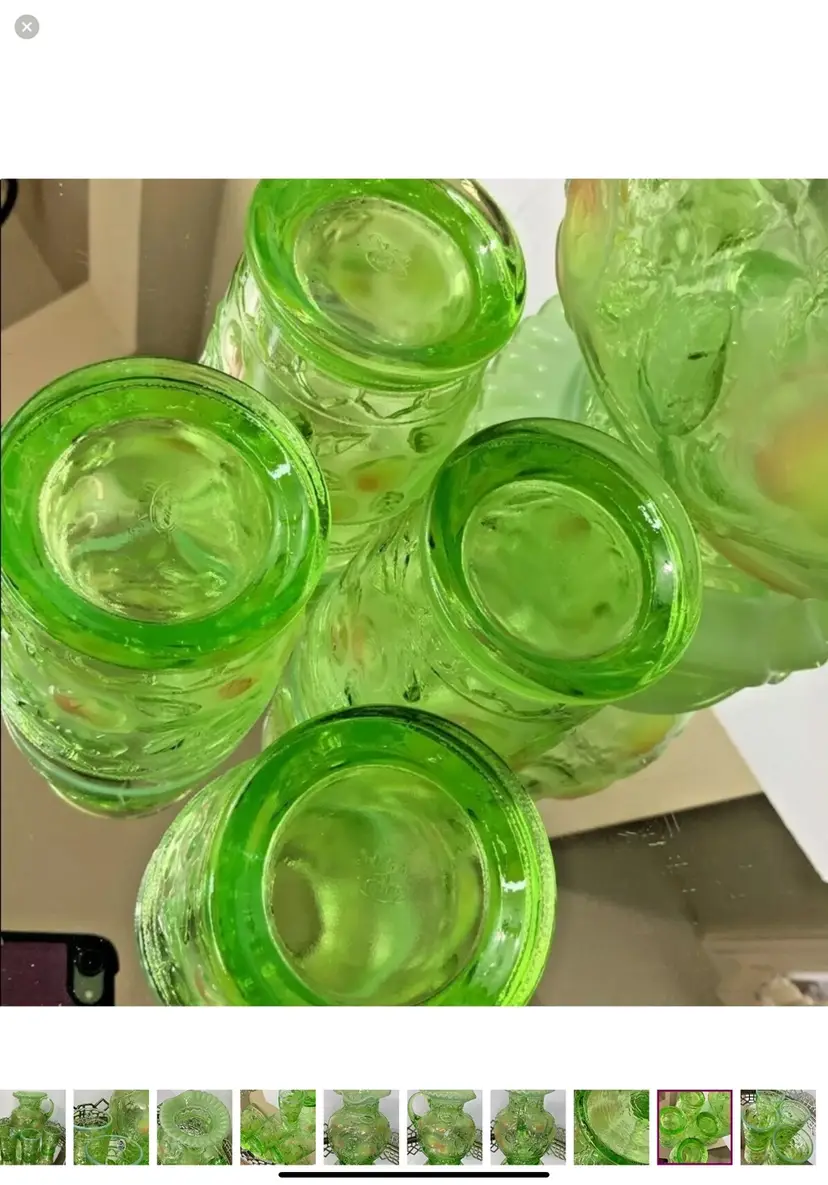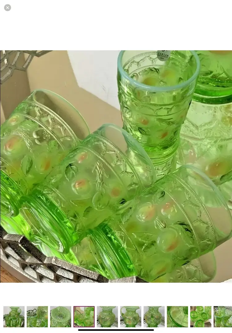 Fenton Apple green with ruffled top Water Set Pitcher and 4 Tumblers Artist Signed Pitcher 9”tall Tumblers 4” tall Mint condition This is a gorgeous Fenton set