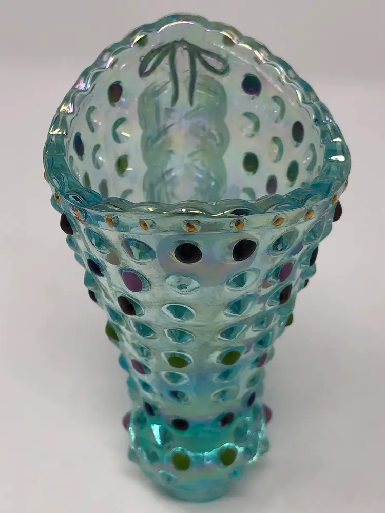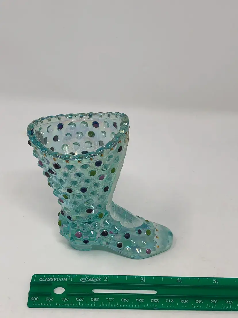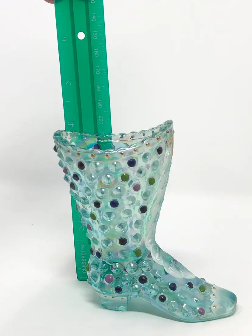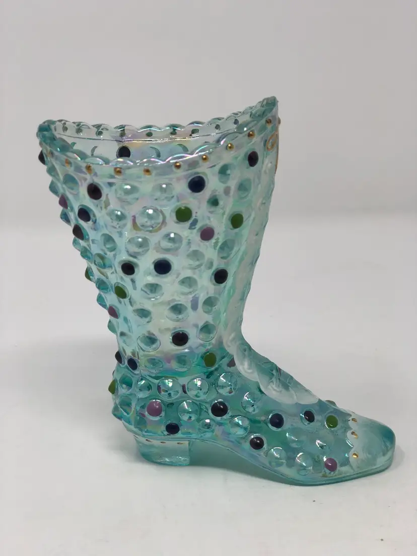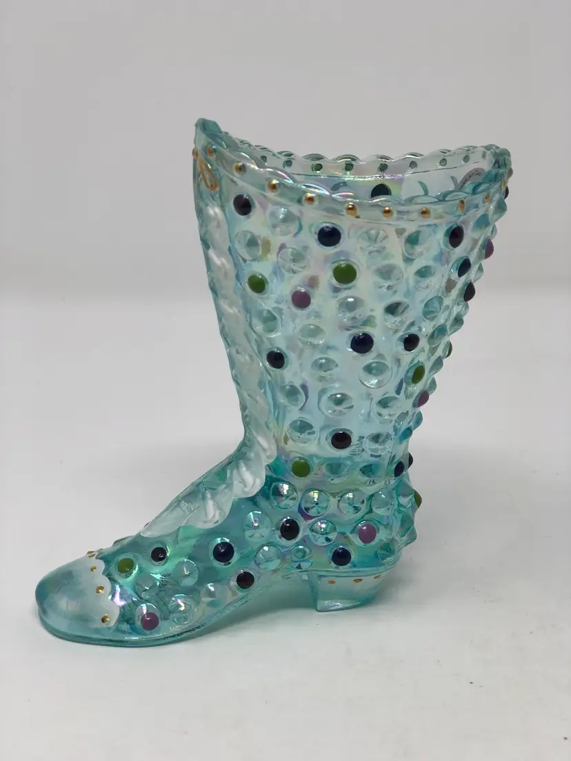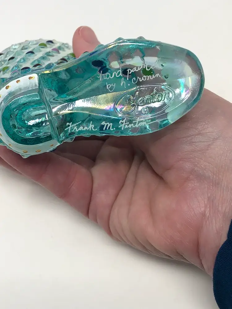 4" aquamarine hobnail boot by Fenton glass. Hand painted and signed by H. Cronin. Also signed by Frank M. Fenton in honor of the 95th Anniversary Celebration. Accented 22K gold details. Excellent condition with original anniversary silver label