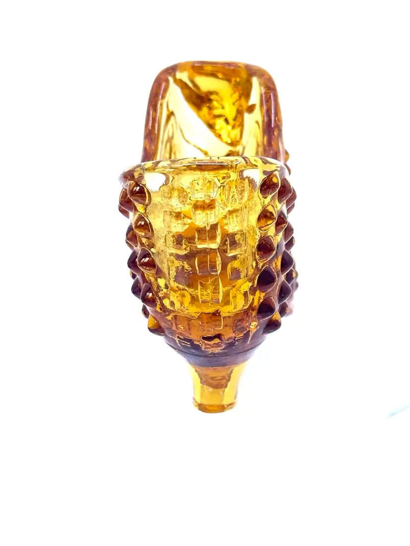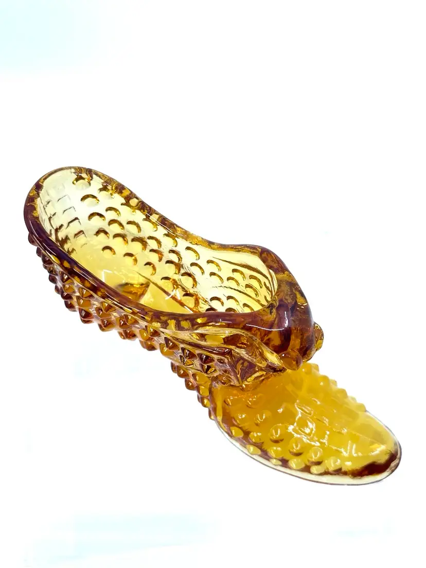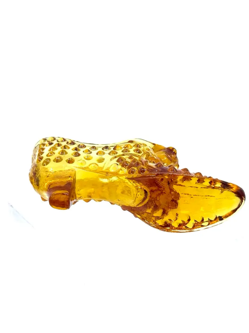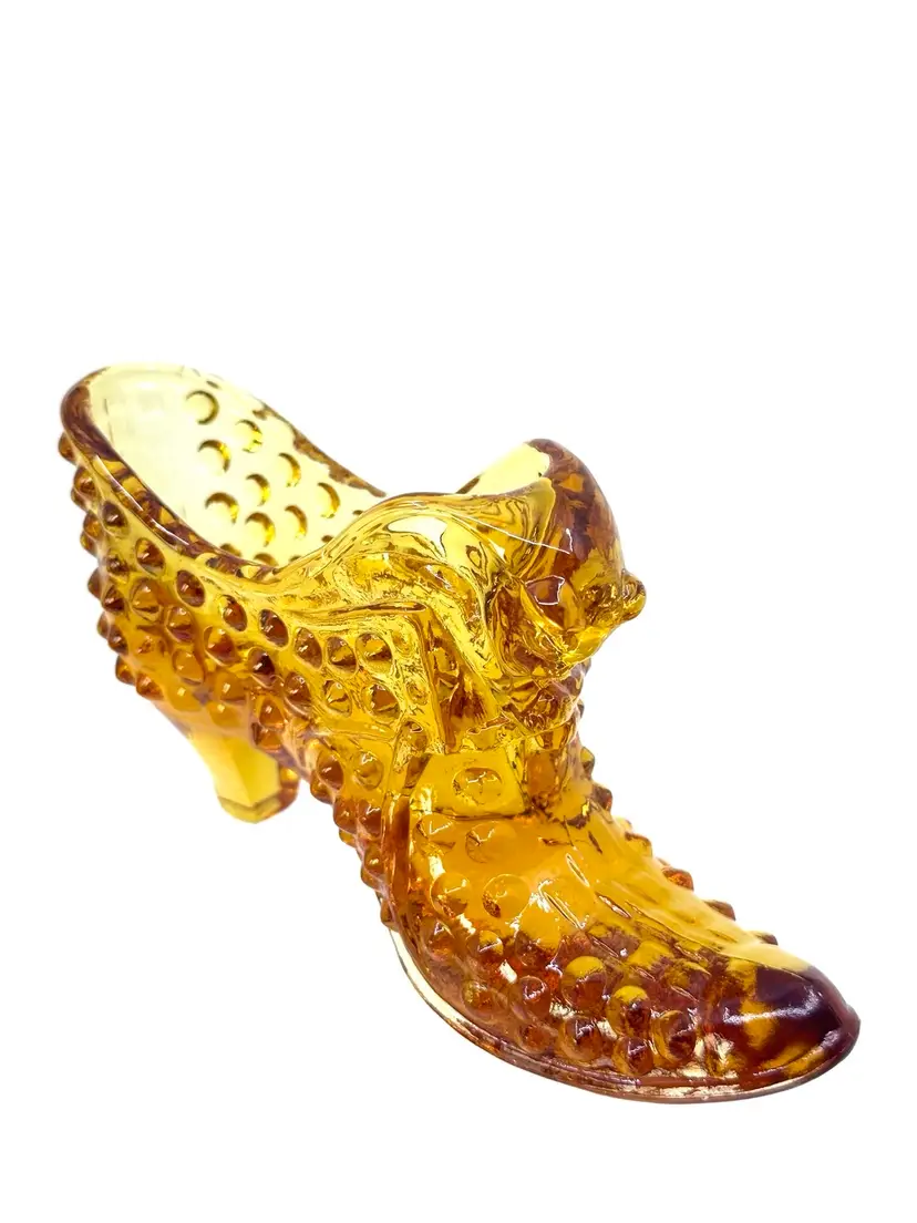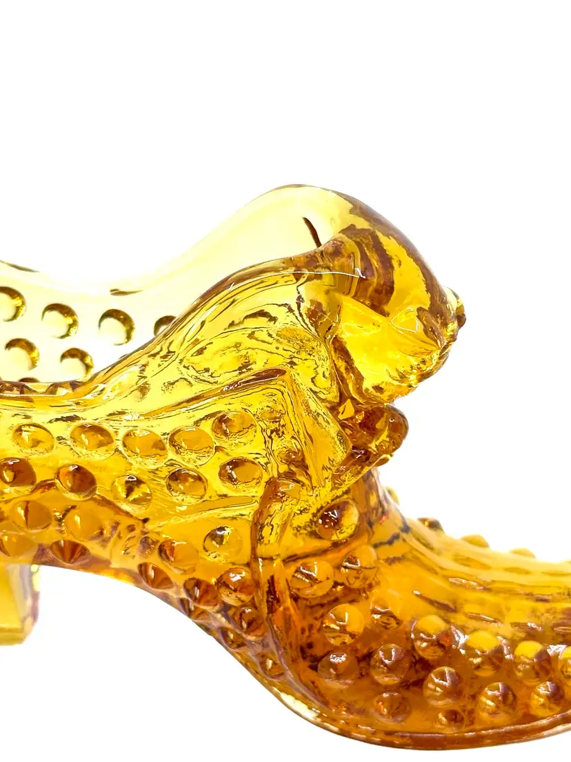 This Fenton Art Glass Amber Hobnail Shoe Slipper with Cat Head is a beautiful and unique decorative piece for any collection. The shoe is made of high-quality glass and features a stunning hobnail pattern in a rich amber color. The cat head adds a touch of whimsy and art to the design.