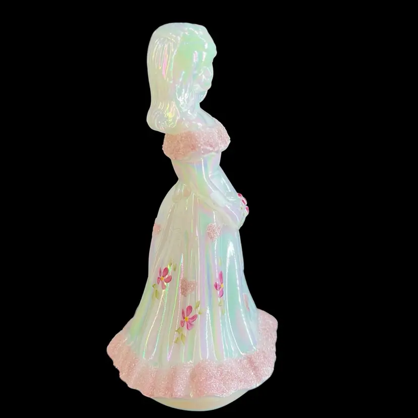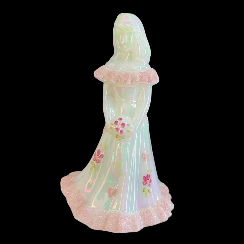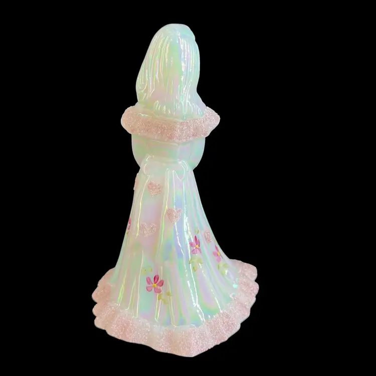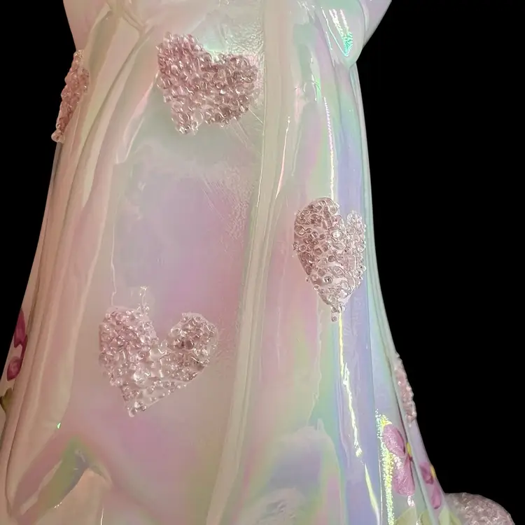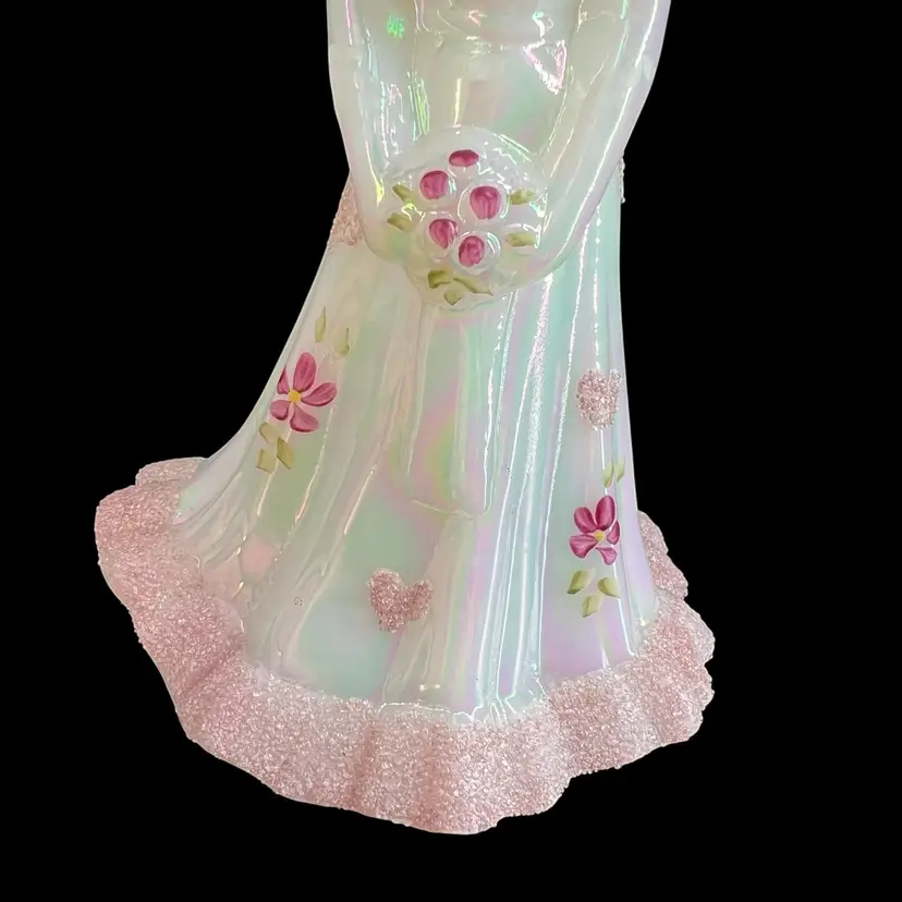 This beautiful Fenton milk glass figurine is a stunning addition to any collection. The iridescent white glass is adorned with delicate hearts and flowers, hand-painted with precision and care. The intricate frit design adds texture and depth to the piece, making it a true work of art.