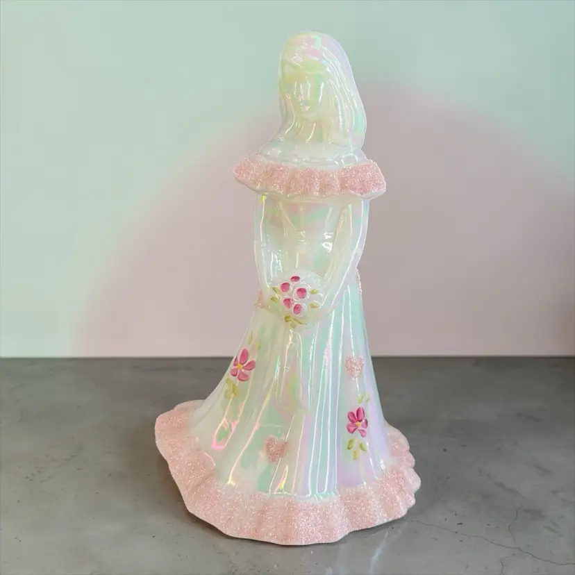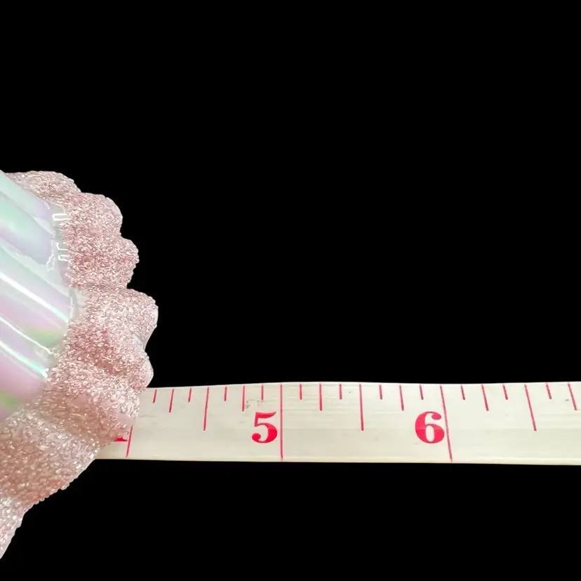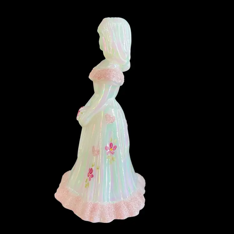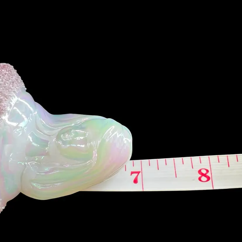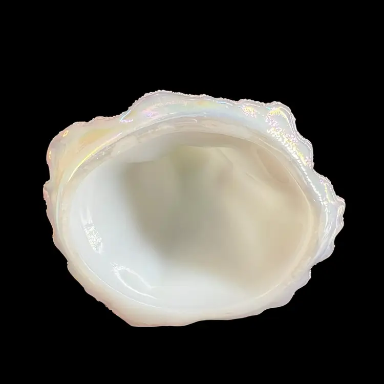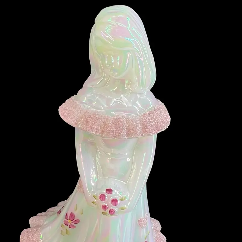 This beautiful Fenton milk glass figurine is a stunning addition to any collection. The iridescent white glass is adorned with delicate hearts and flowers, hand-painted with precision and care. The intricate frit design adds texture and depth to the piece, making it a true work of art.