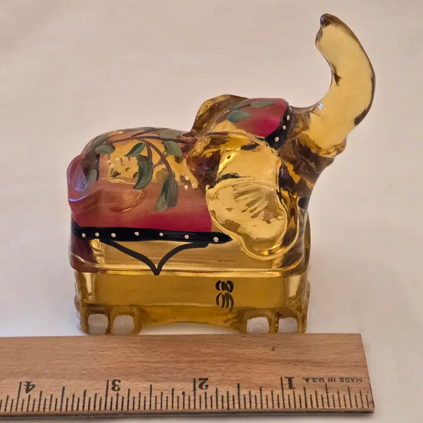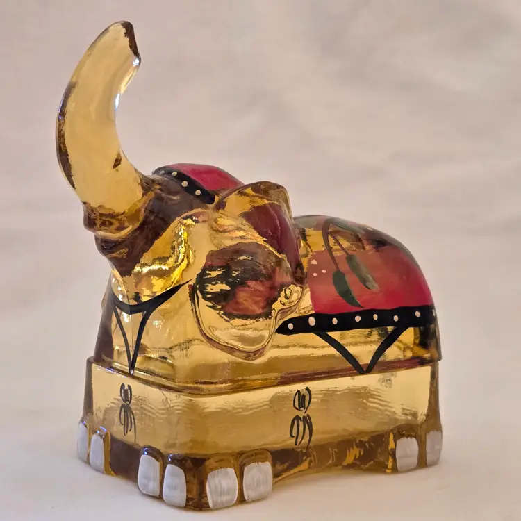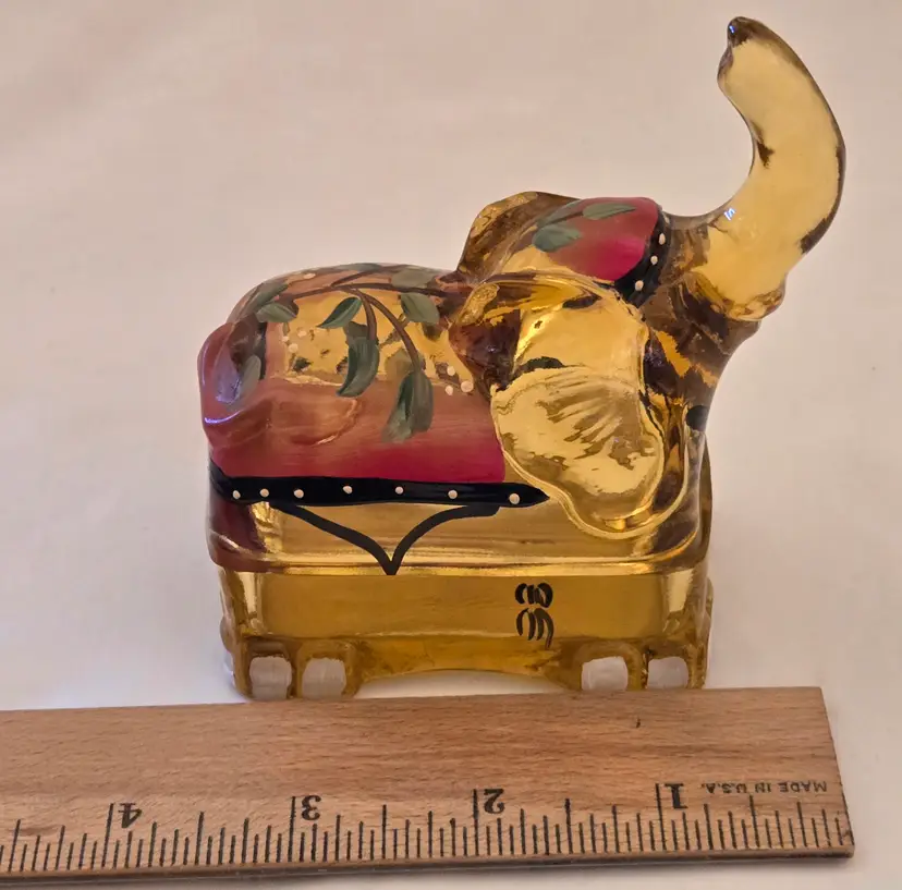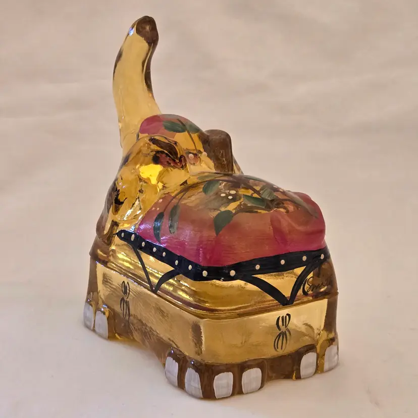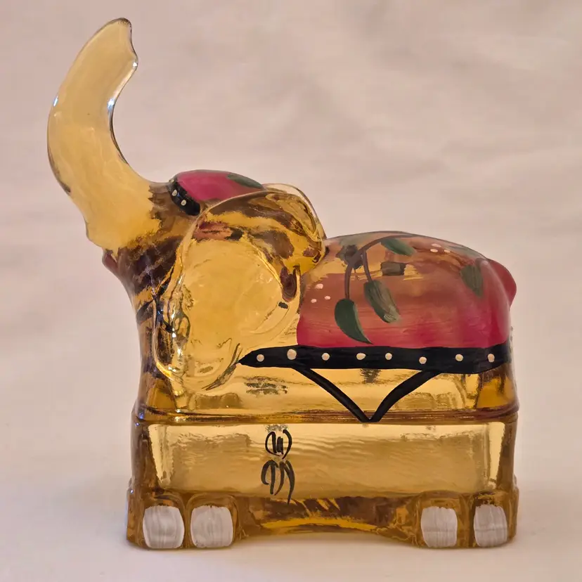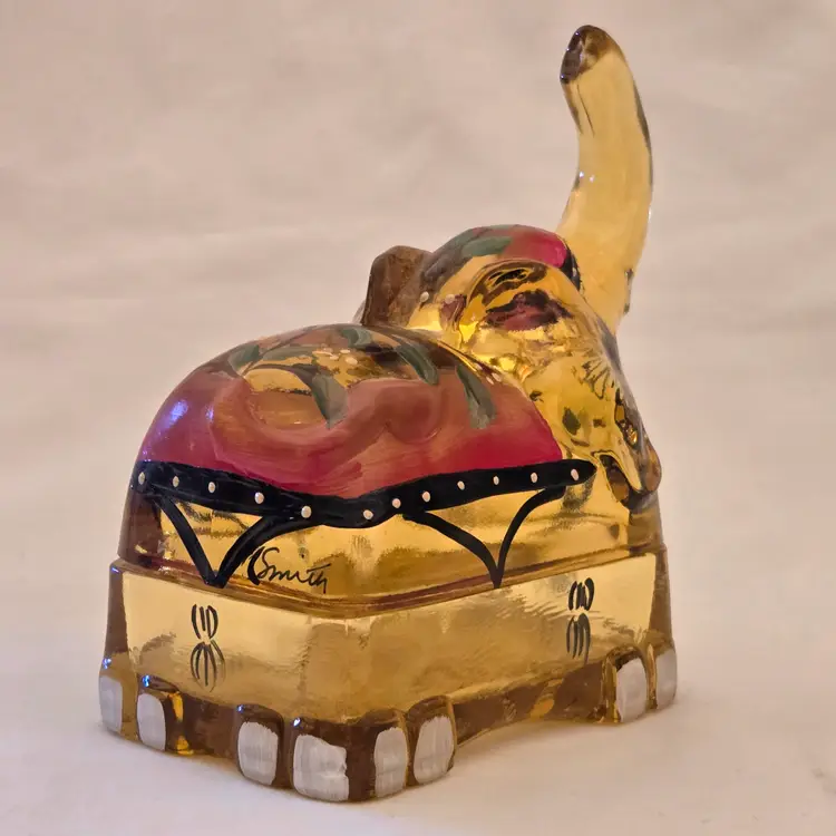 Fenton Art Glass Handpainted Multicolor / Autumn Gold Elephant Trinket Box / Ring Holder Signed by Smith. Used condition with some dirt and stains. Please view all the photos and please ask any questions prior to purchase when possible. NOTE: color rendition may differ between what you see in the photos and what you receive if purchased due to lighting conditions.