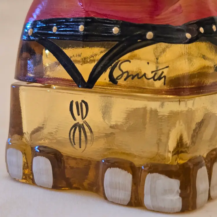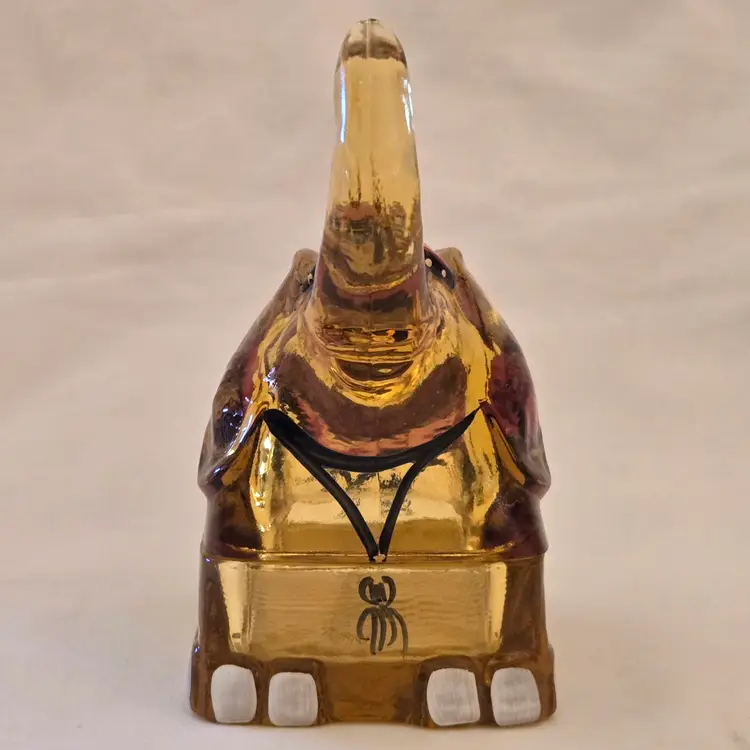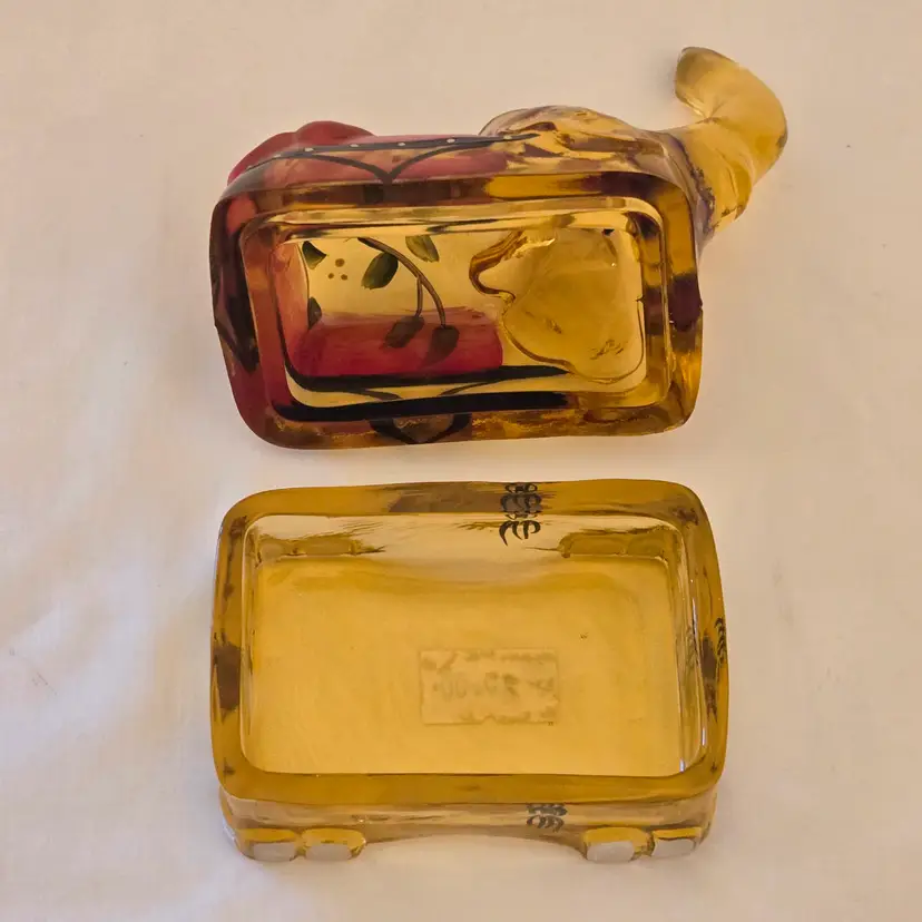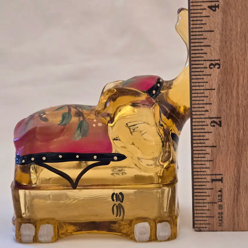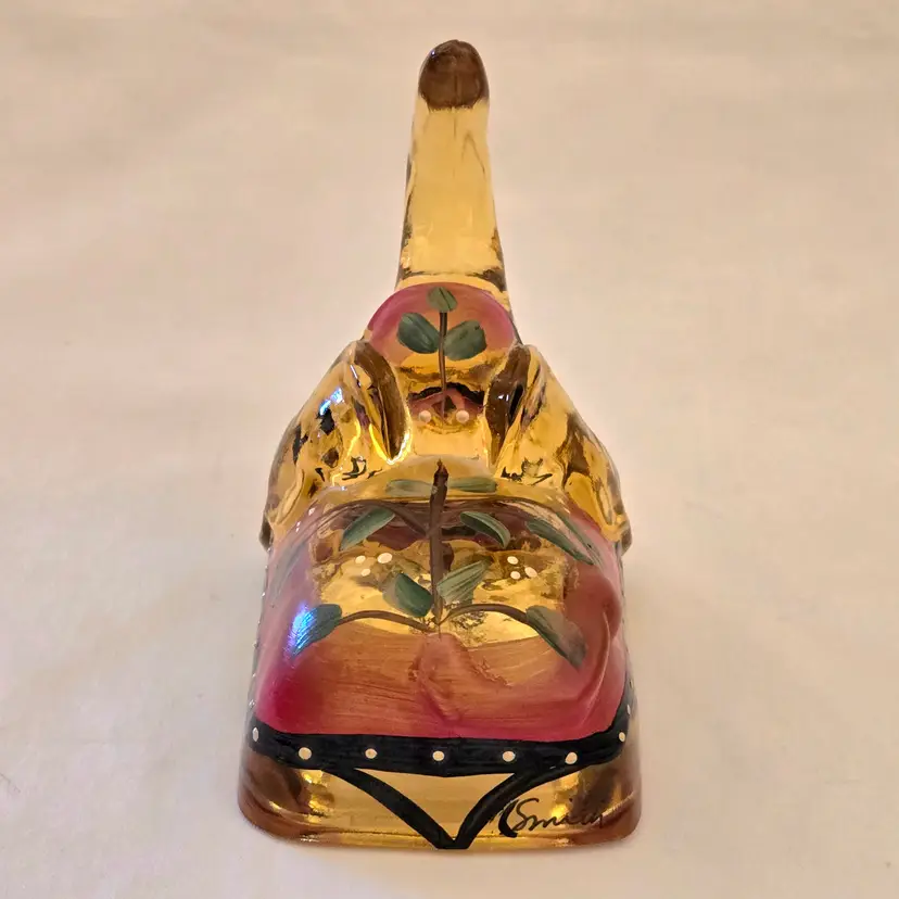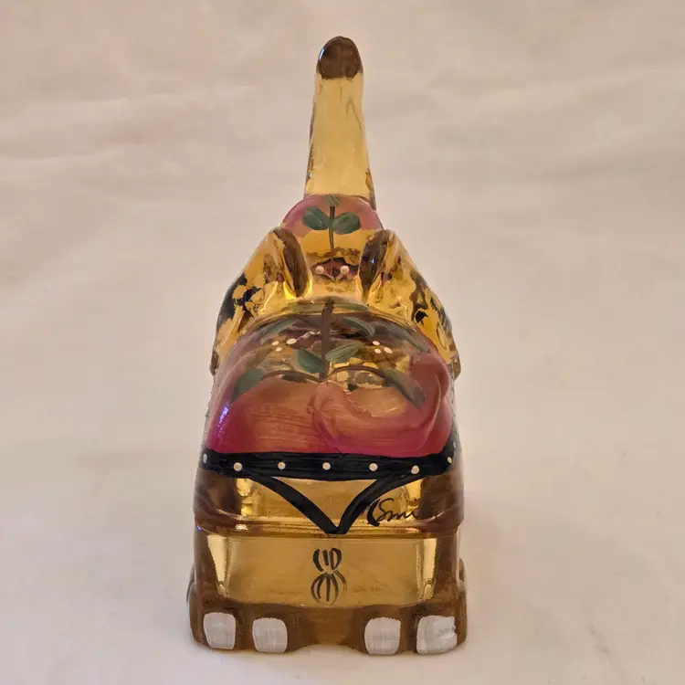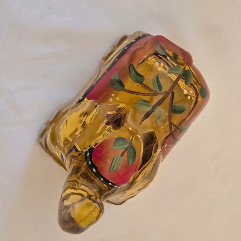 Fenton Art Glass Handpainted Multicolor / Autumn Gold Elephant Trinket Box / Ring Holder Signed by Smith. Used condition with some dirt and stains. Please view all the photos and please ask any questions prior to purchase when possible. NOTE: color rendition may differ between what you see in the photos and what you receive if purchased due to lighting conditions.