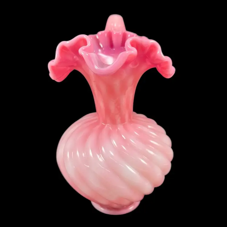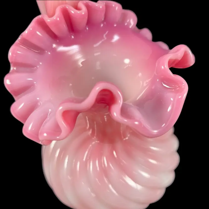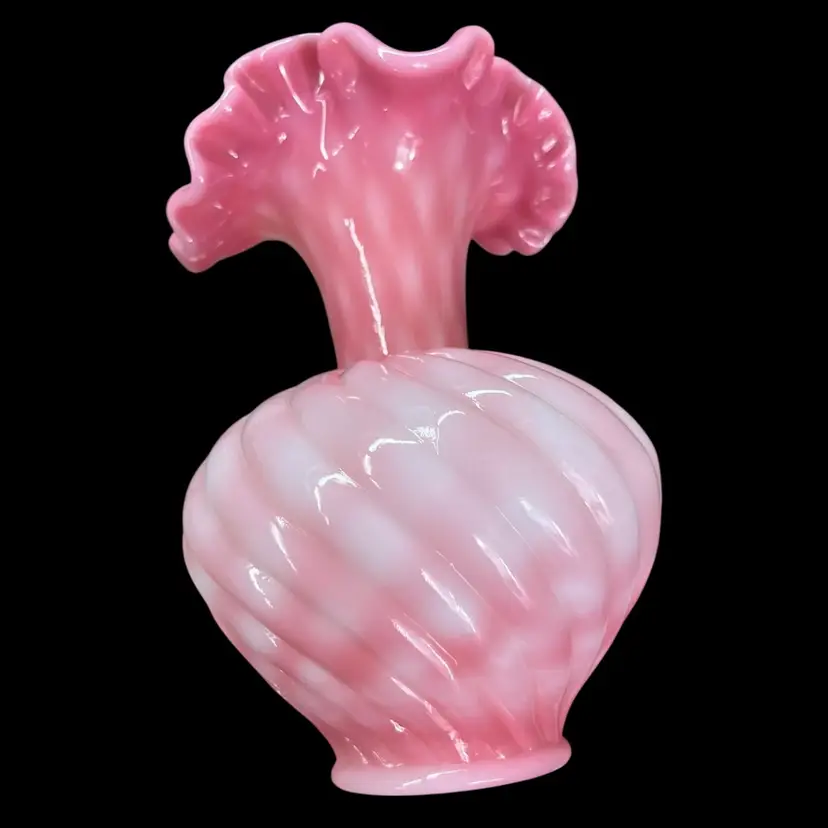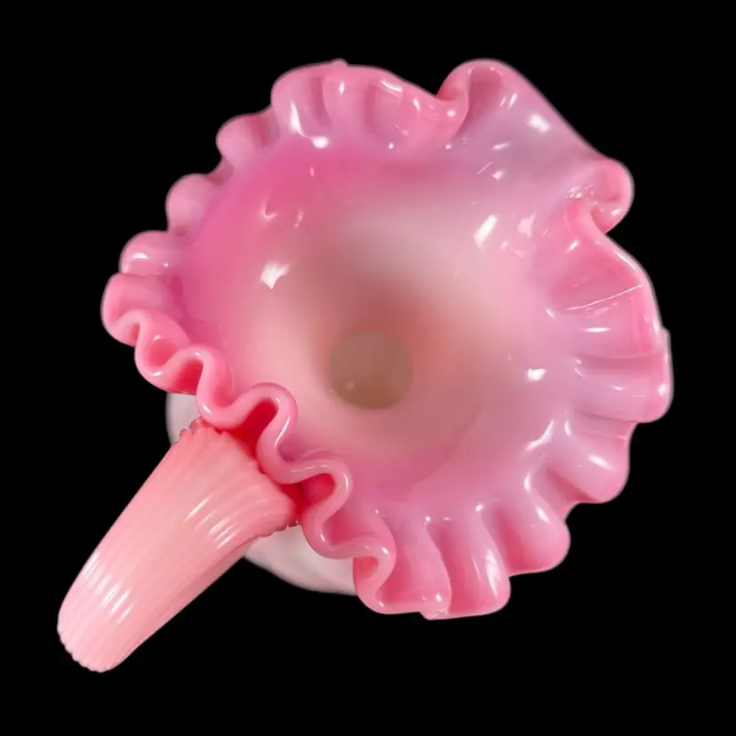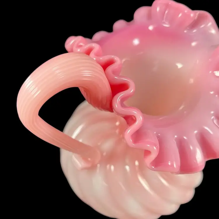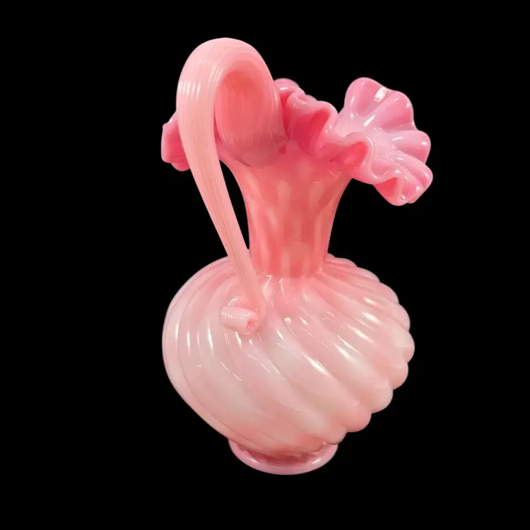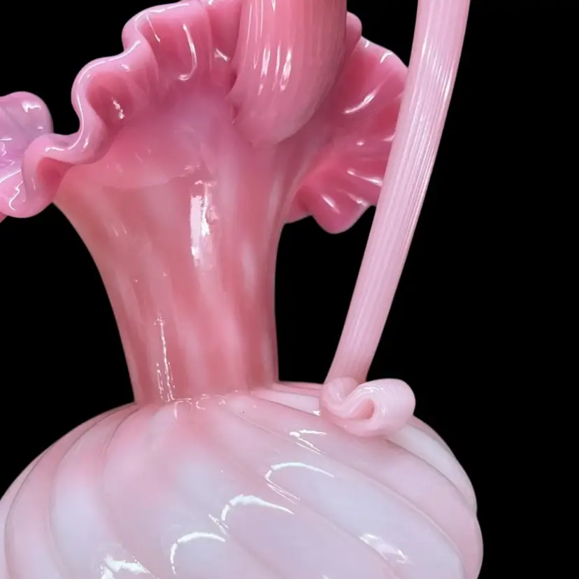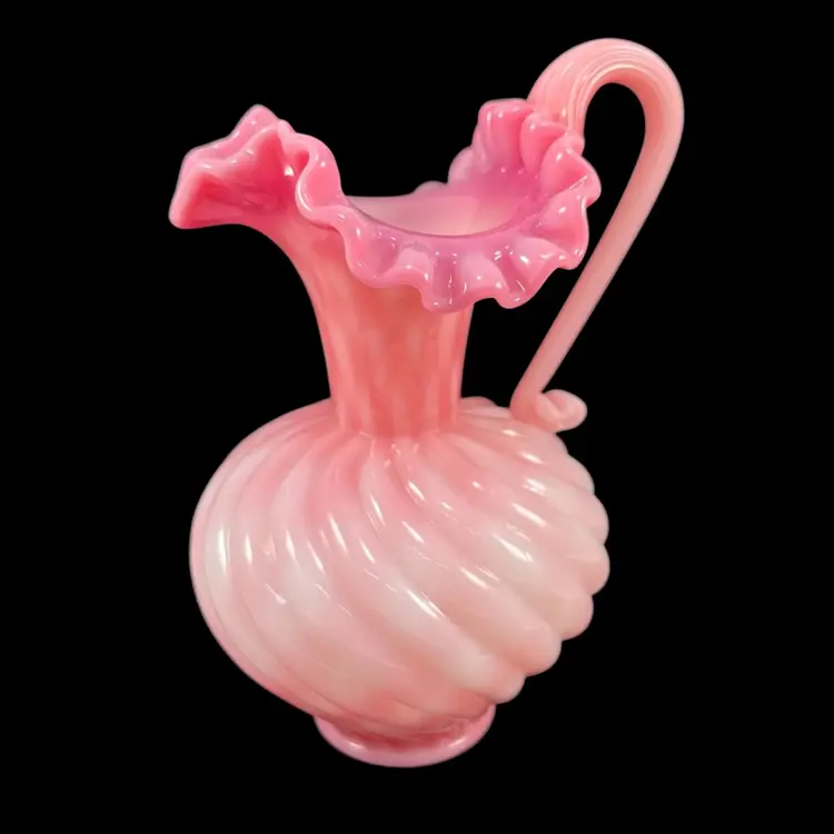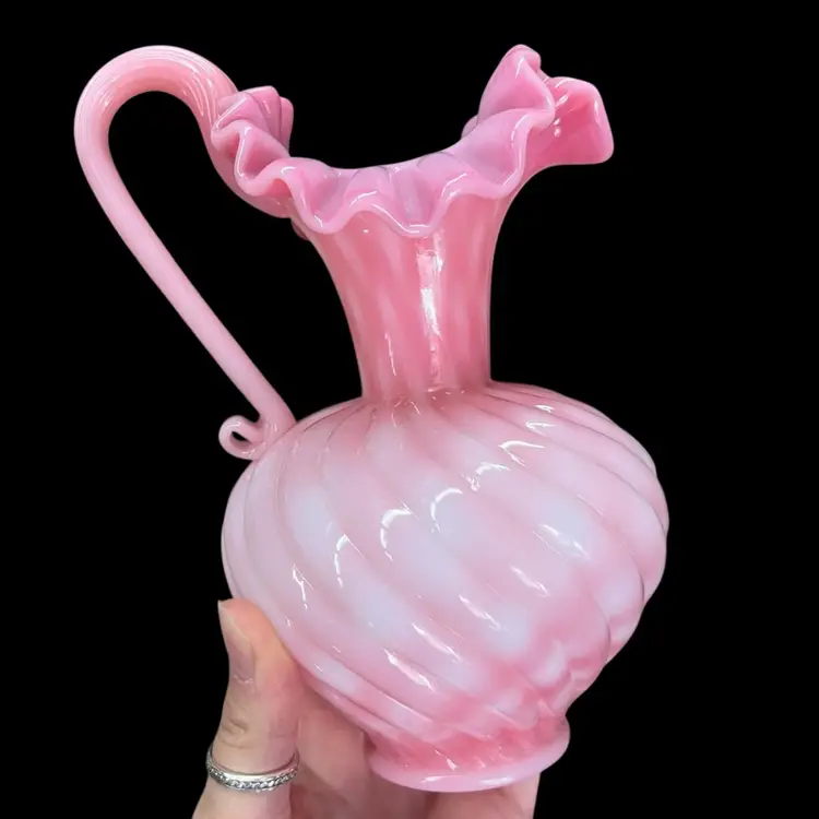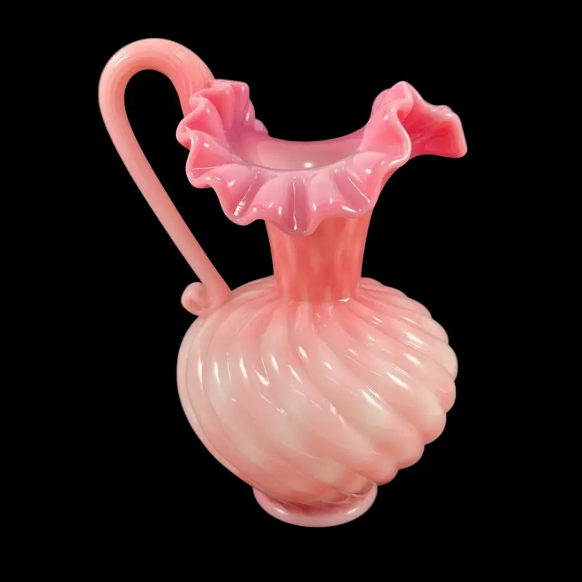 Approximately 6.75” tall to top of handle. Body is approximately 4” inches diameter. Pitcher that could also be used as a beautiful vase. No chips or cracks. Some dust on very bottom inside.