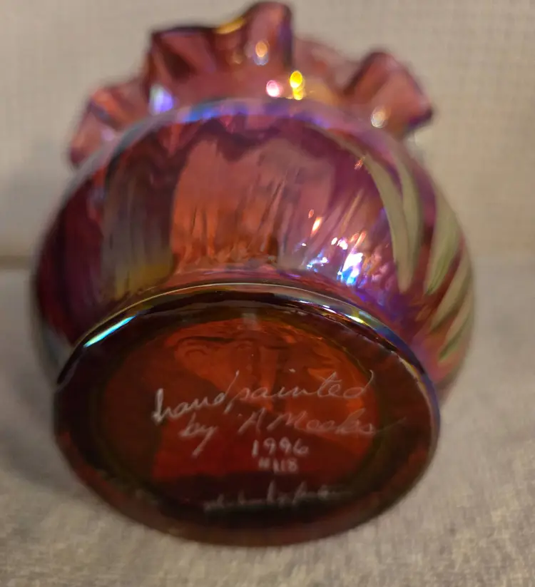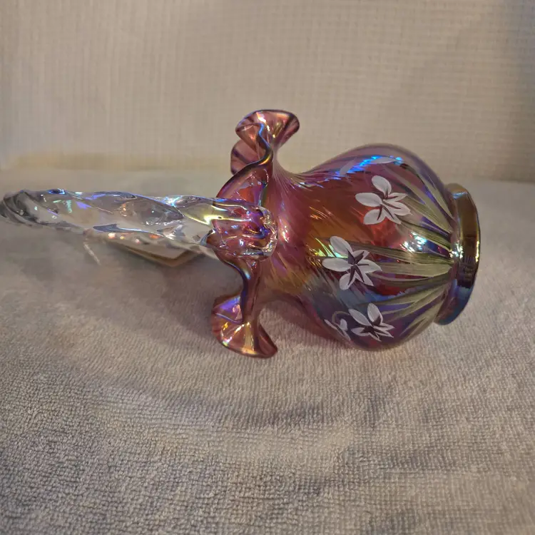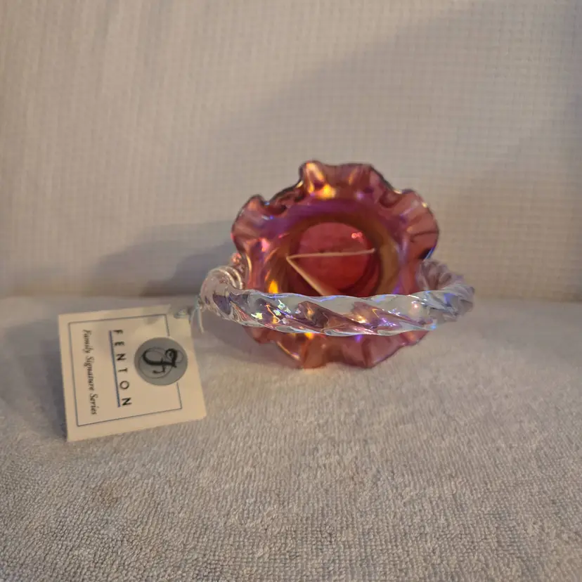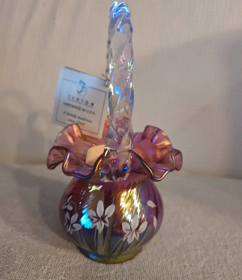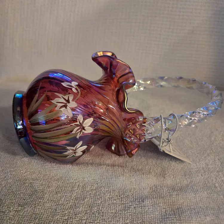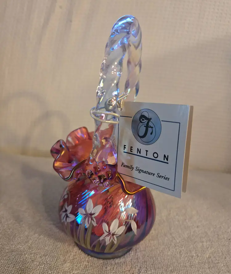 Fenton Art Glass "Michael Fenton: Signiture Series cranberry basket with an applied crystal handle and a ruffled edge. Hand painted by A. Meeks and signed by Michael Fenton. 1996 #118. It has a star flower design. Has original tag with original price and a tag on the handle stating it's a family signiture series. Measures 7 1/2" tall and 4" wide. No chips, cracks, or repairs. In perfect condition.