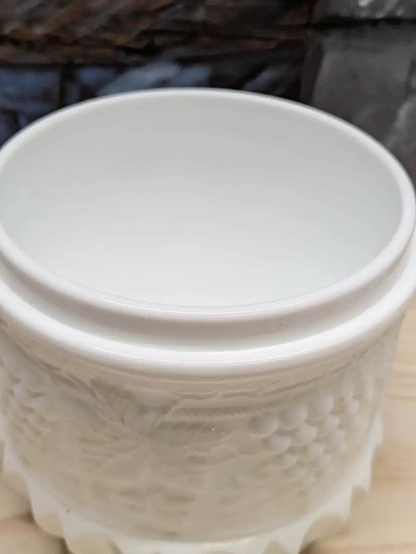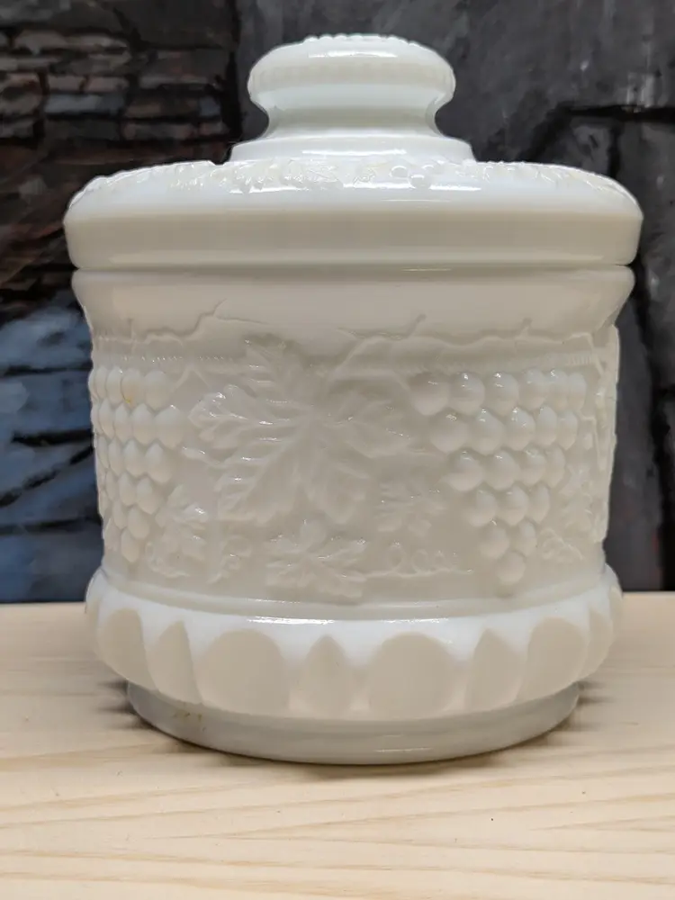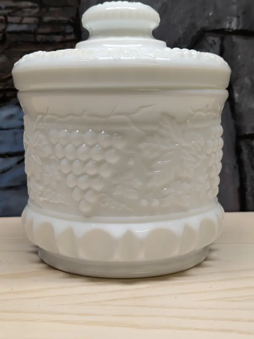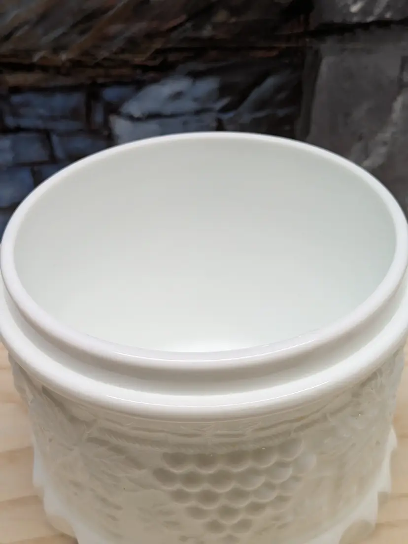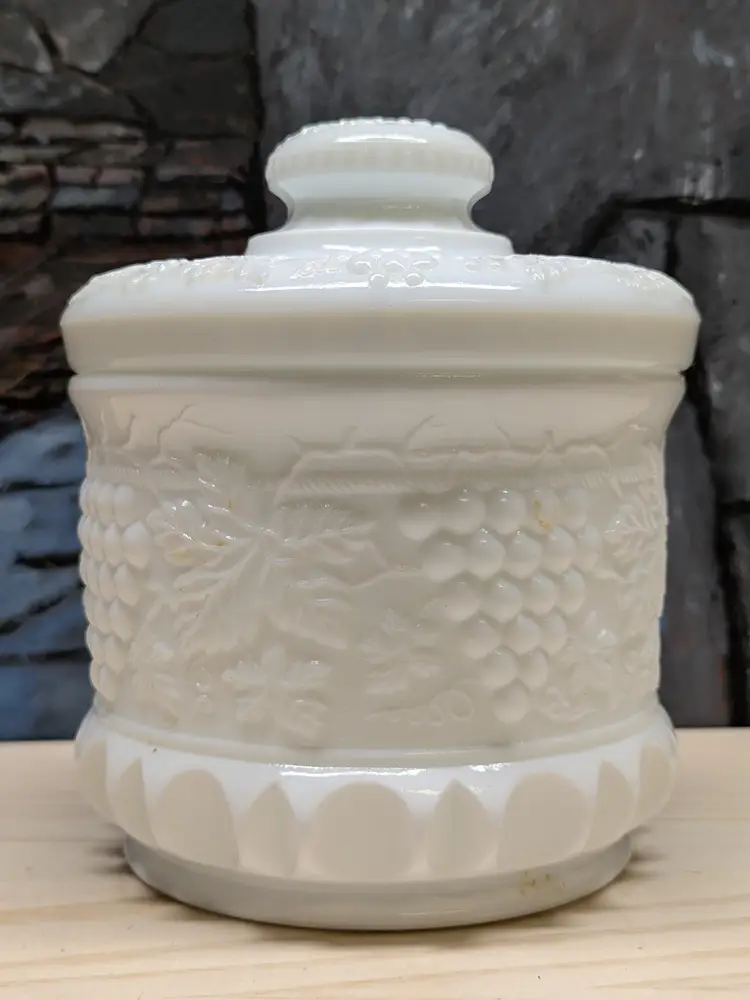 Fenton Art Glass Milk Glass Grape & Cable Tobacco Jar Humidor. Can be use as a cookie, candy or biscuit Jar .This Jar measures 7" tall and 6' wide Perfect for the retro Grandma kitchen. Great condition Clean with no damage.no chips or cracks no weird smells. Please check the photos for details. Comes from a smoke free home. We do have pets.