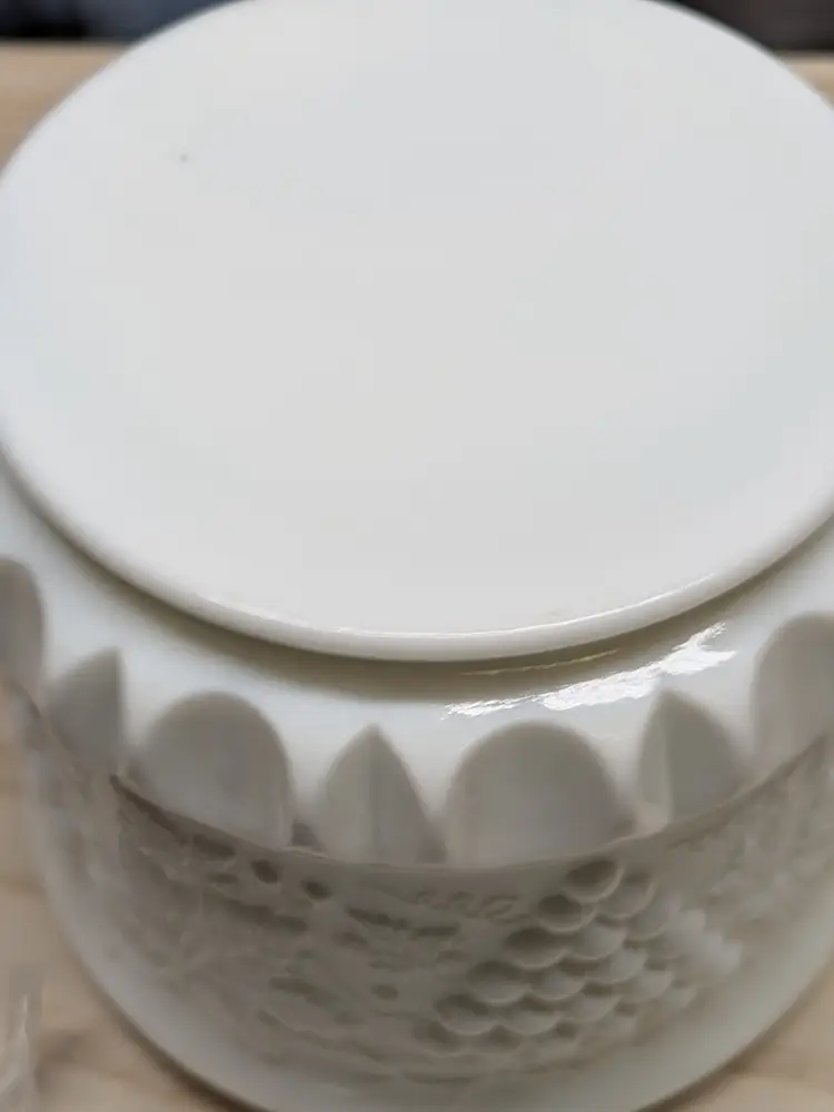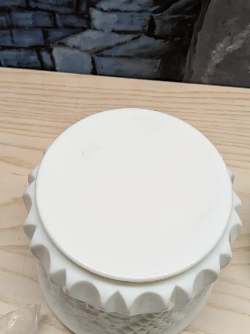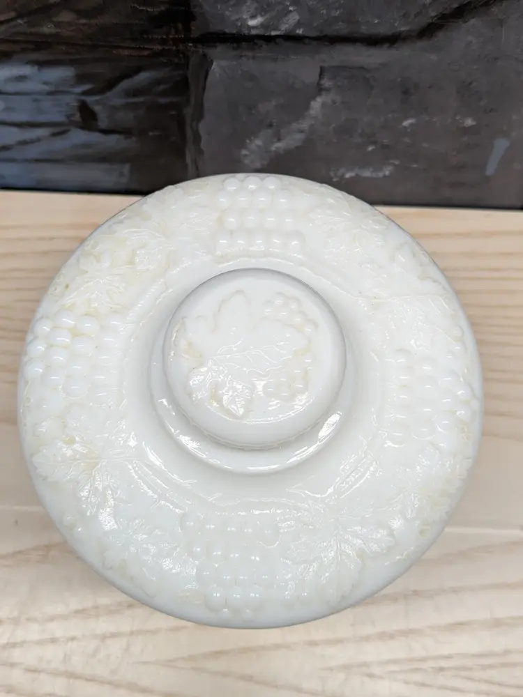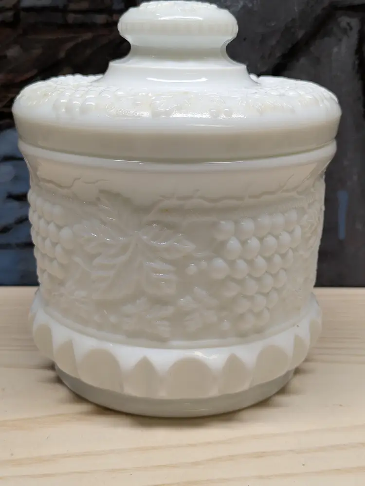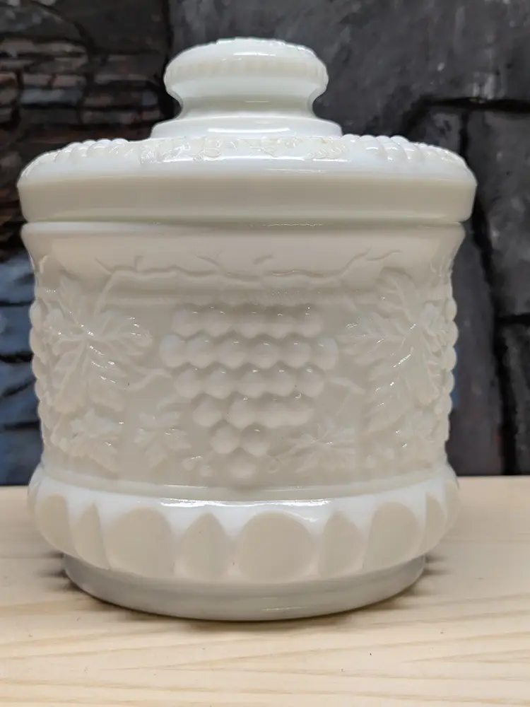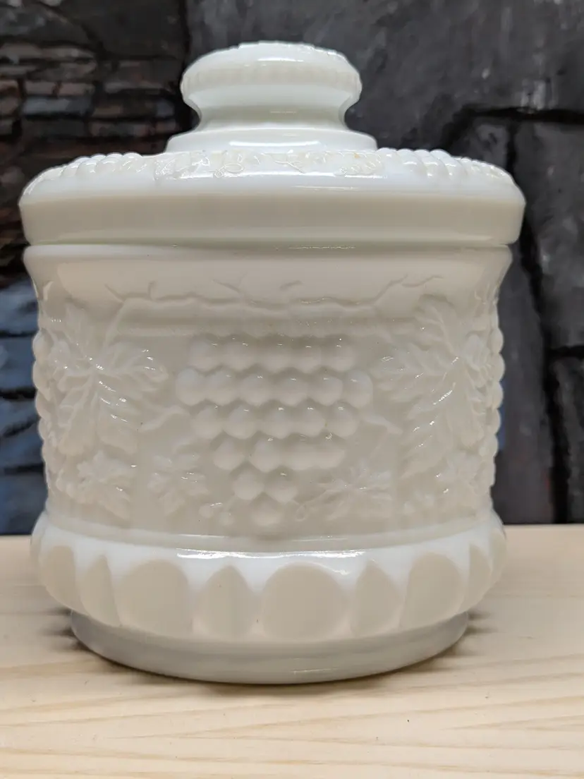 Fenton Art Glass Milk Glass Grape & Cable Tobacco Jar Humidor. Can be use as a cookie, candy or biscuit Jar .This Jar measures 7" tall and 6' wide Perfect for the retro Grandma kitchen. Great condition Clean with no damage.no chips or cracks no weird smells. Please check the photos for details. Comes from a smoke free home. We do have pets.