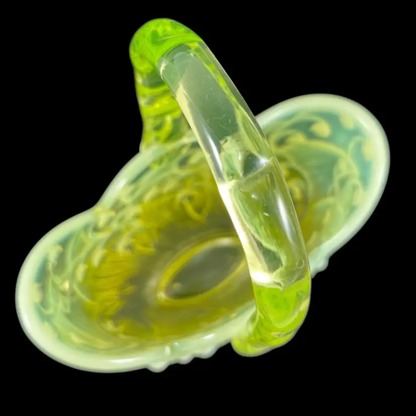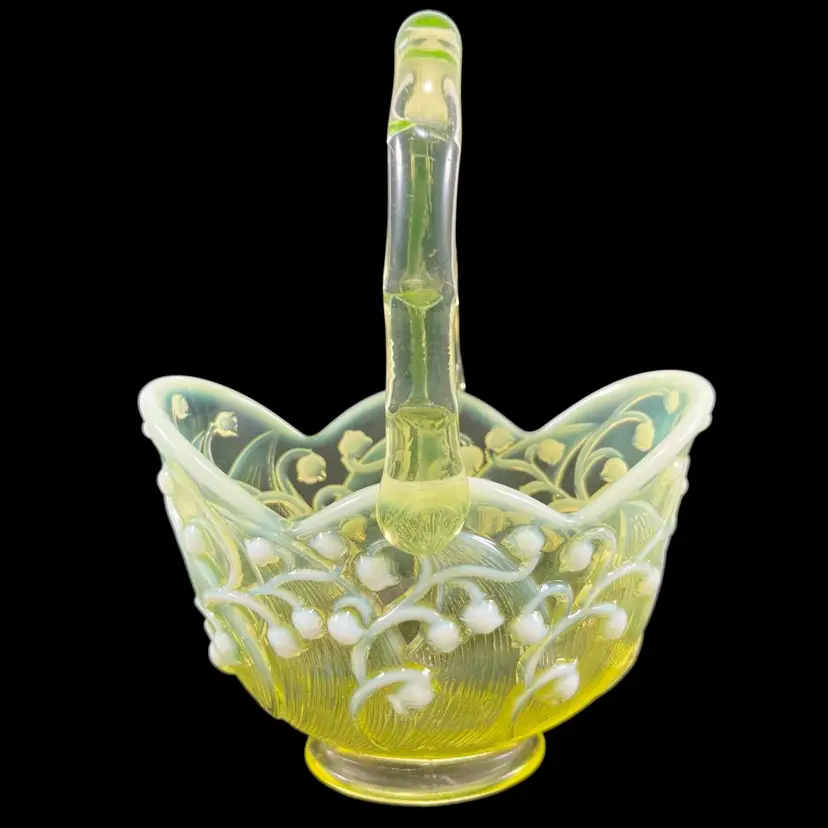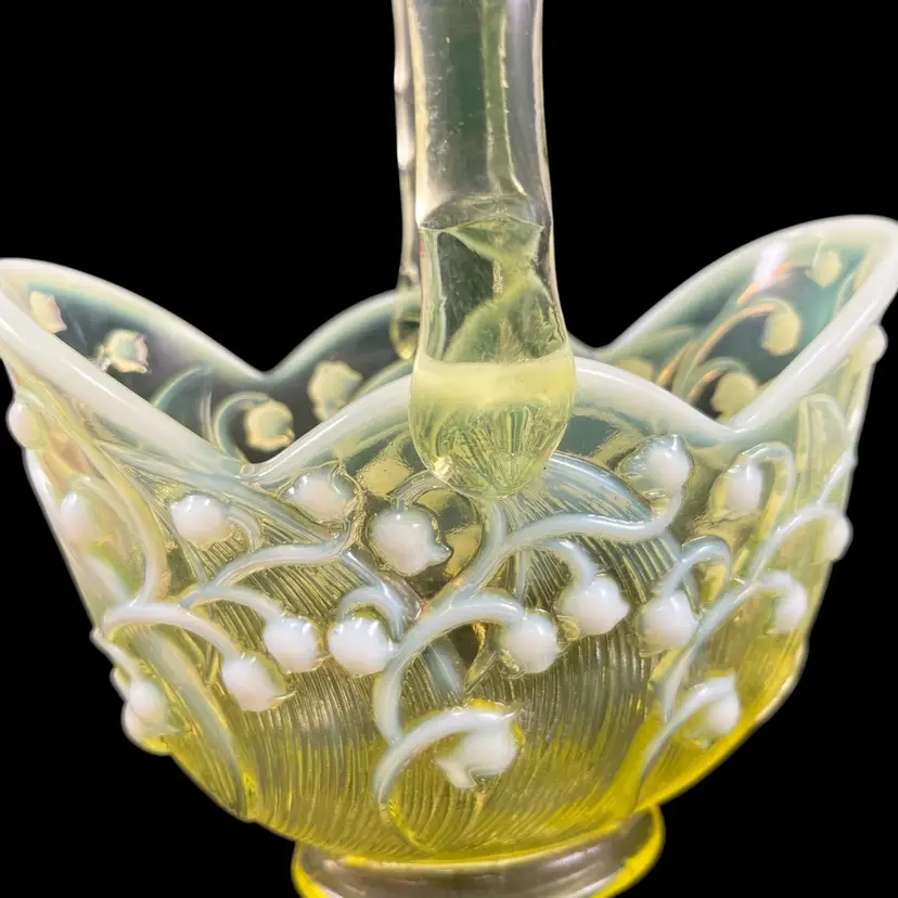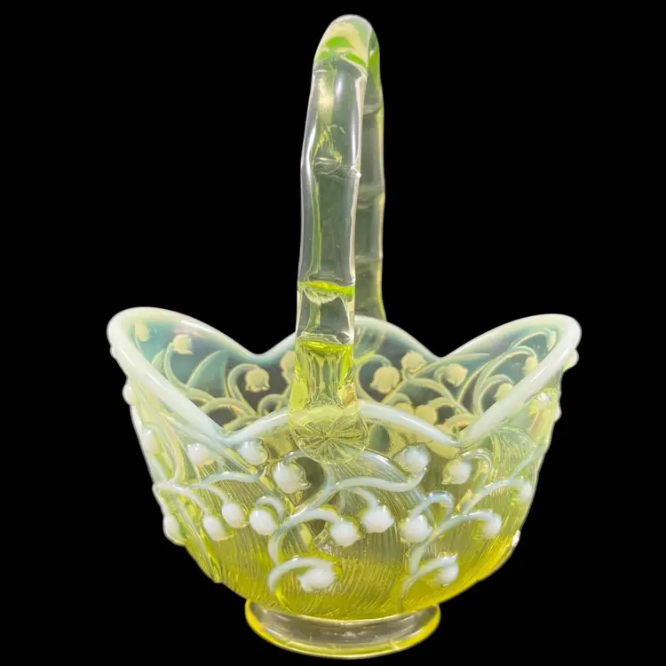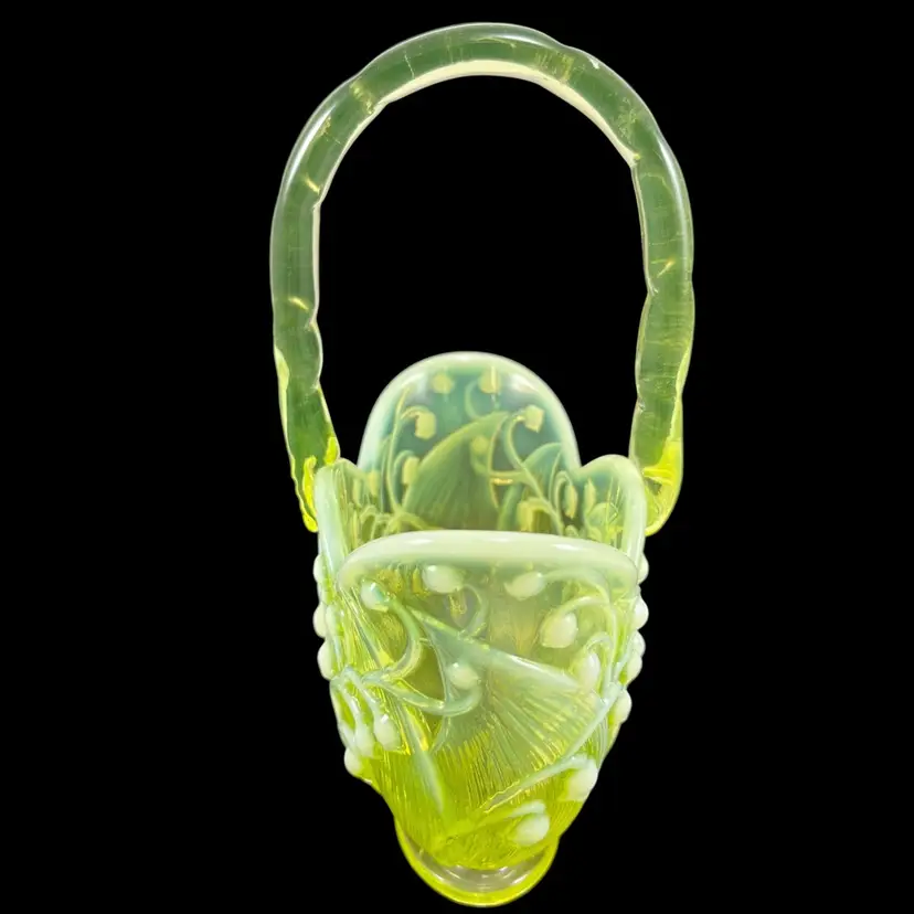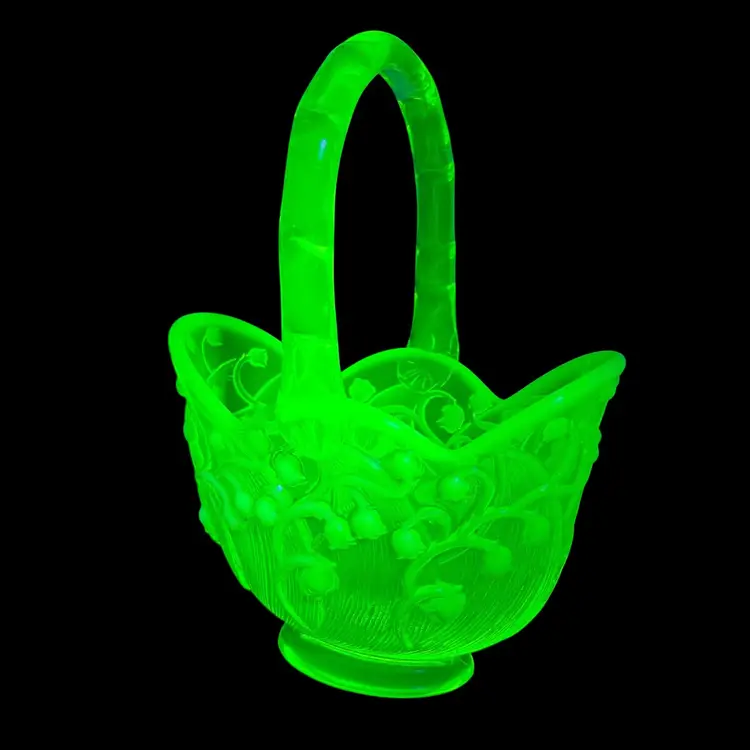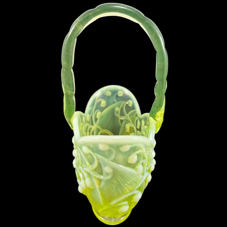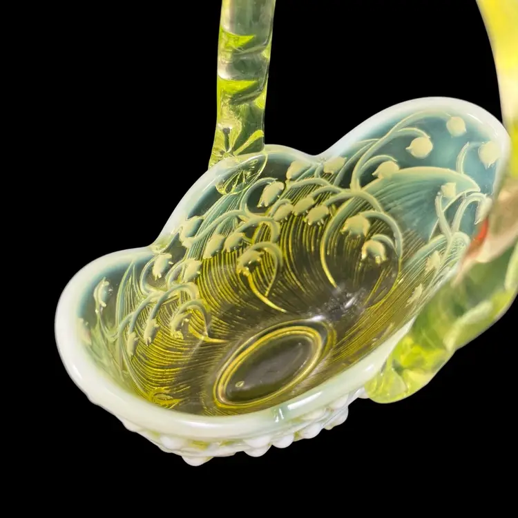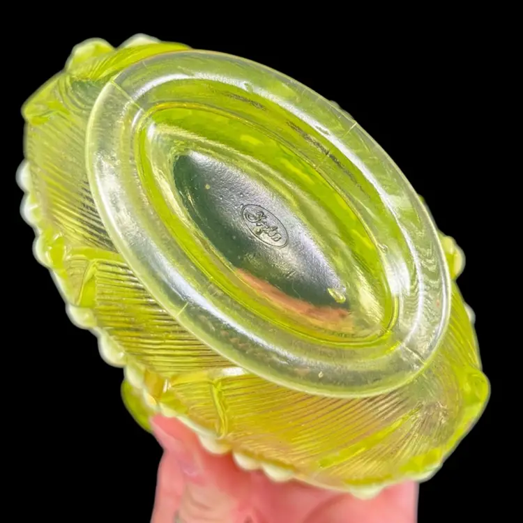 Approximately 5.75” x 3.75” x 8”. No chips or cracks. Glows under blacklight. Stamped Fenton on the bottom.