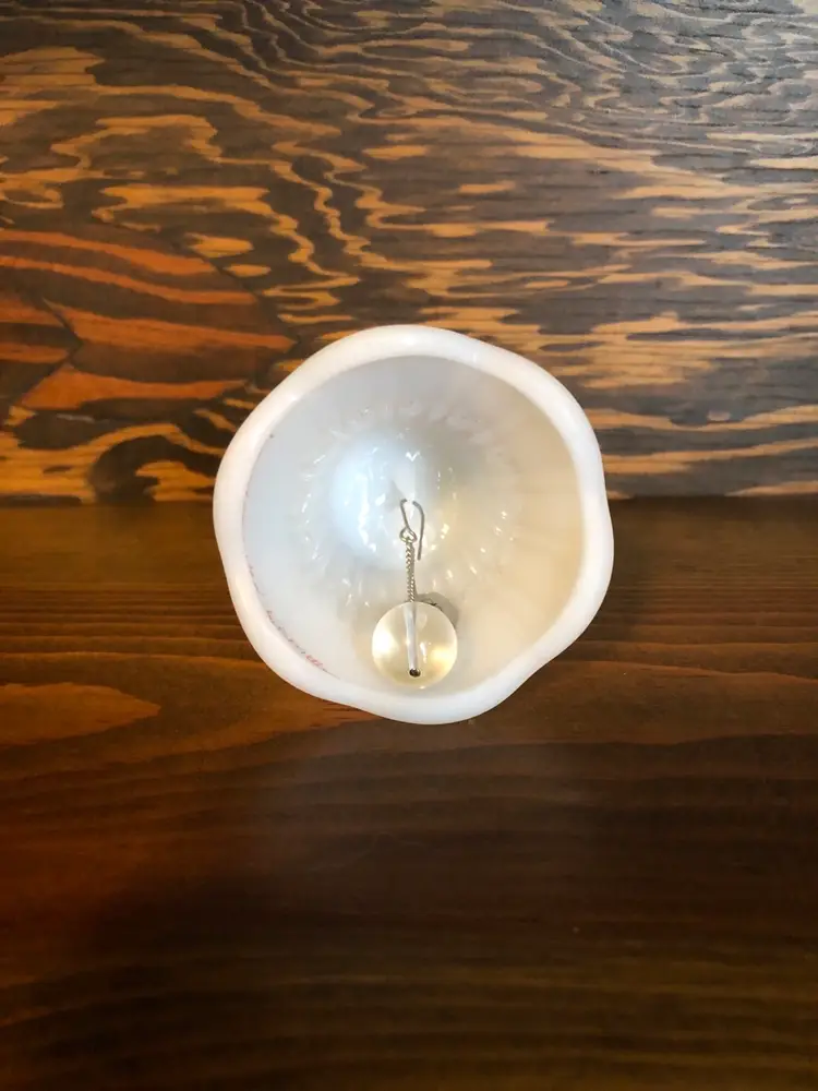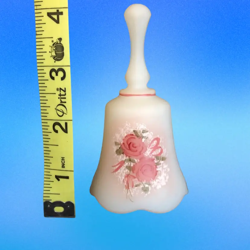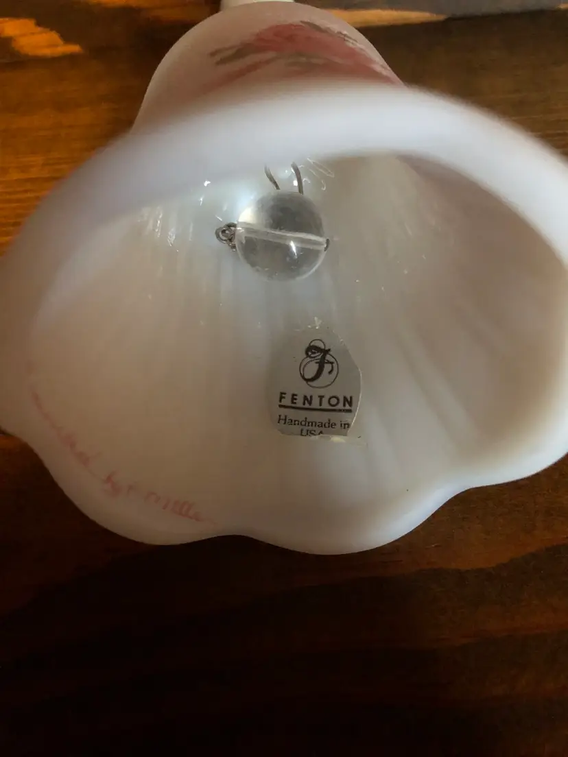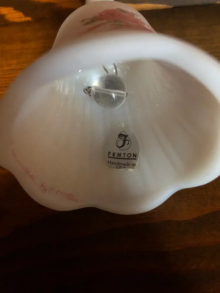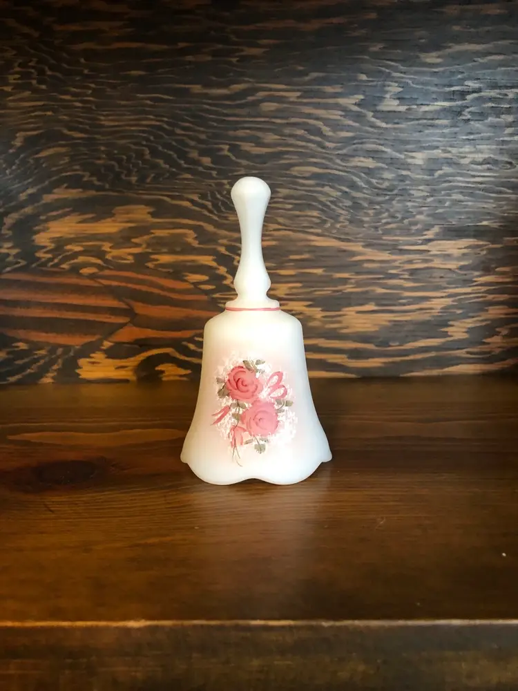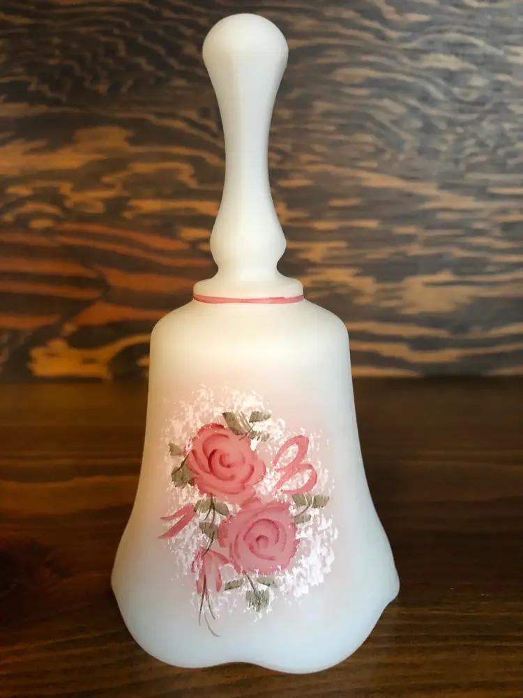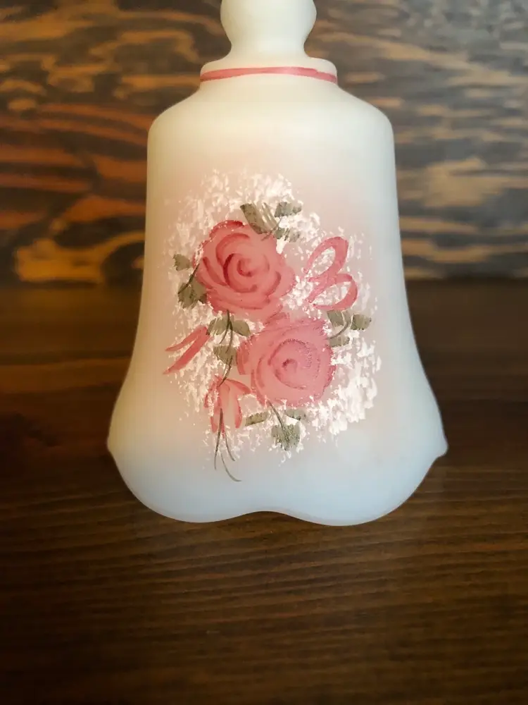 Fenton satin glass bell with pink roses. Signed “Hand Painted by P. Miller” Excellent used condition with no cracks, chips or repairs. Measures 4 inches tall (see pic)
