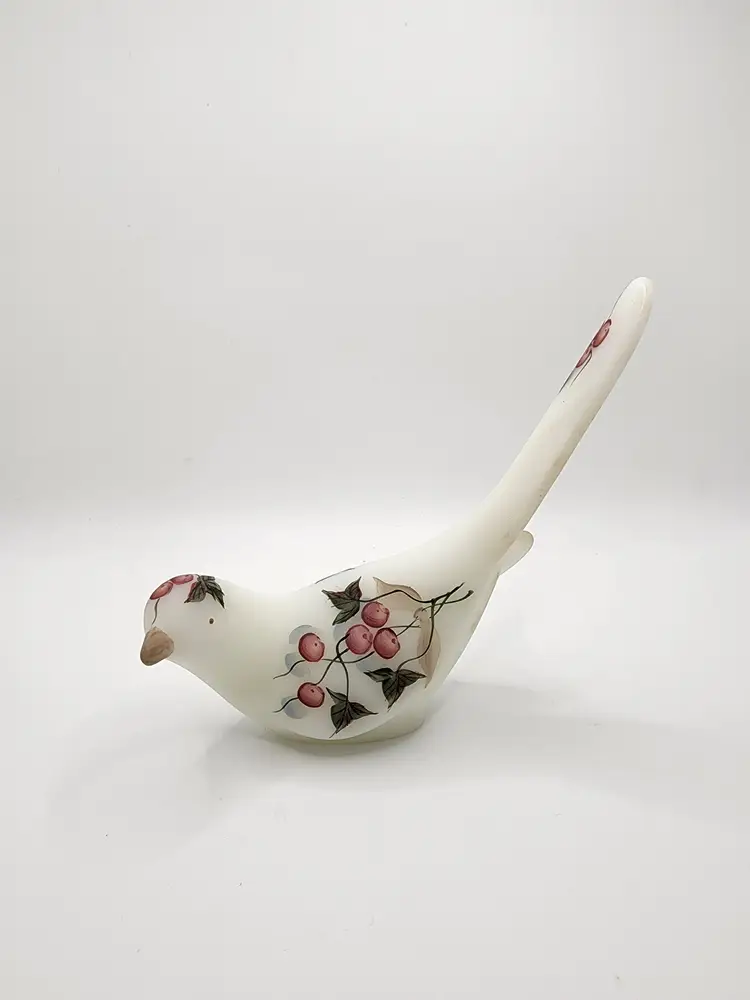Fenton happiness h.p bird with winter berries. Some sticker residue on back of the bird. I see no defects