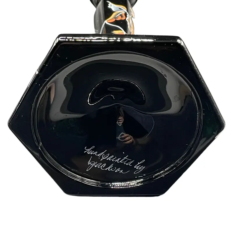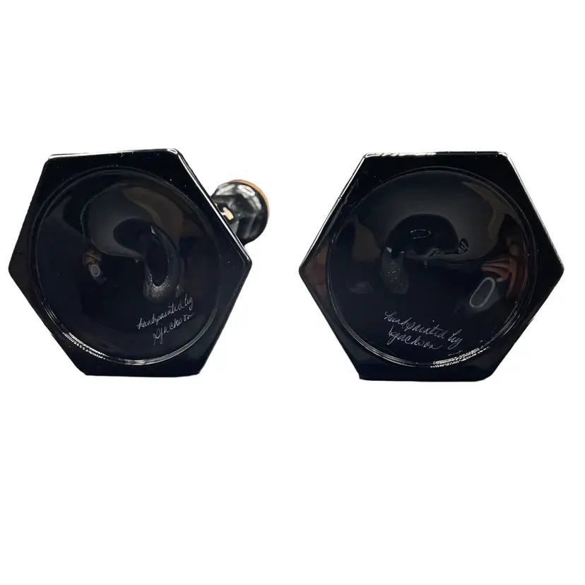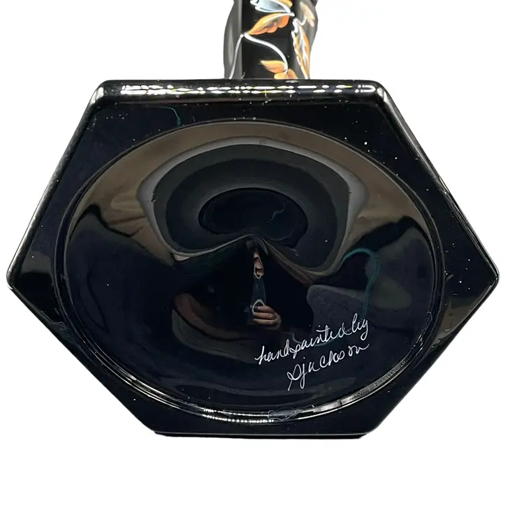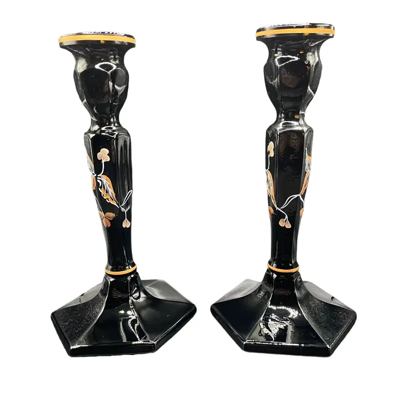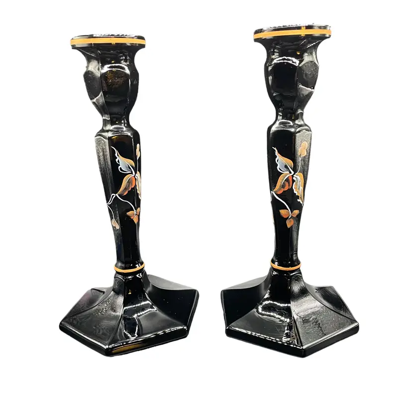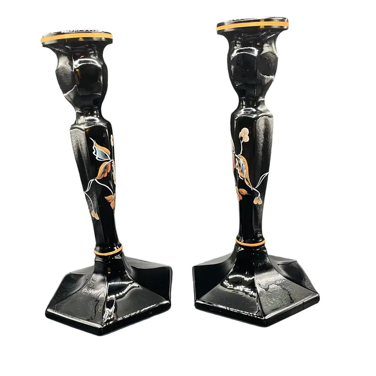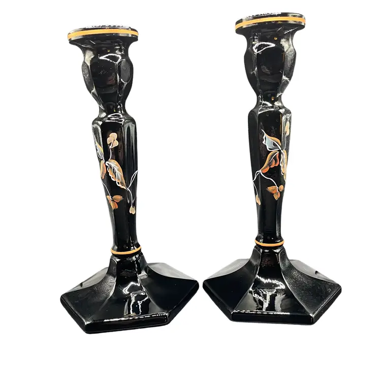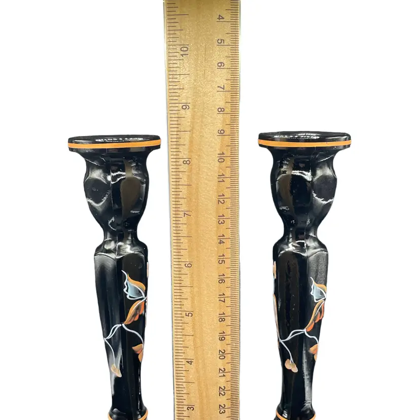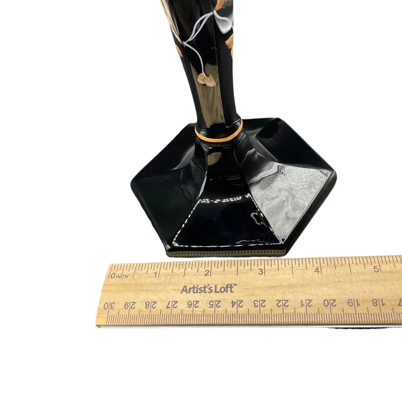 Add a touch of elegance to any occasion with these stunning Fenton candle holders. The intricate floral design is expertly hand painted by Sue Jackson, onto the sleek black glass, making each piece truly unique. These candle holders are perfect for all occasions and will complement any decor, making them a versatile addition to your collection. The Fenton brand is known for its quality craftsmanship and attention to detail, ensuring that you are purchasing a timeless piece that will be cherished for years to come. 8.5" H 4.5" W