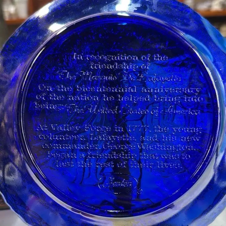 Fenton Blue Carnival Glass Plate Lafayette with Washington on Valley Forge