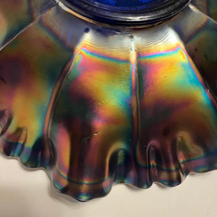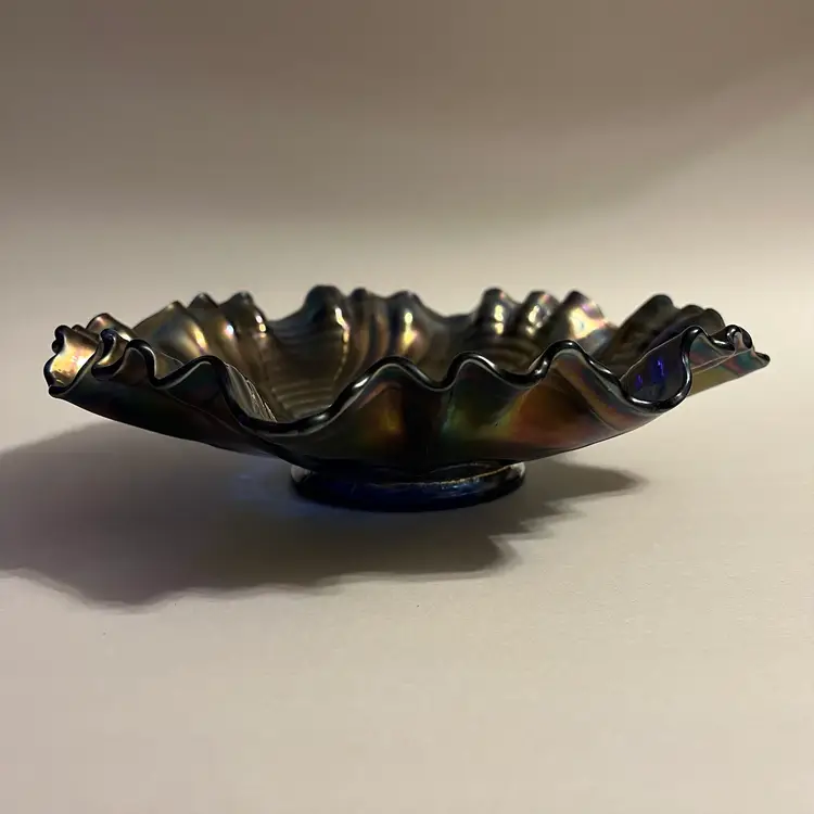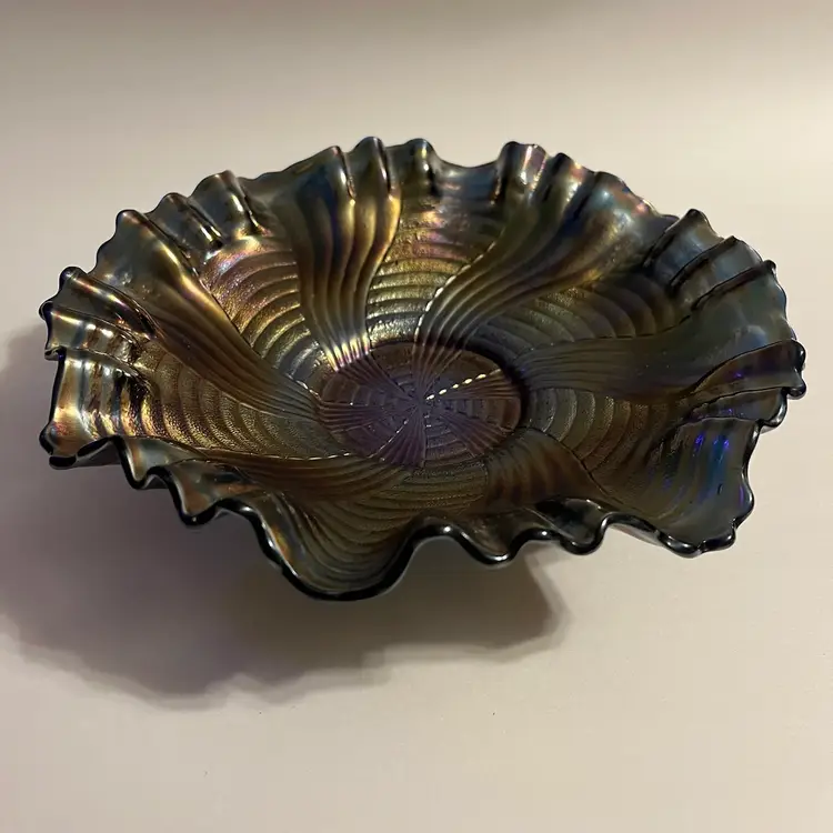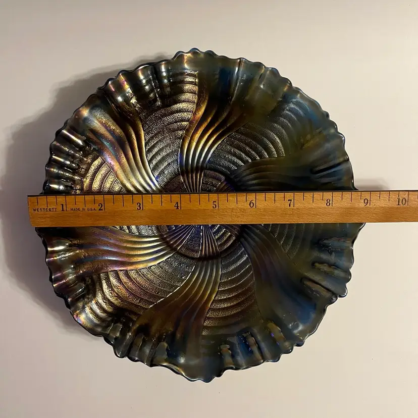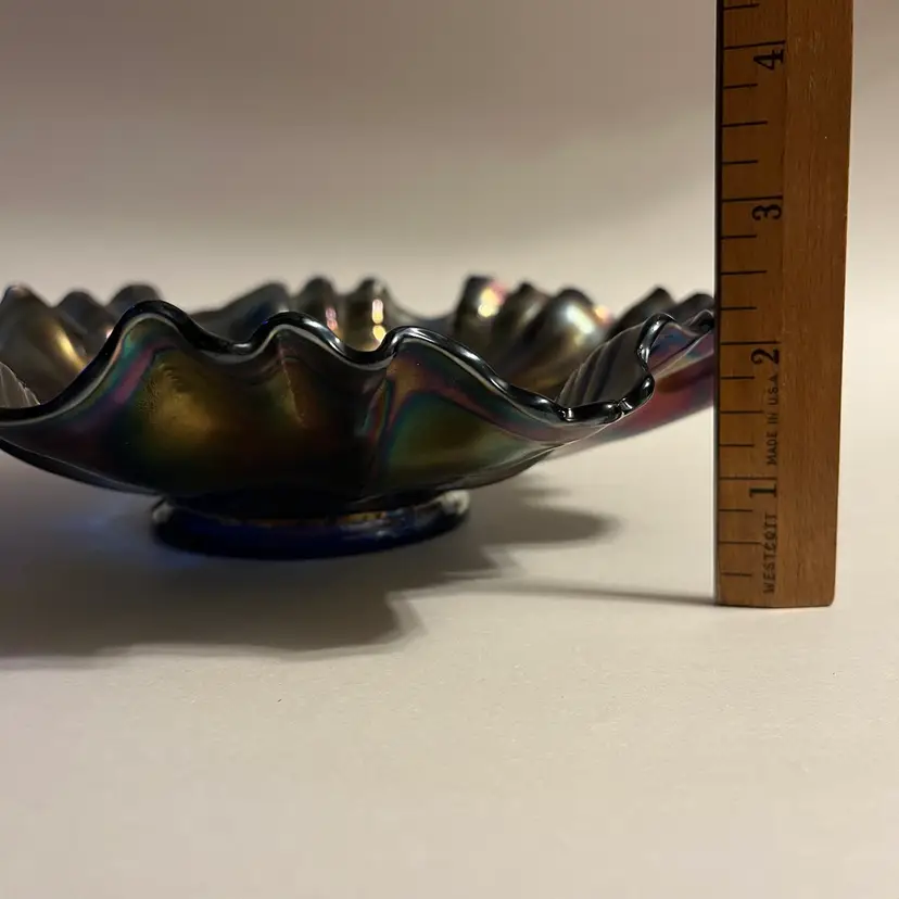 Lovely Fenton Blue Carnival Glass bowl, showcasing the Ribbon Tie (Comet)” pattern. Dating to circa 1911, this piece reflects the expressive experimentation of early American glassmakers, blending artistry and affordability in the spirited rise of carnival glass.