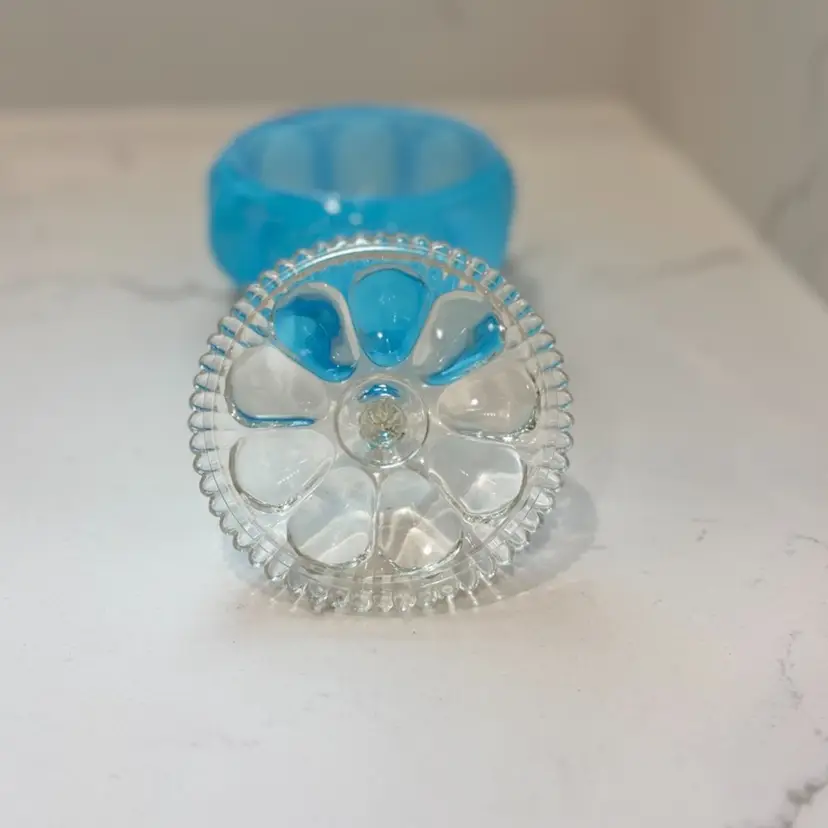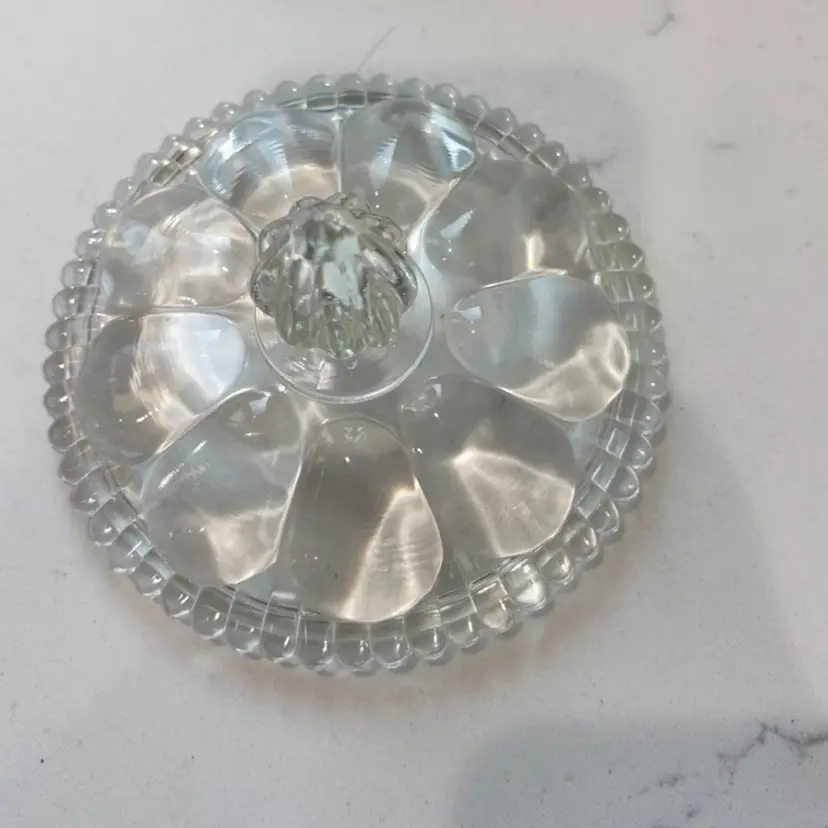 6” inc lid. 3.5” without lid. 4.5” diameter. Lid is clear glass. No chips cracks or repairs. Unsigned.