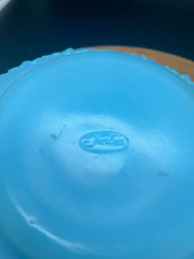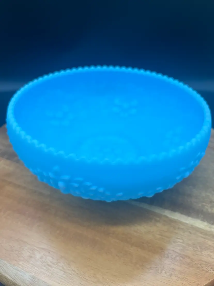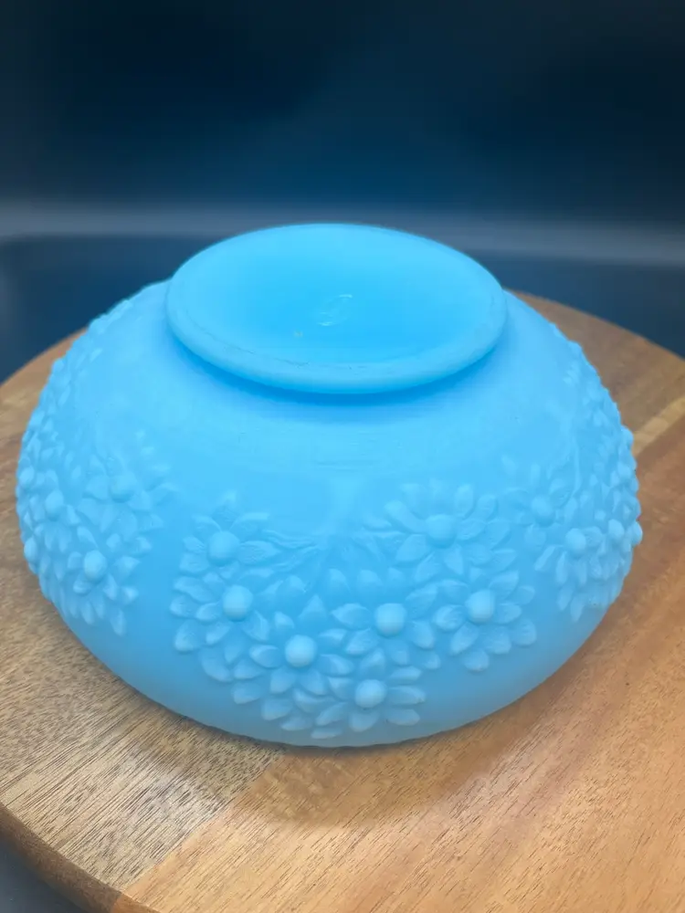 Fenton Blue Satin Glass Bowl, Cherry Chain and Orange Tree Pattern Mid-20th Century 8" wide, 3.5" tall Fenton mark on bottom Excellent condition, no chips or cracks noted, some minor discoloration on inside of bowl