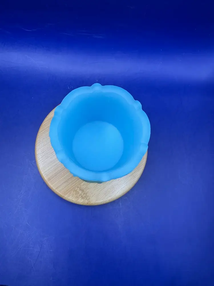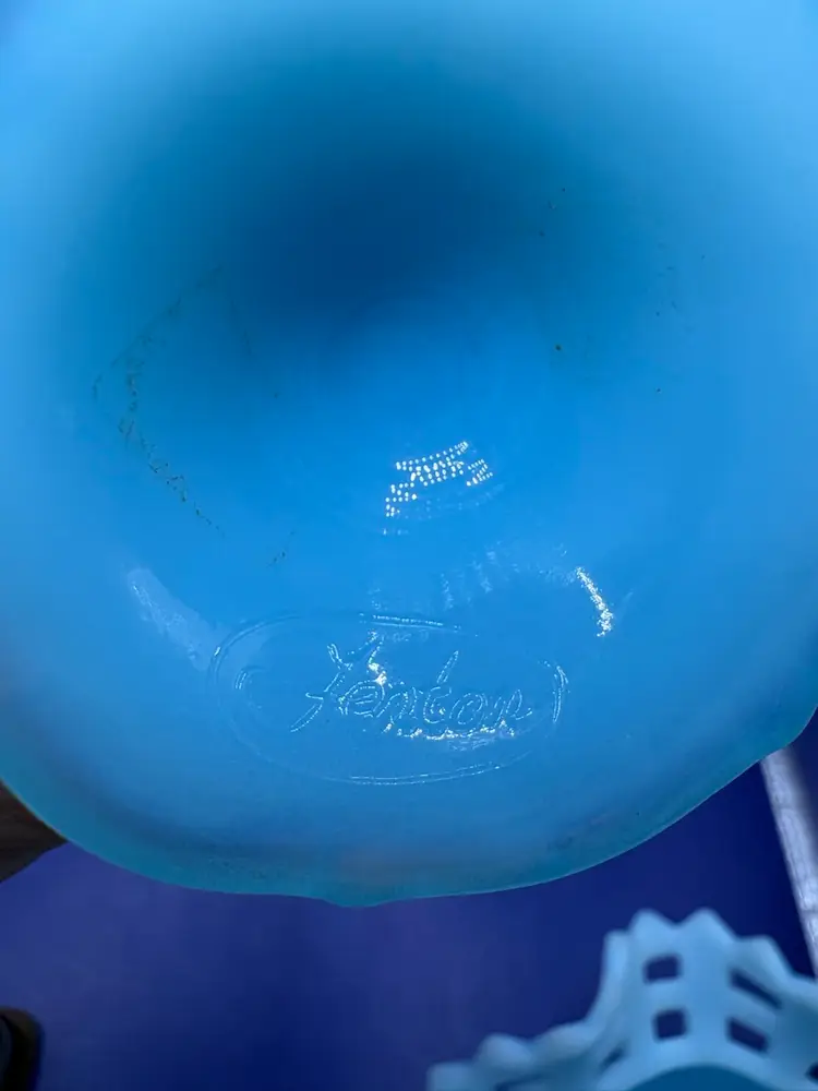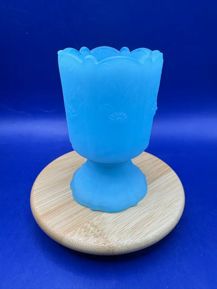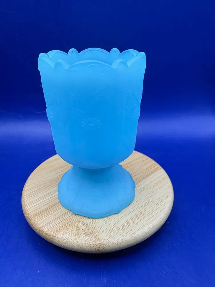 Fenton blue satin paneled toothpick holder Pattern is 6 panels of daises -1970s Scalloped base and wavy rim Measures 3 1/2 inches tall and 2 inches wide In excellent condition