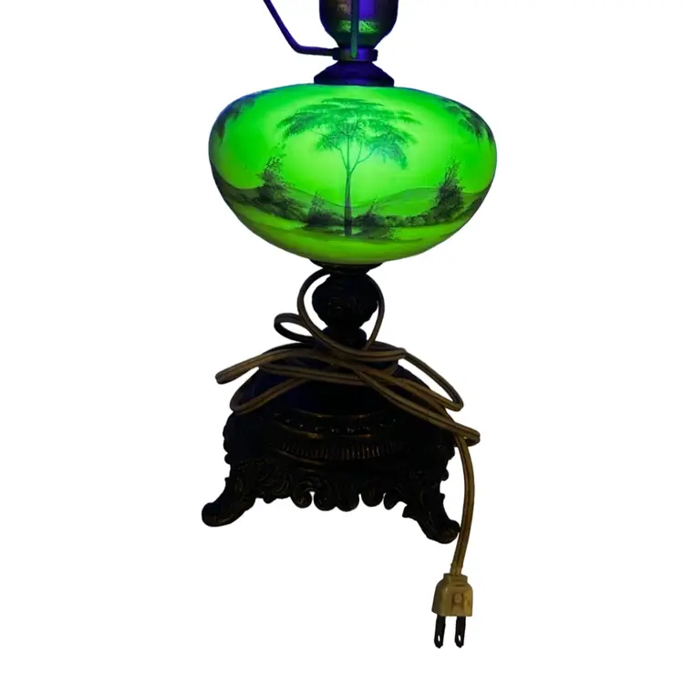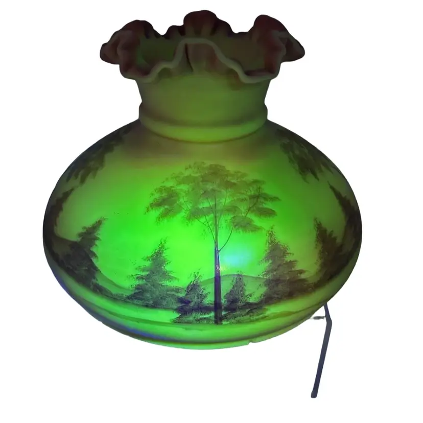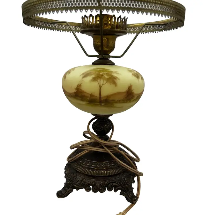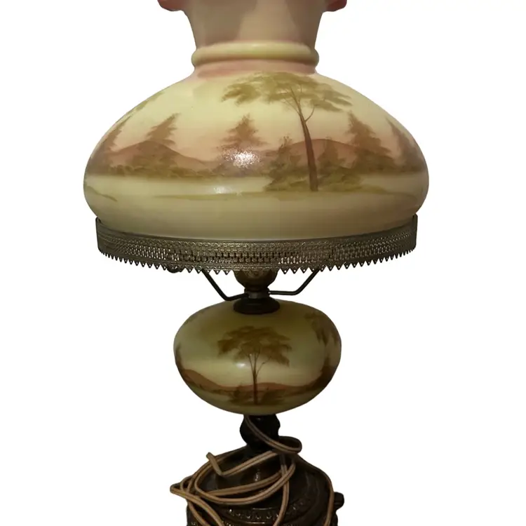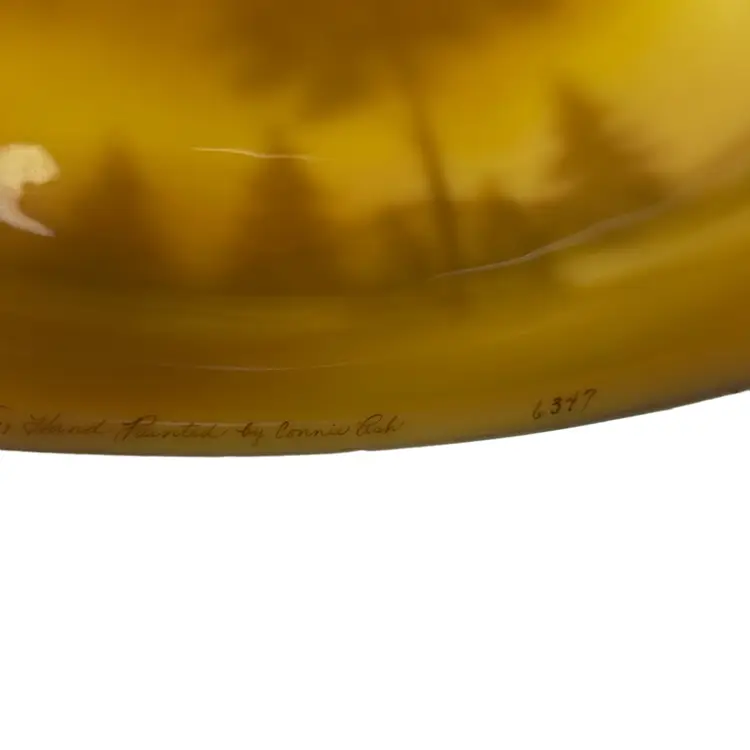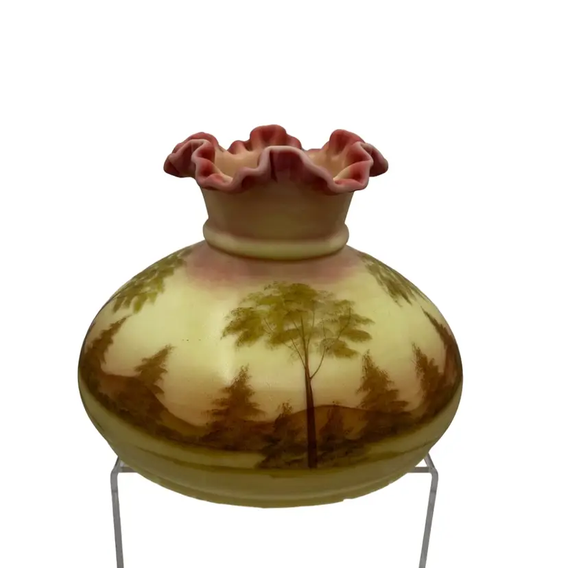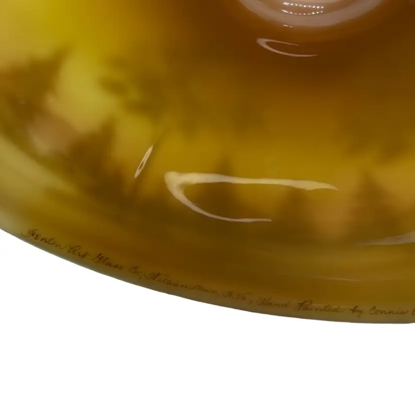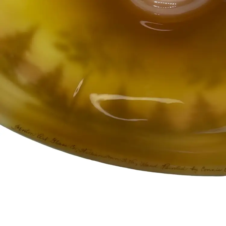 Signed. Inscription says “Fenton Art Glass Co., Williamstown, WV, handpainted by Connie Ash” chipping and fleabites on bottom of shade. See photos. Hurricane glass is missing. Cord is intact