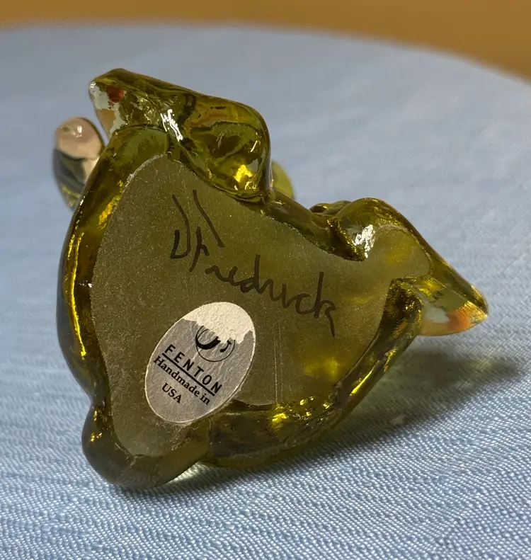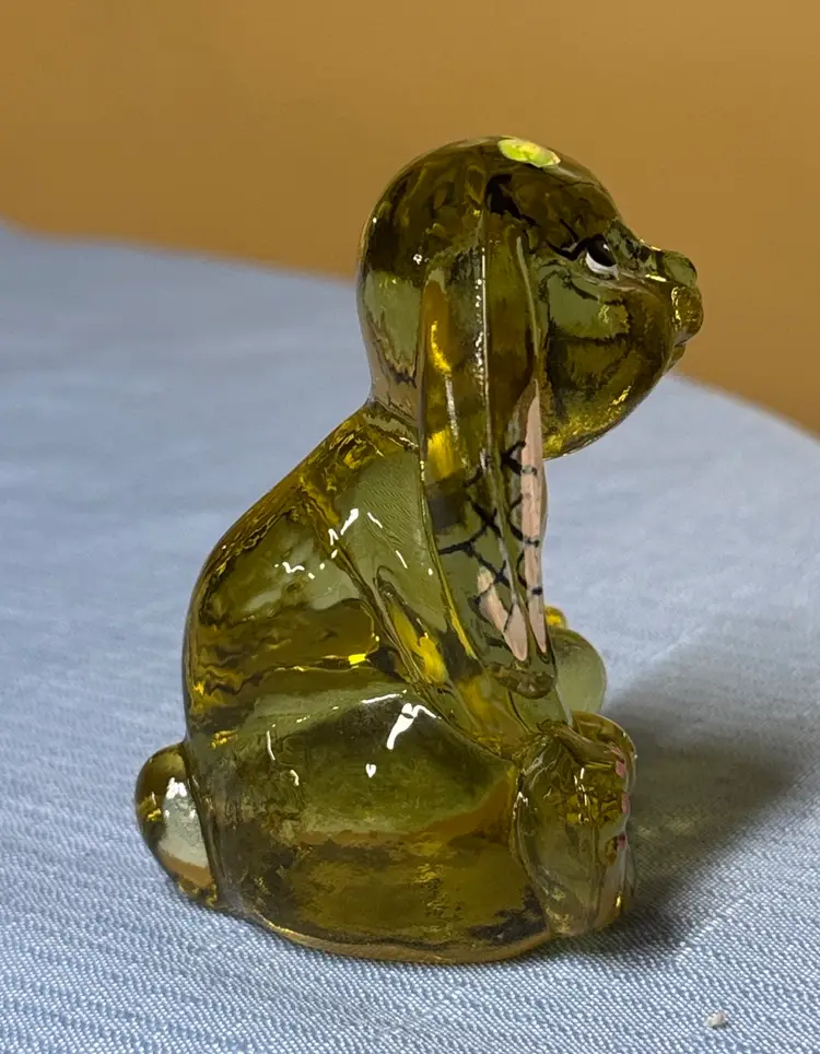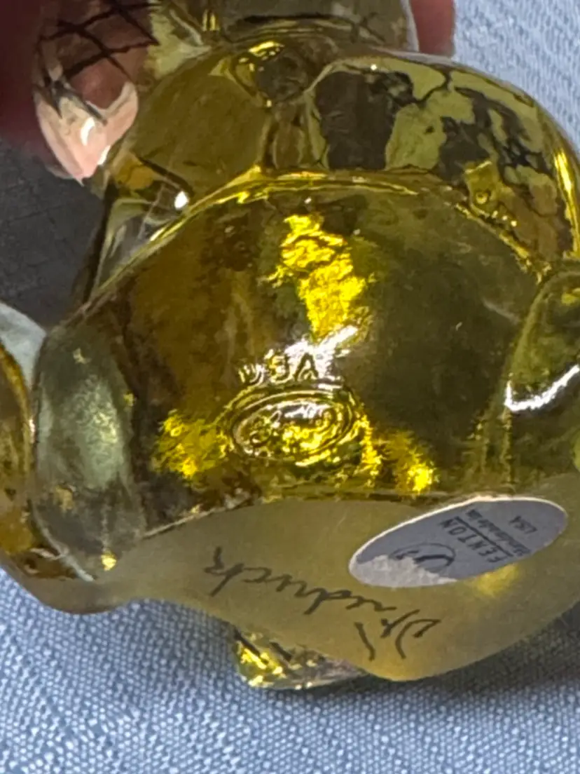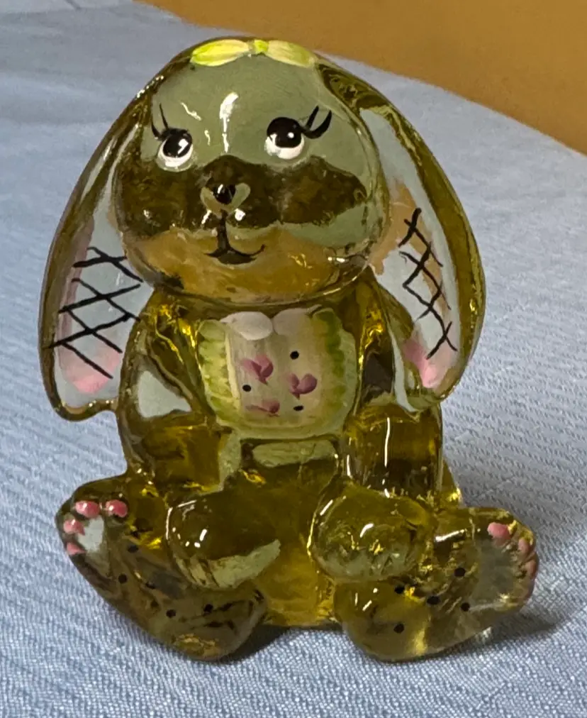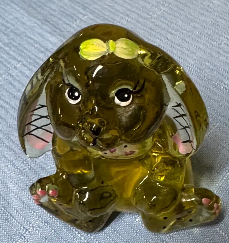 Elegant glass sitting bunny rabbit figurine by Fenton. Features a rich yellow hue. Fenton Buttercup Lop Eared Bunny, a handcrafted glass collectible produced by the Fenton Art Glass Company. Design: Part of the Fenton Inspirations series, this specific model features hand-painted floral motifs and a bunny with floppy ears. Dimensions: It stands approximately 3.5 inches tall artist-signed on the base with original sticker Excellent condition with no breaks scratches or chips (2112242630)