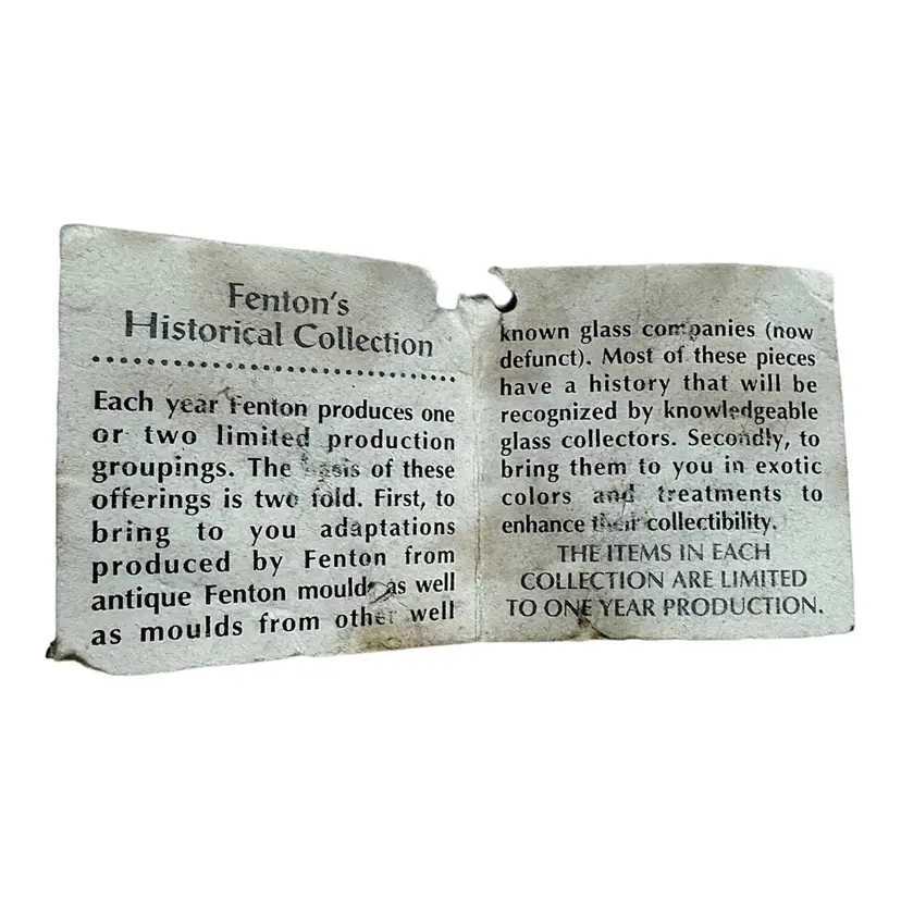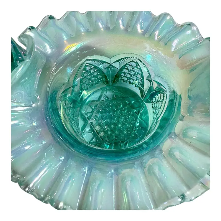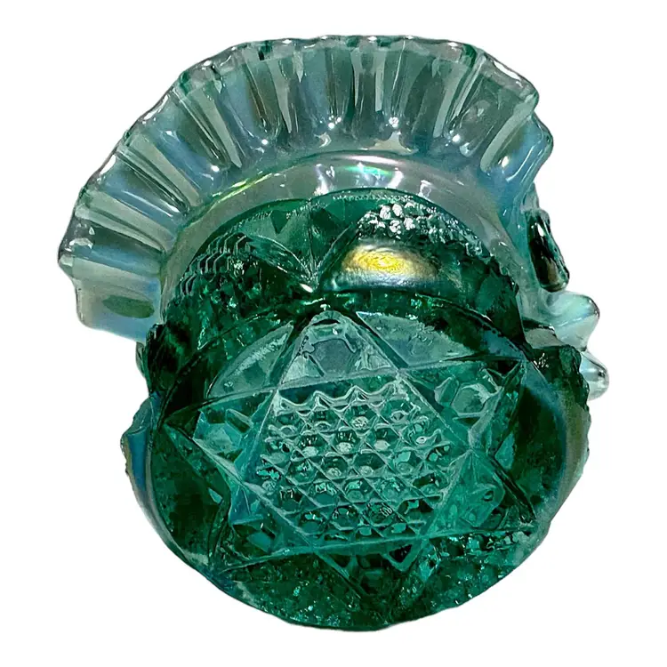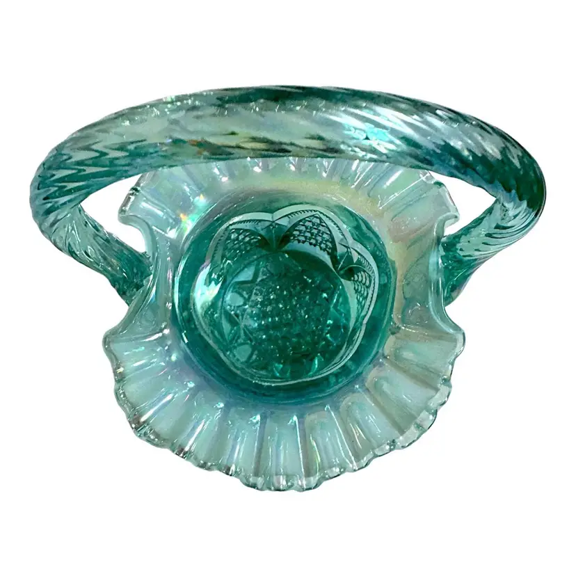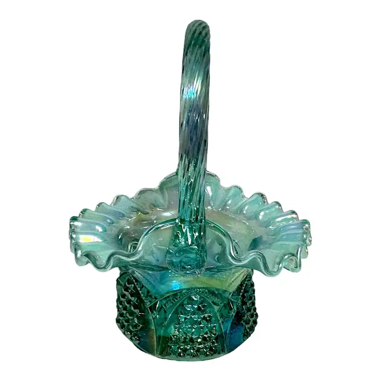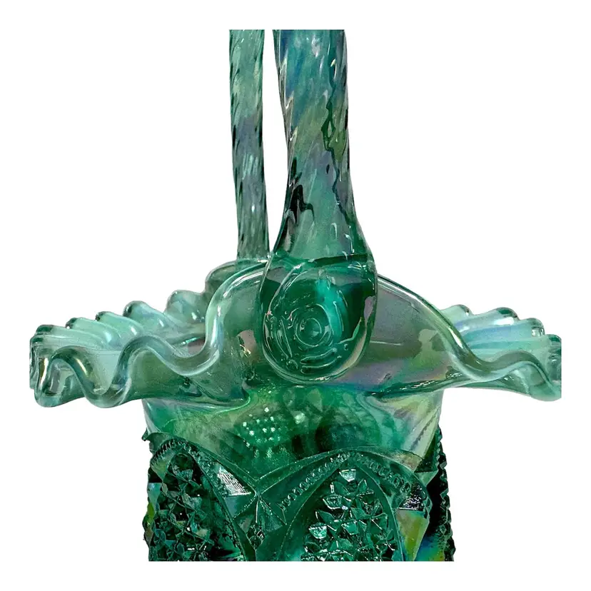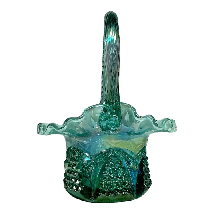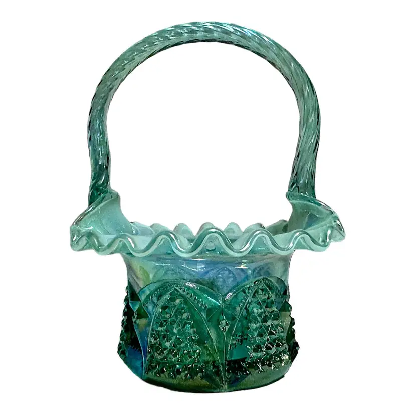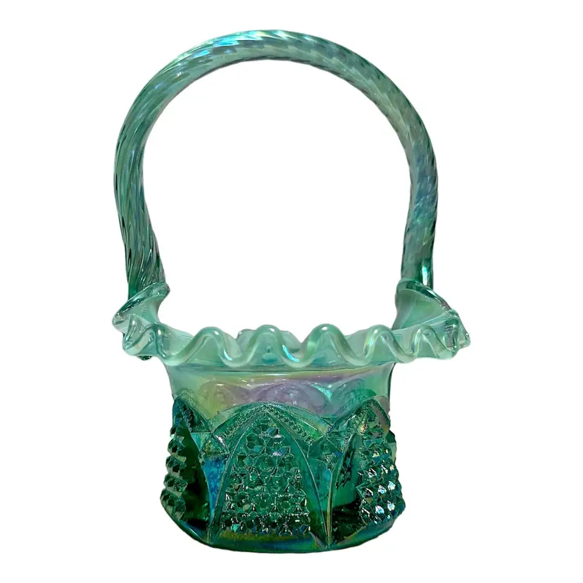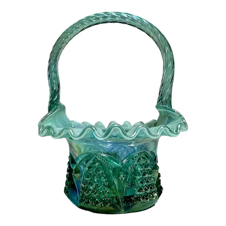 Fenton Sea Mist Green Opalescent Carnival Glass Basket Button And Arch Pattern Part Of The Historical Collection Made In The 1990s Has Original Hang Tag But Tag Is In Poor Condition Basket Size : 6.5 x 5.25