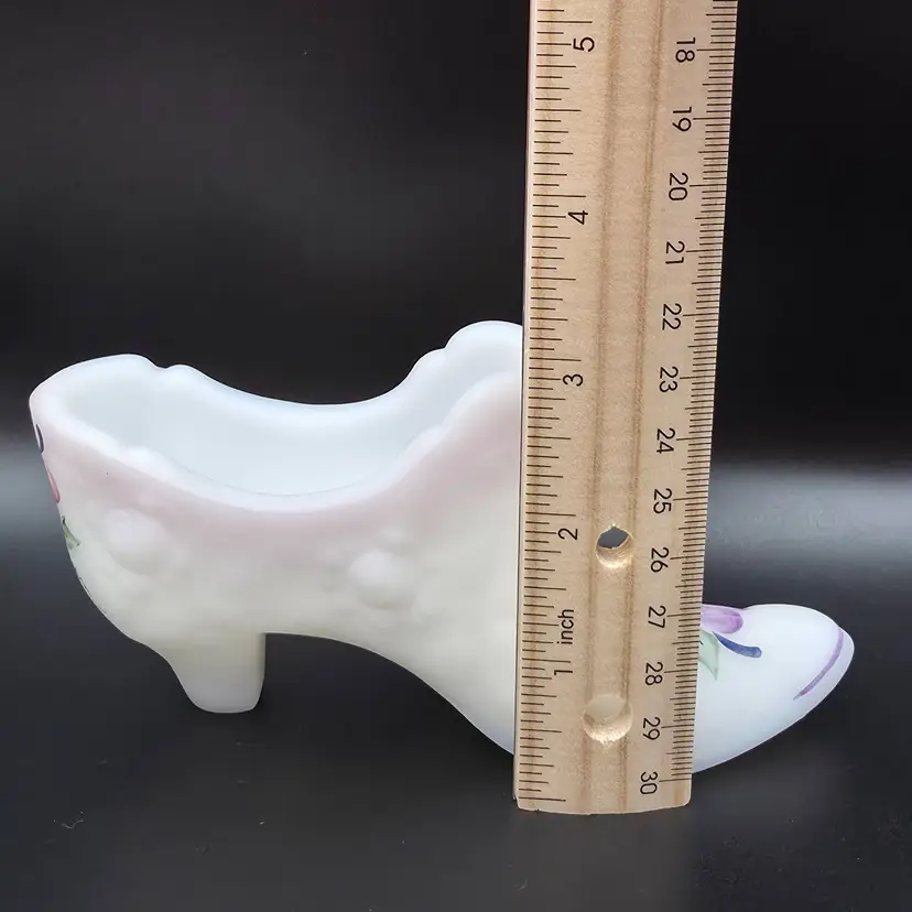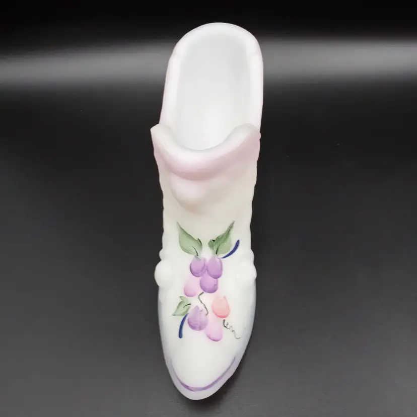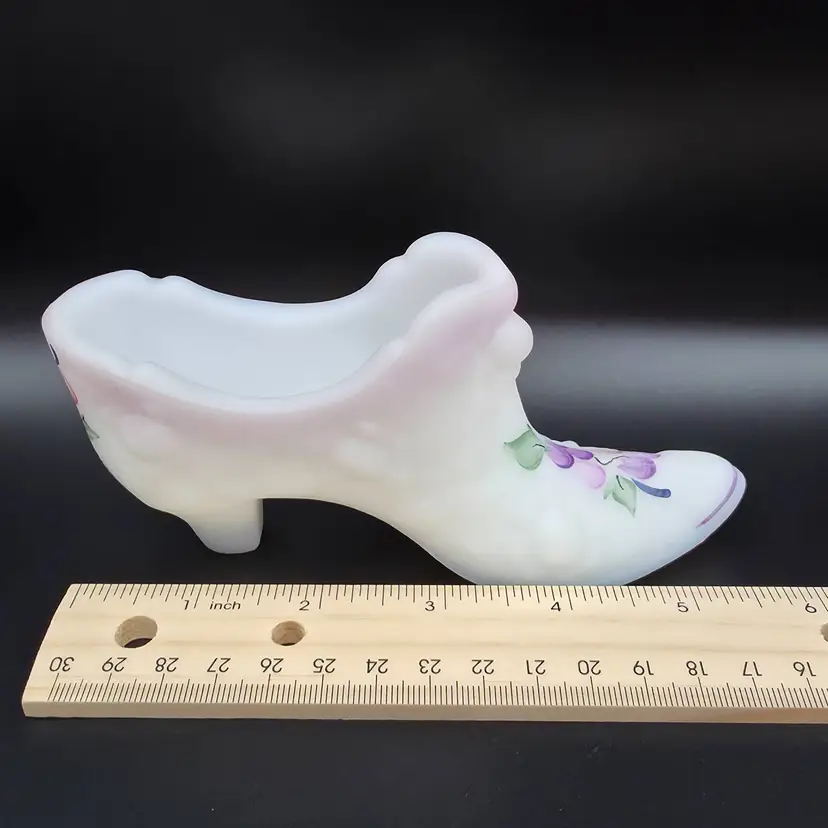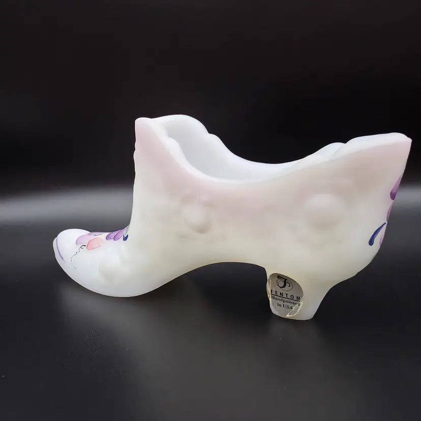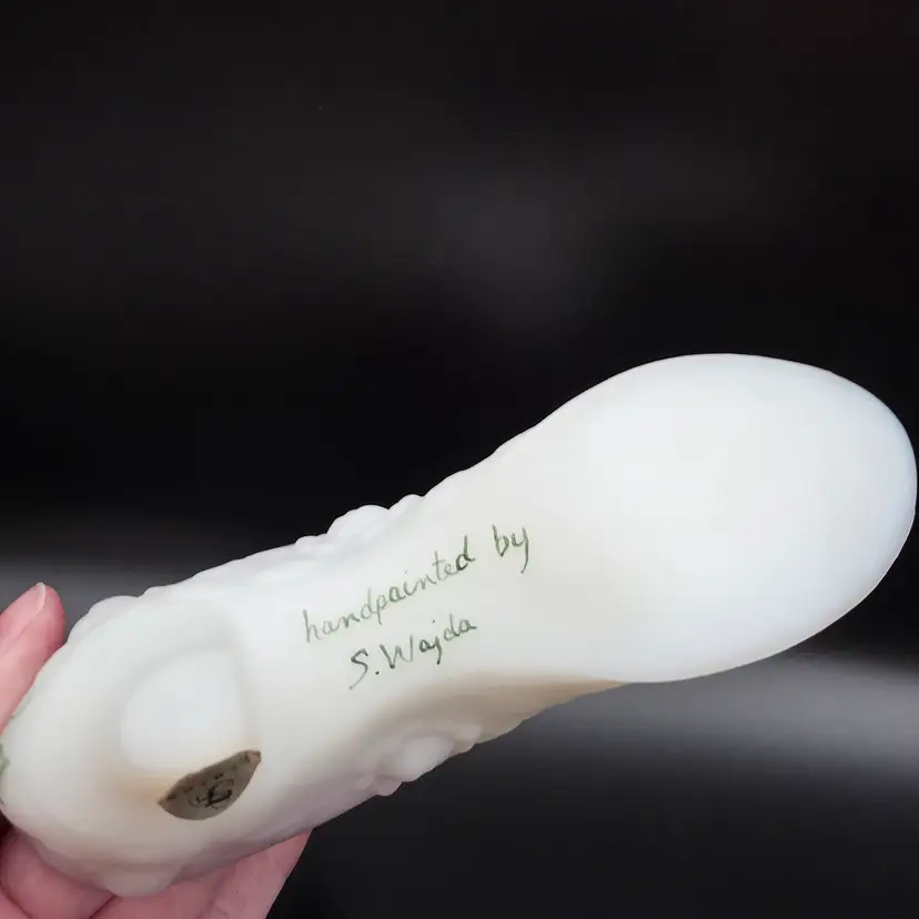 Beautiful Fenton glass shoe with original sticker and artists signature S.Wajda (Stuart Wajda) is from early 2000s. It is in excellent condition, no chips or cracks and no wear on the paint. Measures 5.5 inches long and 3 inches tall. Thank you for looking and have a great day!