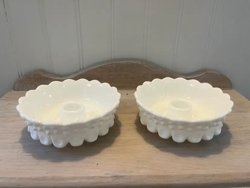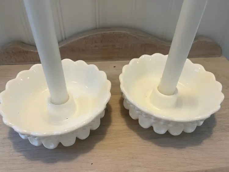 Pair of vintage Fenton Hobnail milk glass taper candle holders.