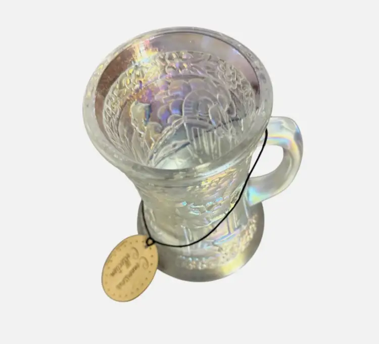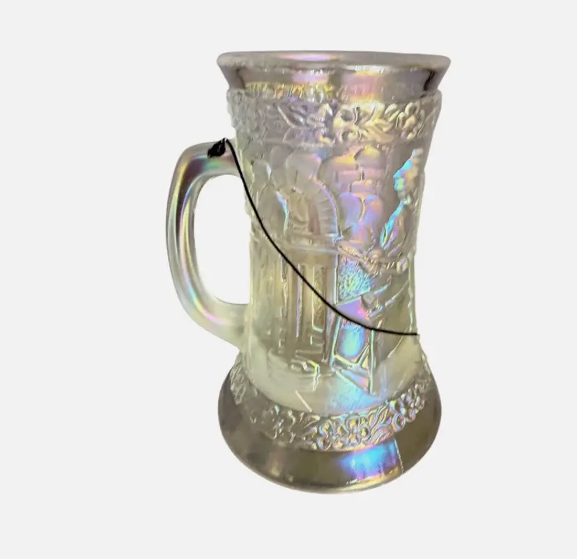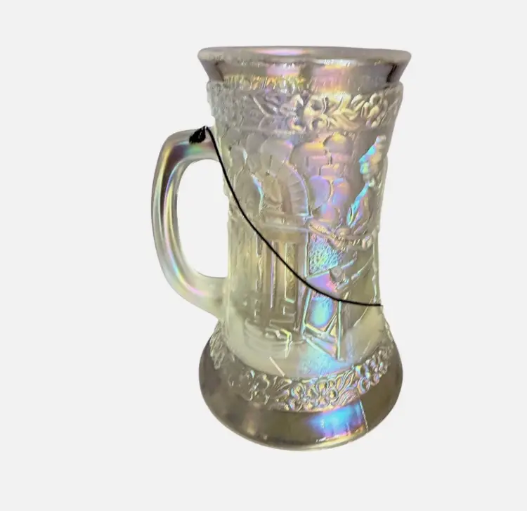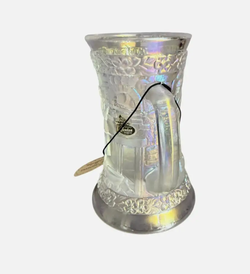 Fenton Connoisseur Collection Carnival Glass Blacksmith Glass Blower Tankard Mug, limited edition #29 of only 1,500 made. This stunning piece features the classic raised “Village Blacksmith” scene with a blacksmith at work, arched brick details, tools, and floral bands at the rim and base.