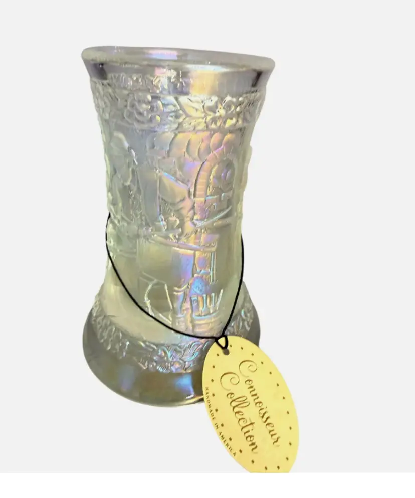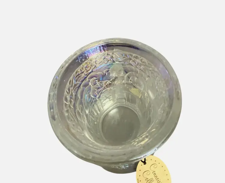 Finished in Fenton’s beautiful iridescent carnival glass, the surface displays vibrant rainbow hues that change with the light. This example still retains its original Fenton factory label and Connoisseur Collection hang tag, confirming authenticity and limited-edition status.