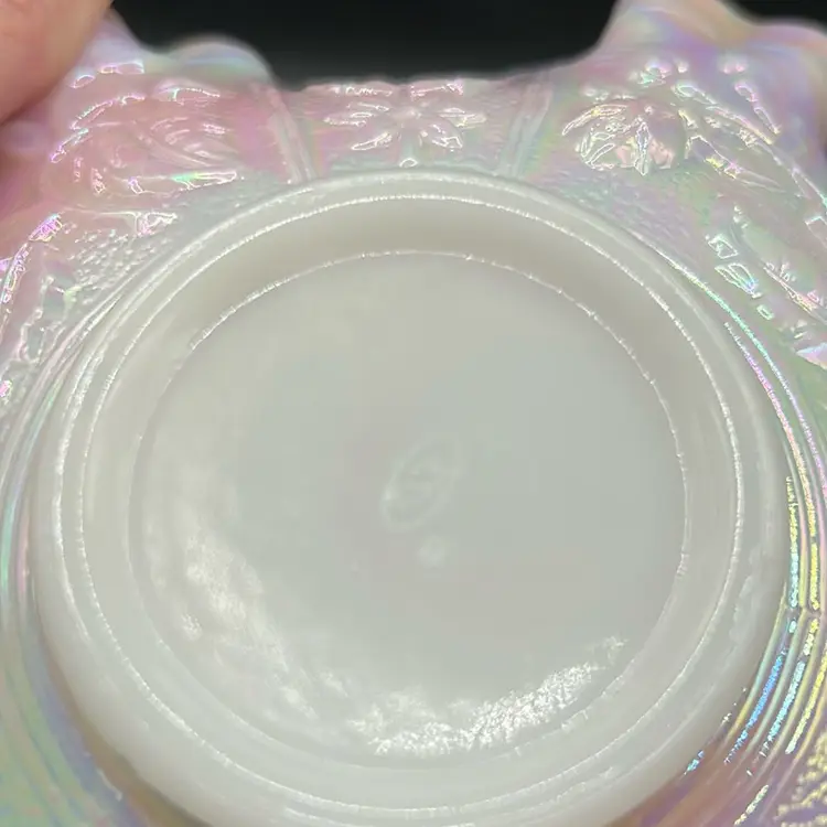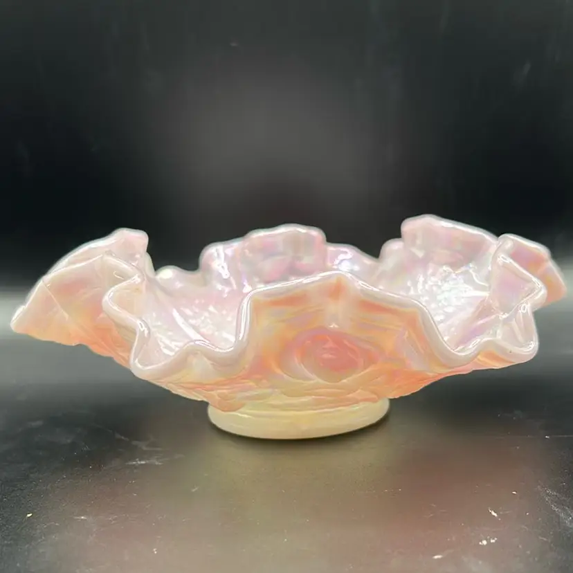 This item is a Fenton lilac purple carnival glass ruffle bowl and is a rare piece from the 1990s. It has the iridescent carnival glass finish and features a raffle design. It stands 2 inches tall and is 6 inches across there are no chips or cracks.