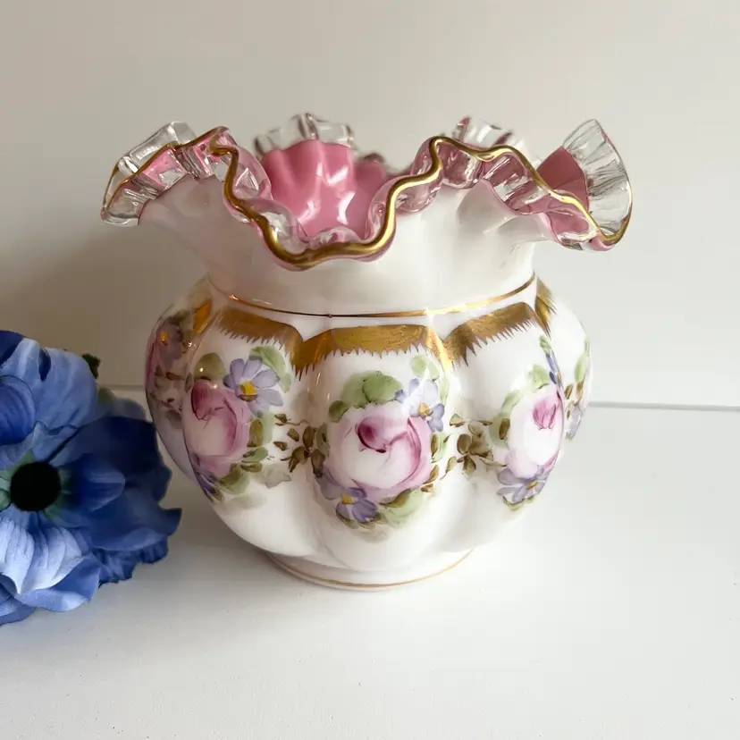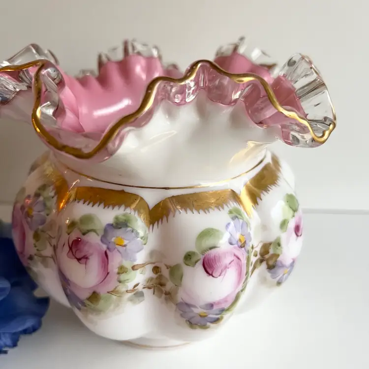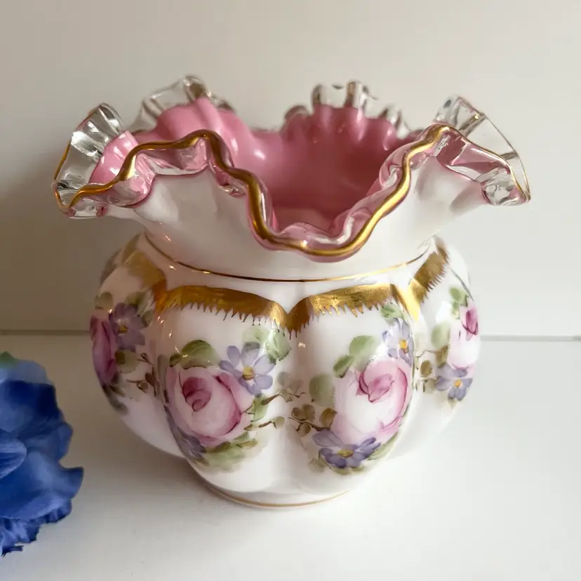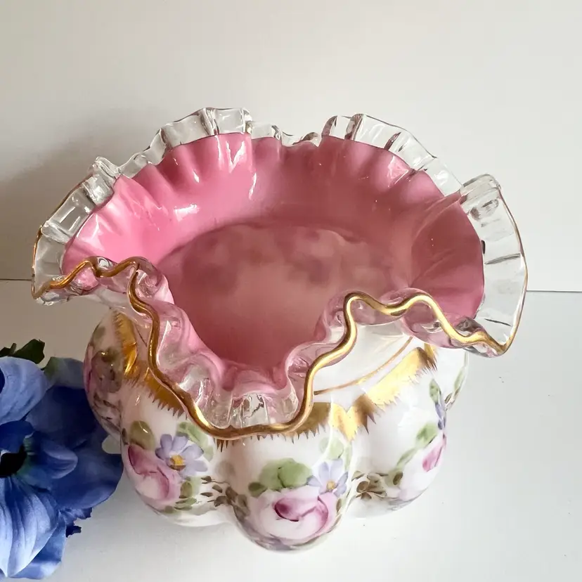This absolutely gorgeous pink lined Fenton vase from the Charleton collection (1950s) would make a very beautiful statement. It is in fabulous condition and would be a great addition to a Fenton Collection 5 1/4” x 6 1/2”. Ships from Canada.