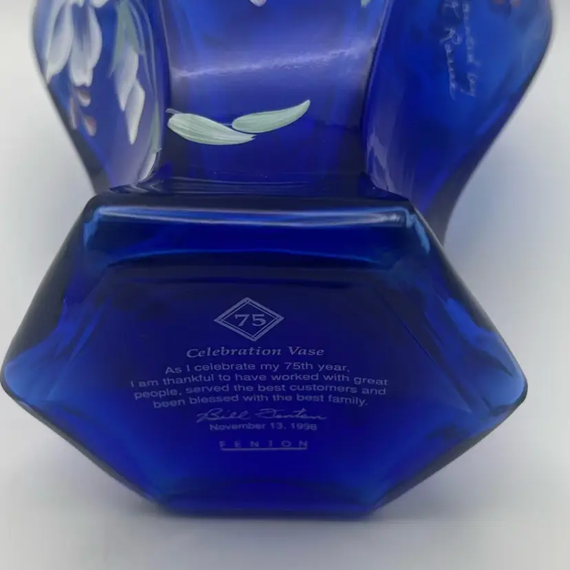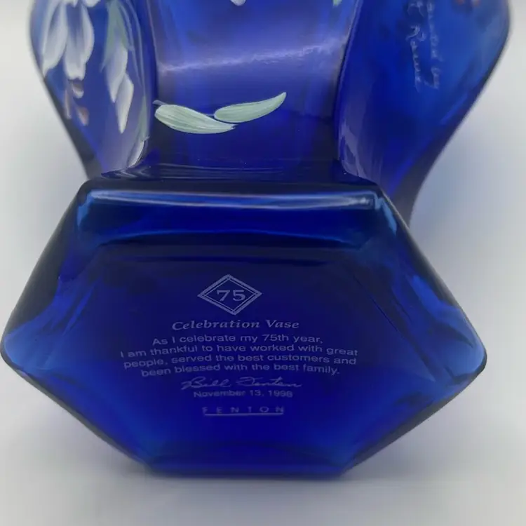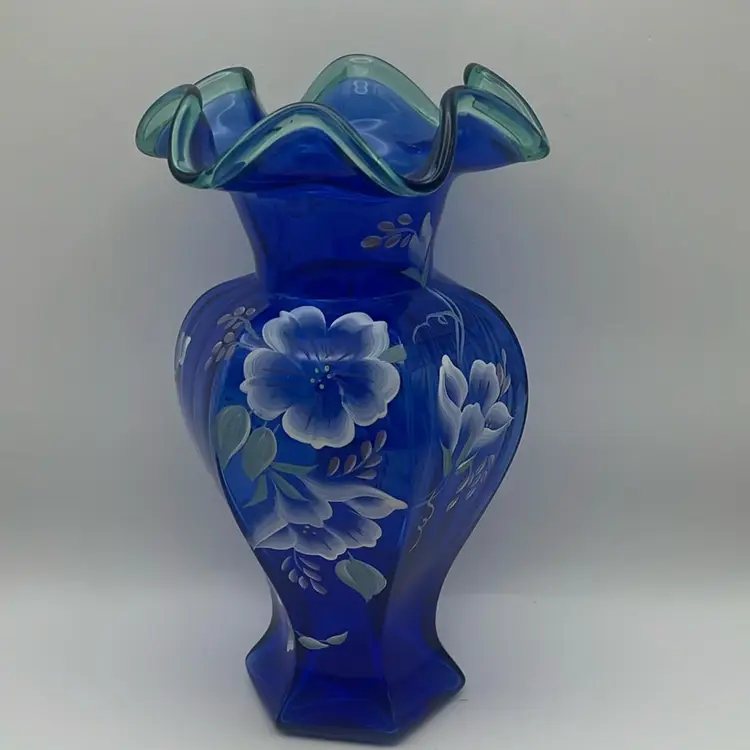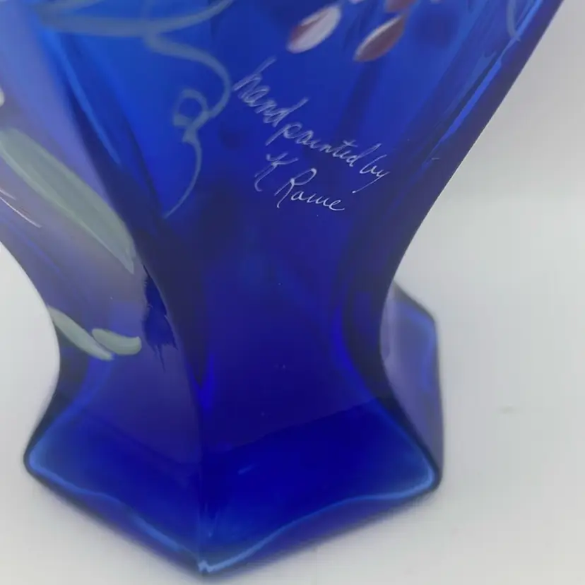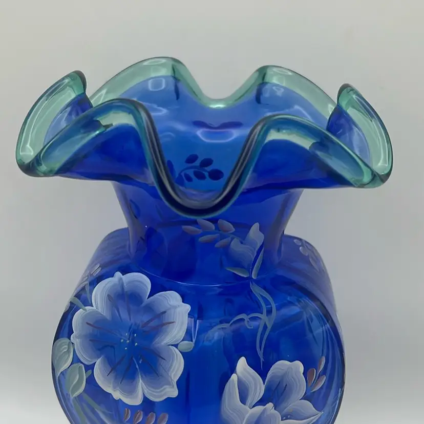 Signed by Bill Fenton and hand painted and signed by K. Rowe, 1998, green ruffled rim with gorgeous hand painted flowers, mint condition!