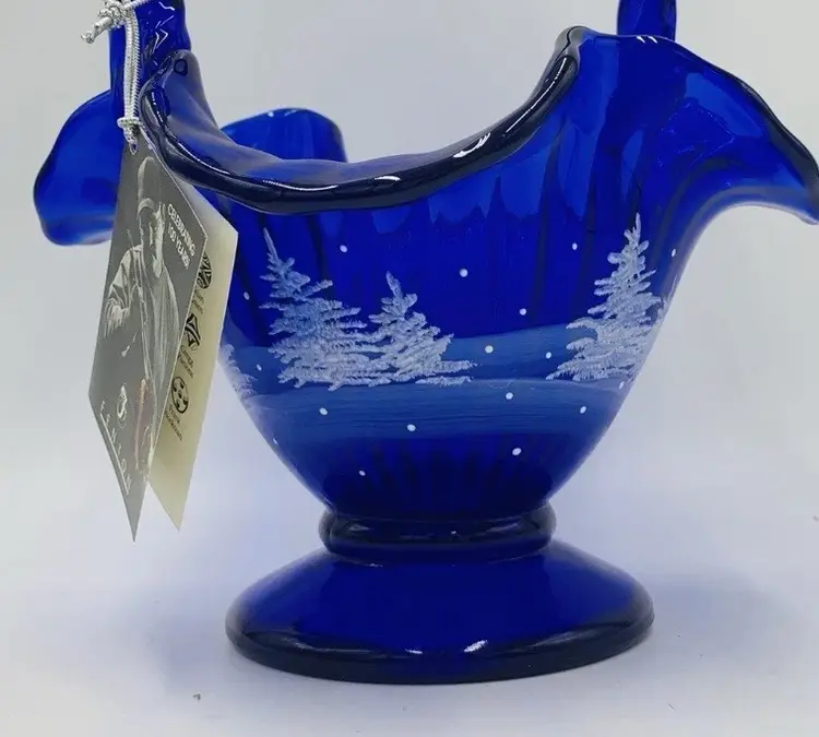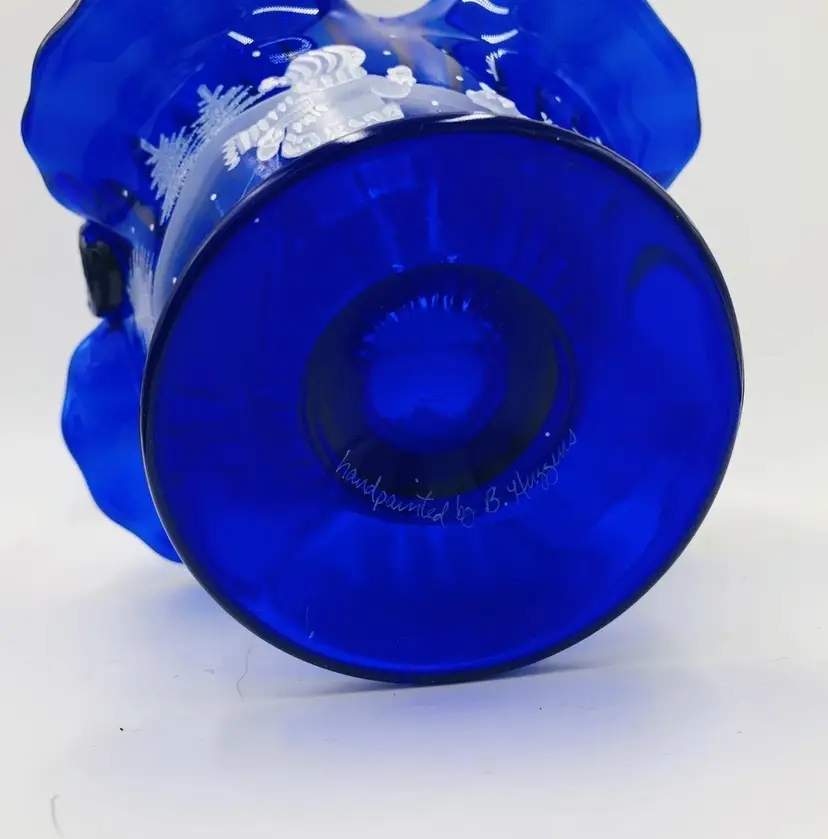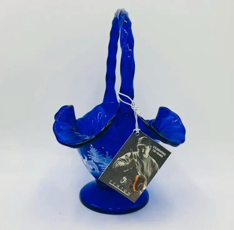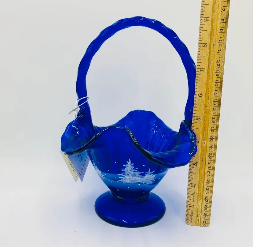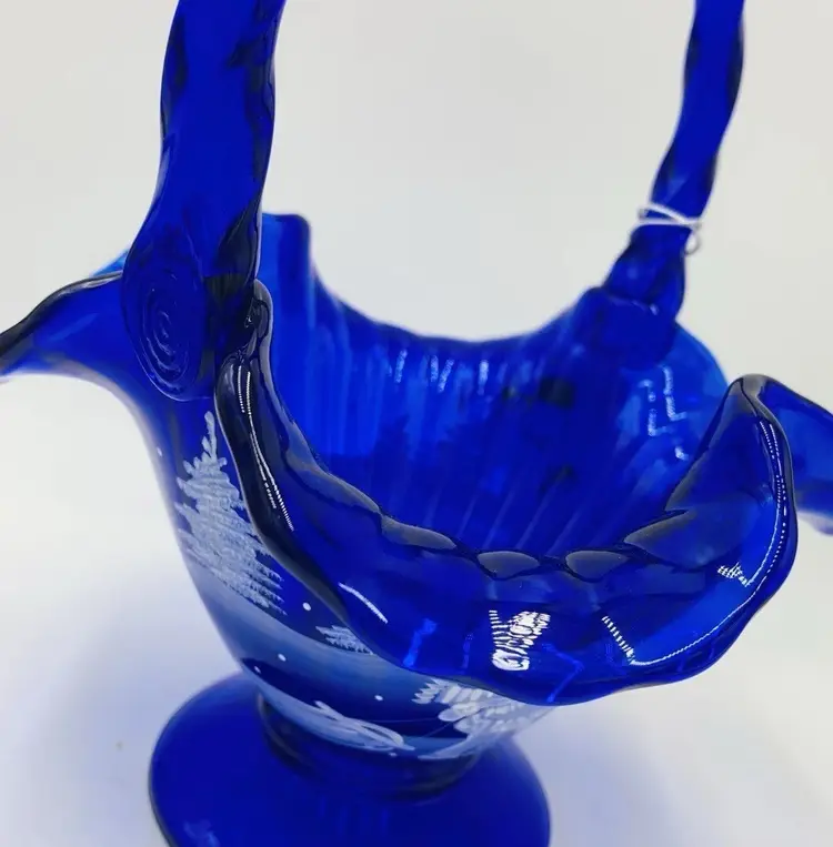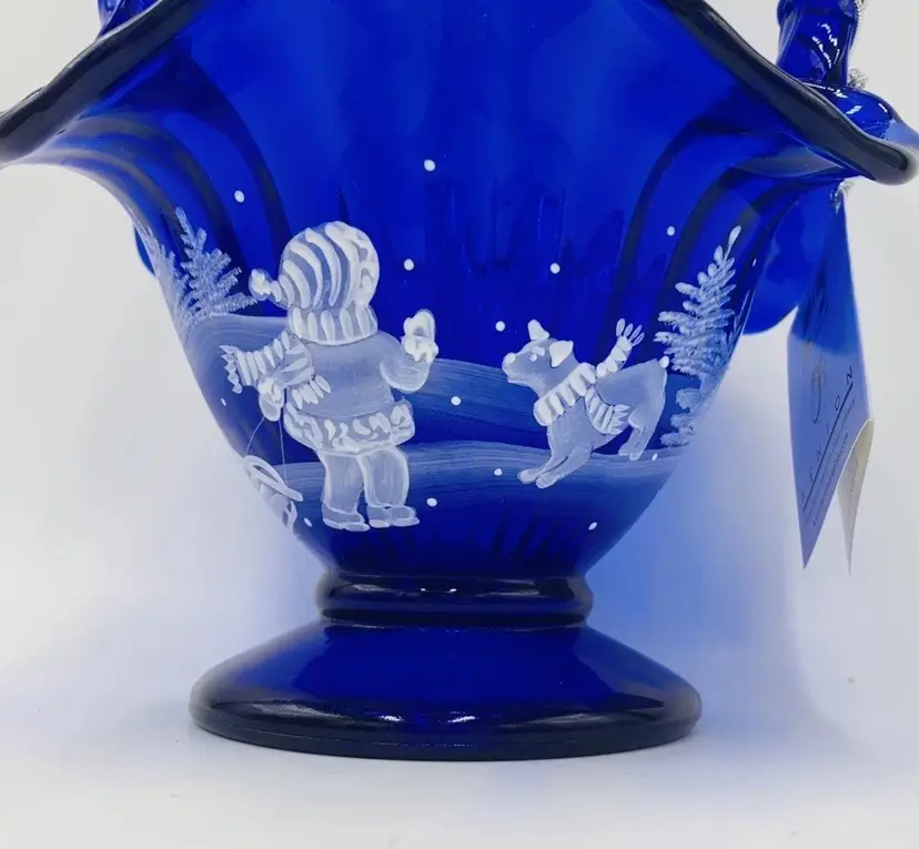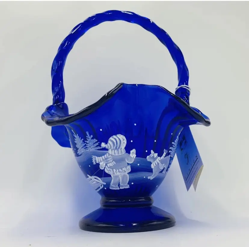 Fenton Cobalt Blue Art Glass 9” Basket Mary Gregory Four Seasons Winter Sledding.