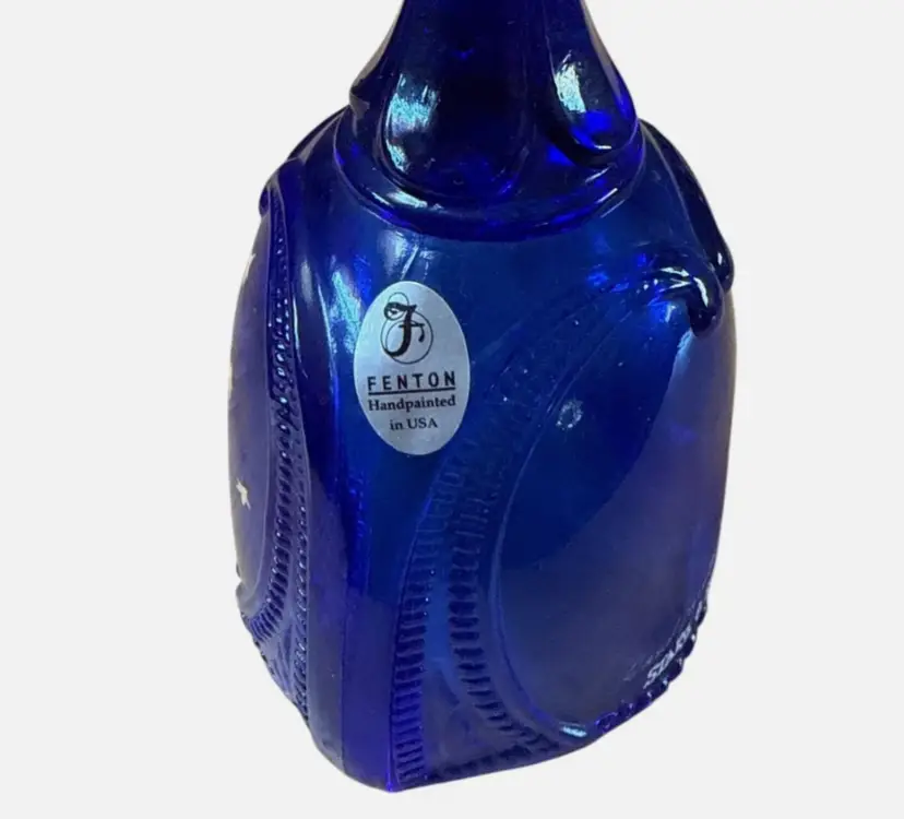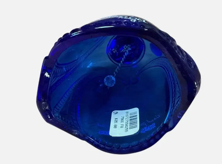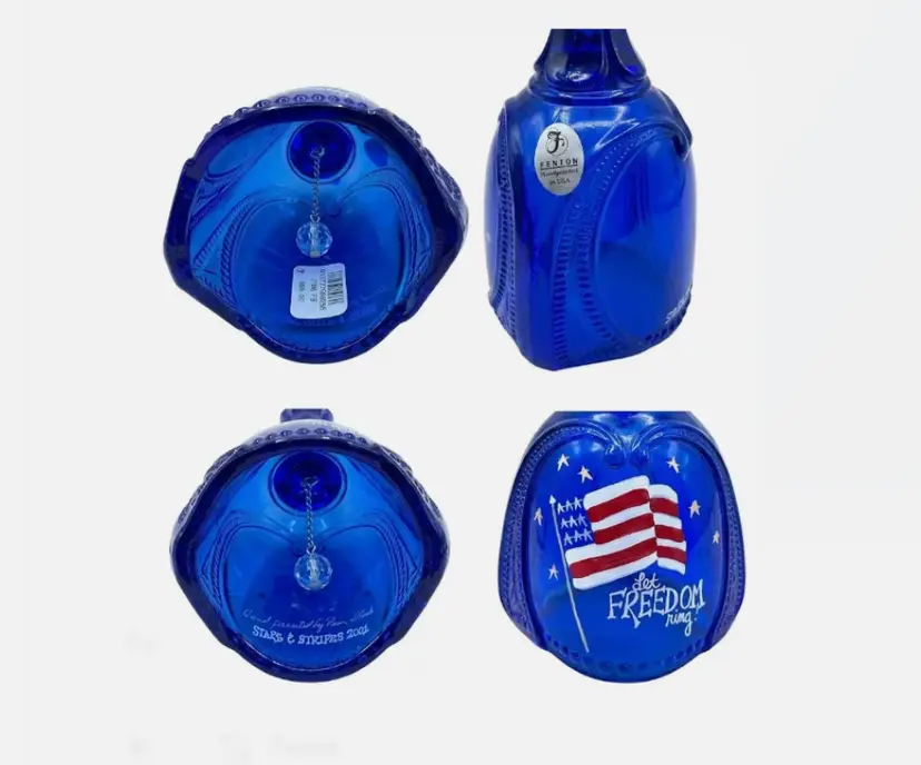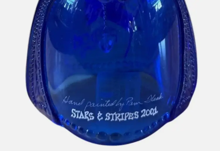 Add a touch of Americana to your collection with this beautiful Fenton Art Glass bell. Part of the 2001 Stars & Stripes collection, this piece features a deep cobalt blue glass body with a vibrant hand-painted American flag.