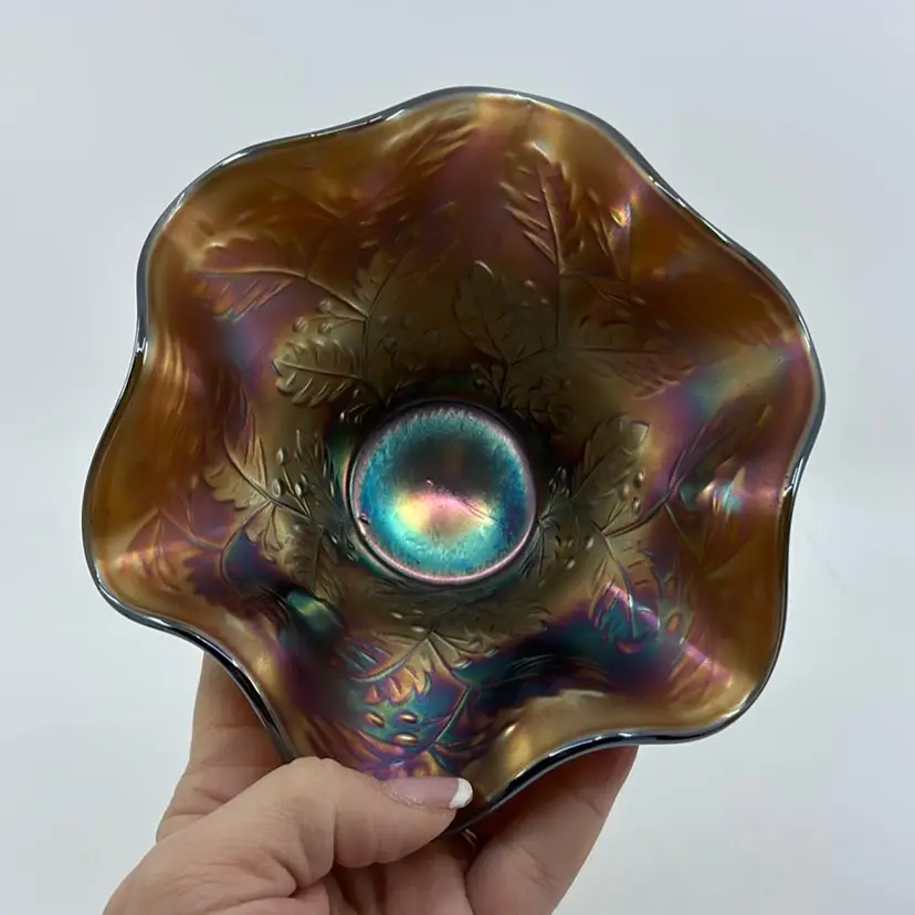 Fenton Cobalt Blue Carnival Glass Ruffled Hat Bowl Holly Berry Pattern 5”