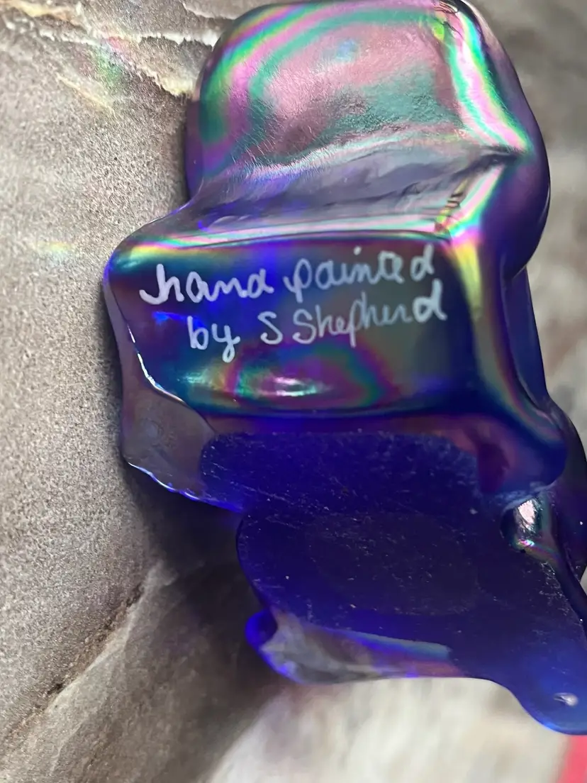 Fenton cobalt blue glass dog or puppy is hand painted with a floral pattern. It is signed by the artist, S. Shepherd. It is approximately 4 inches long, 3 1/2 inches tall and 2 inches wide. Preowned. Excellent condition.