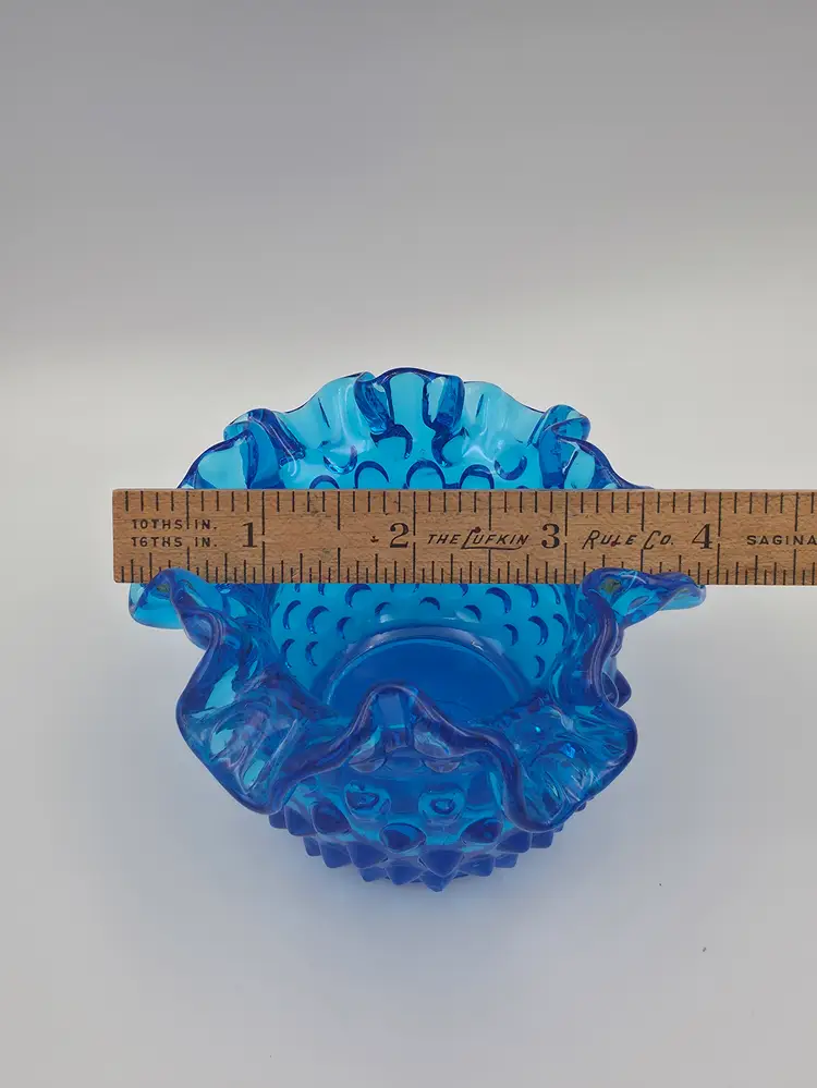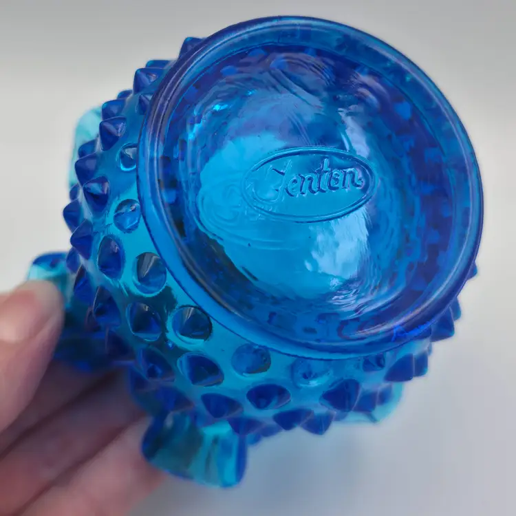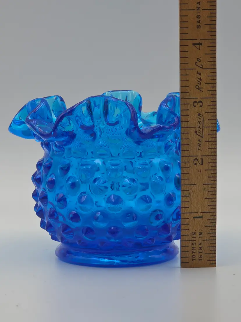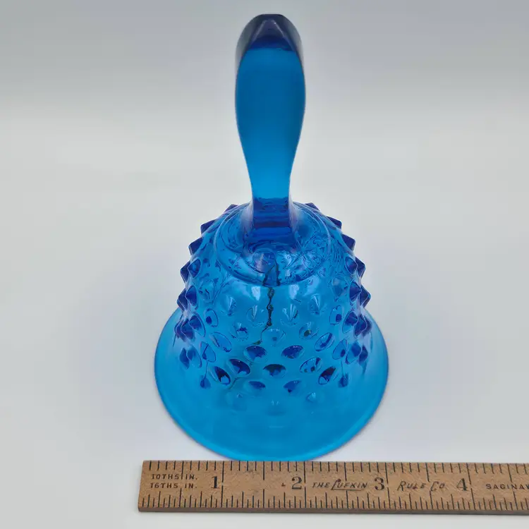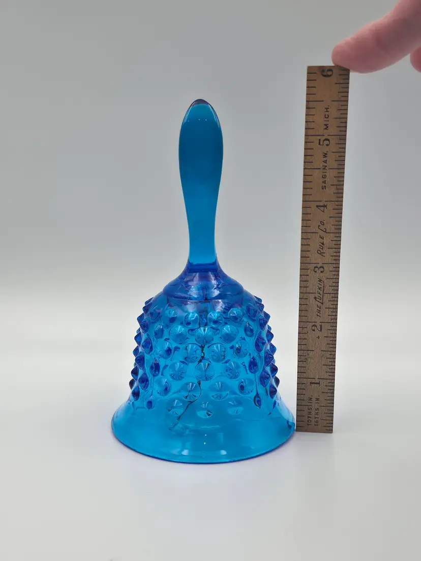 Fenton glass bell in the colonial blue color, about 5.5 inches tall and 3 inches in diameter at the mouth. Original clapper is intact and marked on the inside with the Fenton logo. Hobnail Double Crimped Vase standing at 3 inches tall and 4 inches wide. Double stamped Fenton logo on the bottom. Both are in very good condition without chips or cracks. Thank you for looking and have a great day!