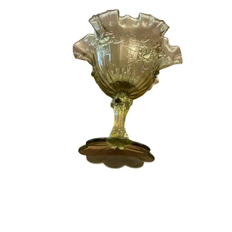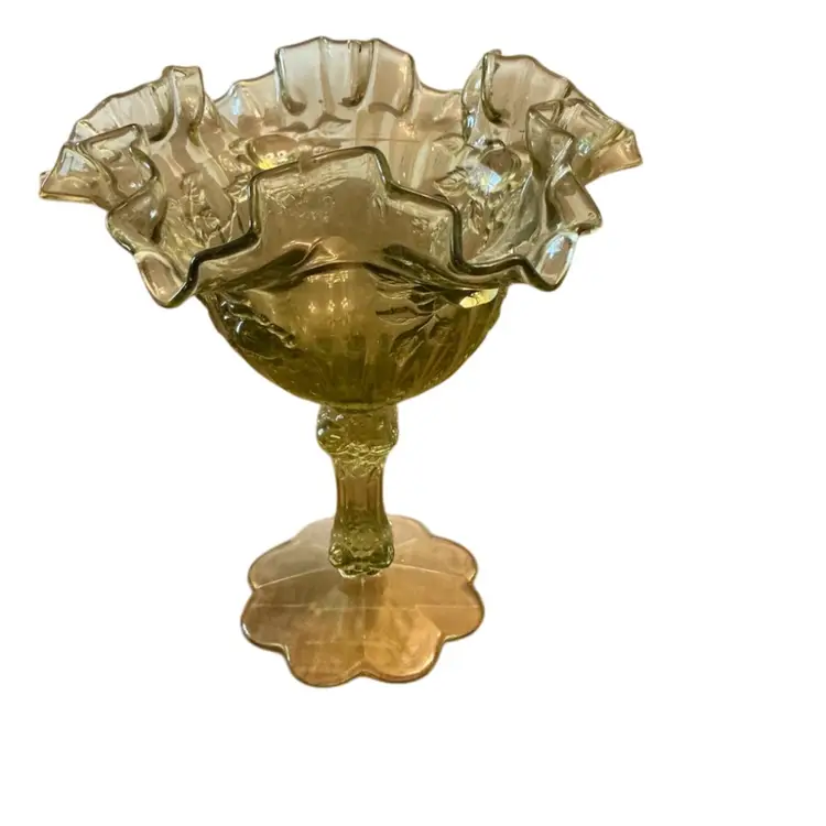 Beautiful muted green colored compote. Perfect to hold your holiday candies or glass ones. The cabbage rose motif is one of the oldest Fenton designs. No stamp so this piece is pre 1973. 7” high by 6” across.