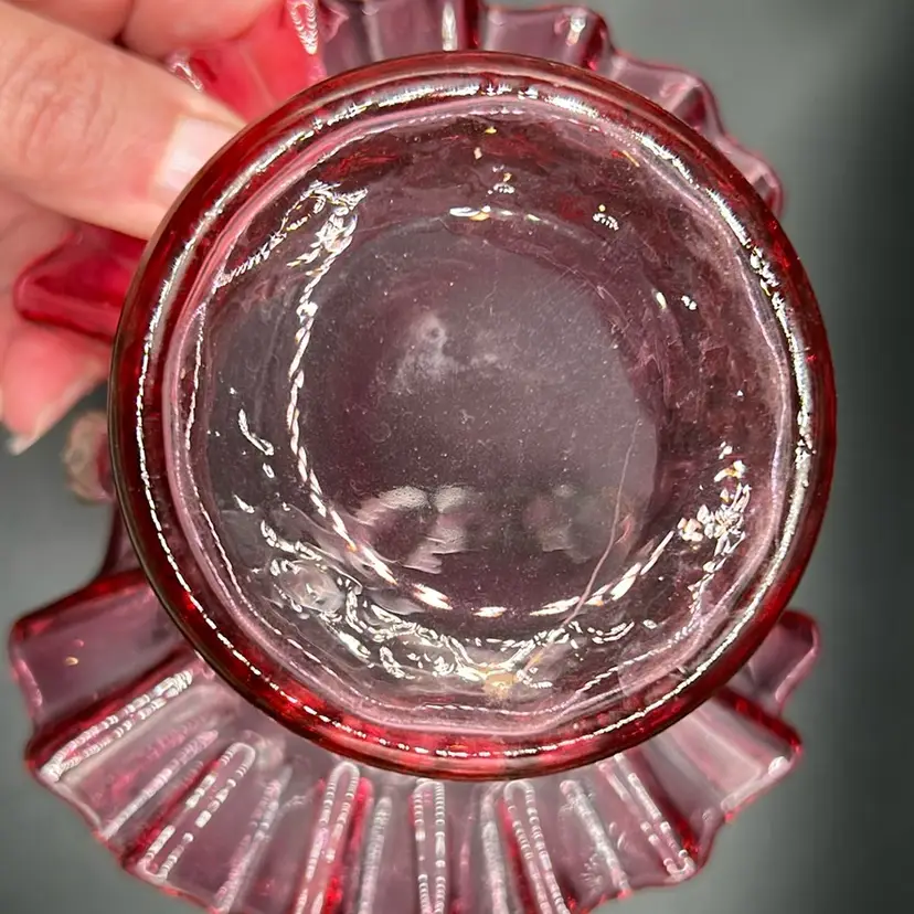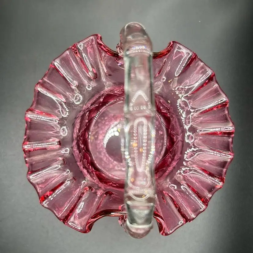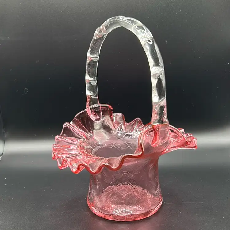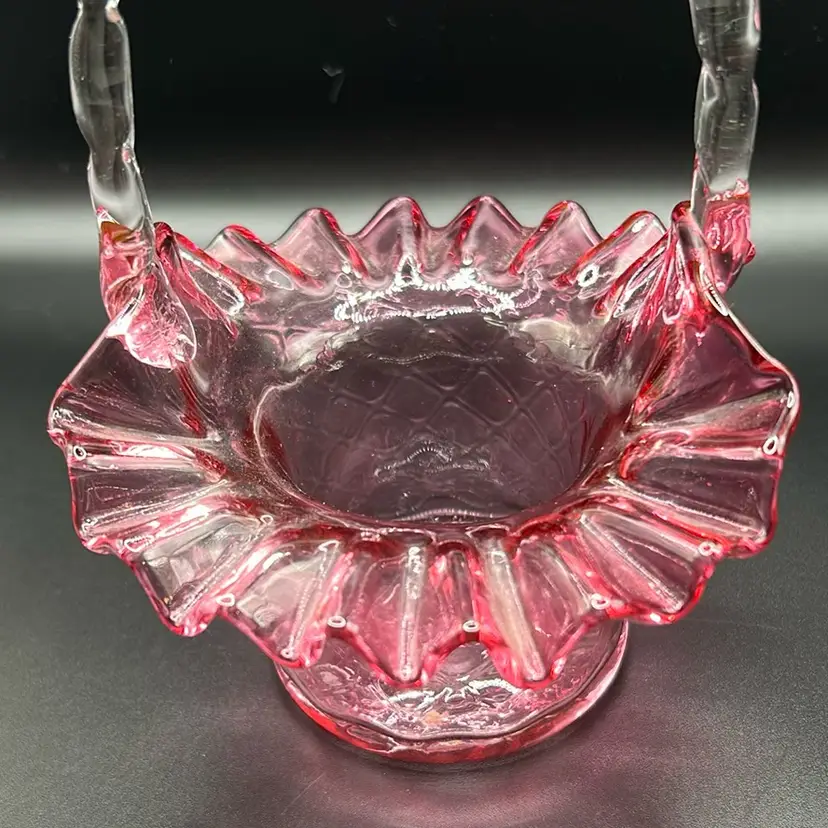 This item is a vintage Fenton cranberry basket featuring a honeycomb and bamboo design. It has a ruffle top and clear handle. It stands 7 inches tall to the top of the handle and approximately 4 inches wide. There are no chips or cracks.