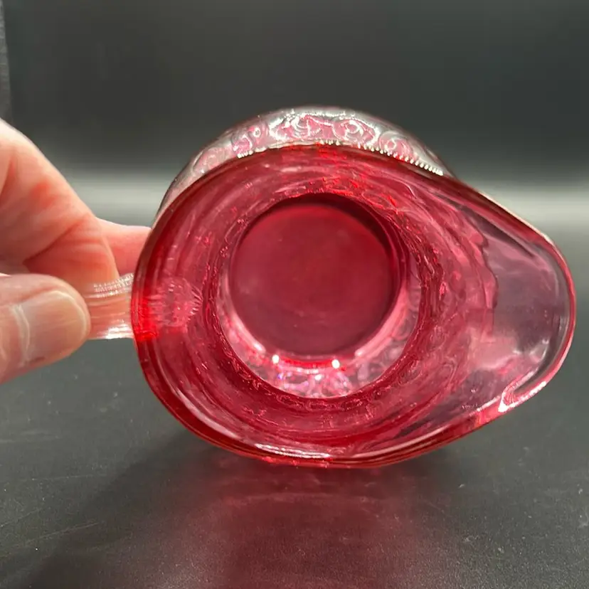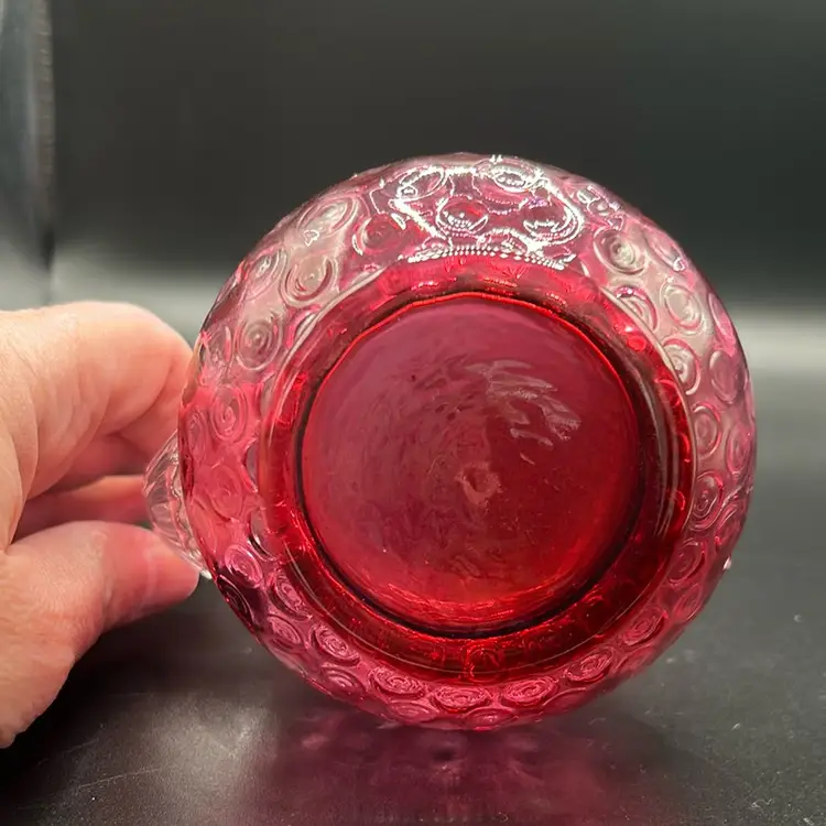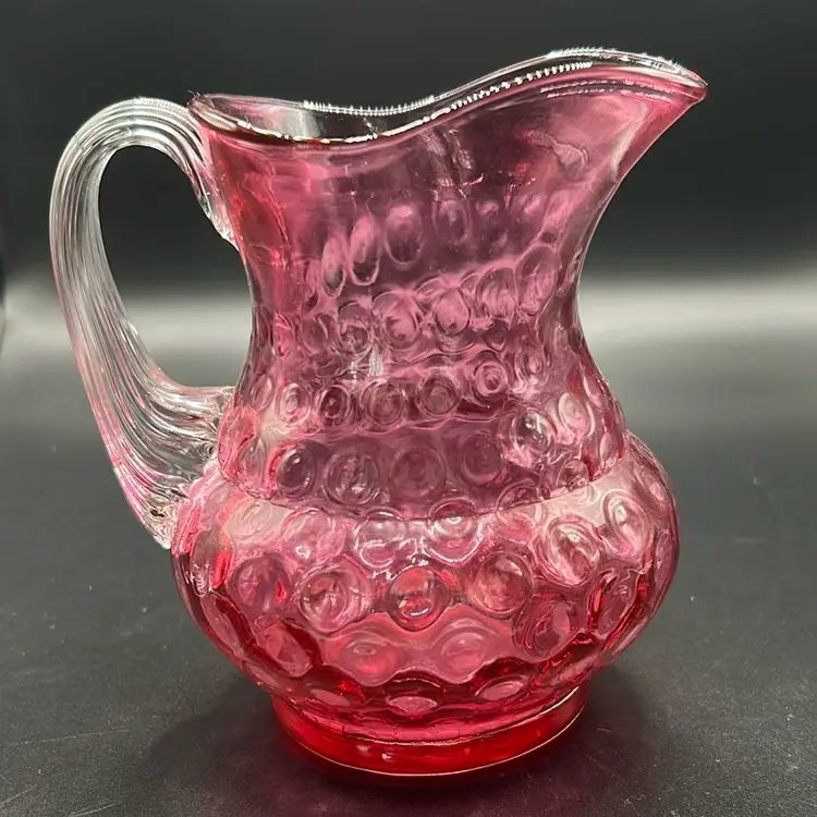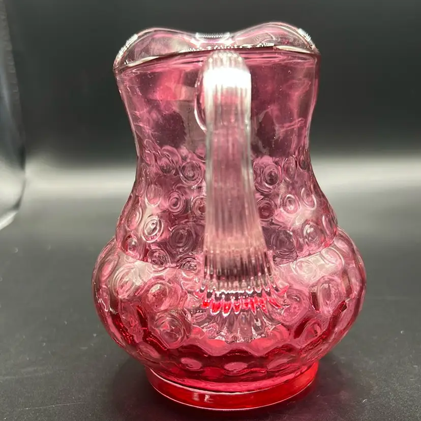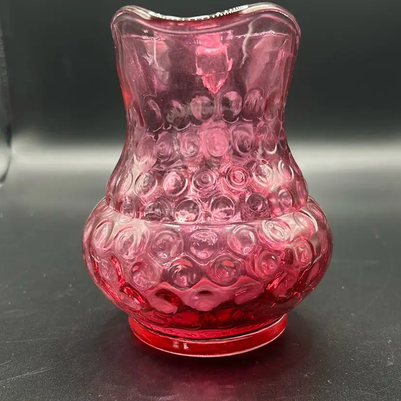 This item is a vintage Fenton cranberry coin dot glass picture it features a rib to clear your handle. It stands 4 1/2 inches tall and 4 1/2 inches wide. There are no chips or crocs.