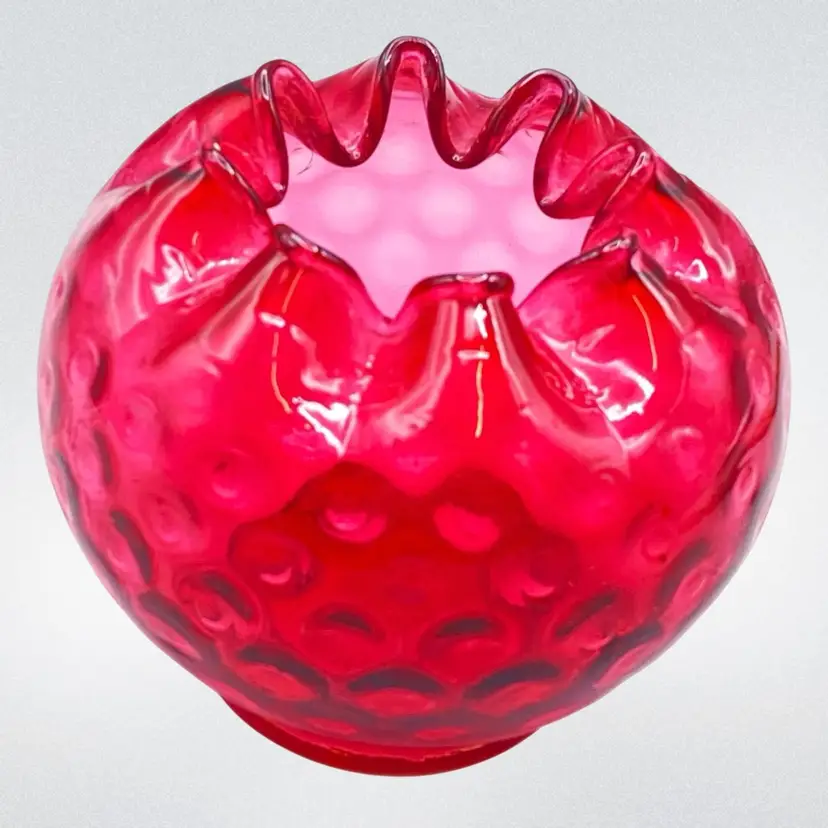 Fenton Cranberry Glass Thumbprint Crimped Rose Bowl Vase Vintage