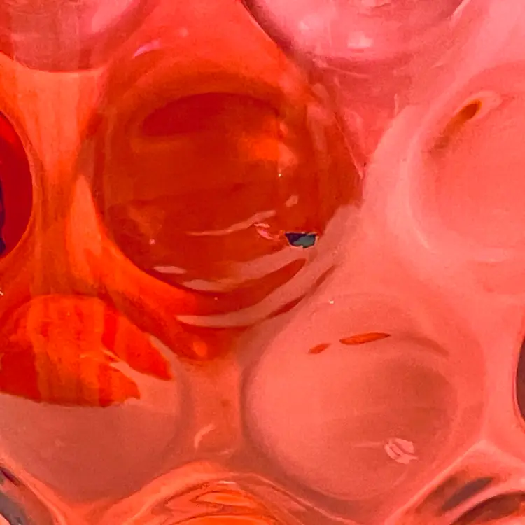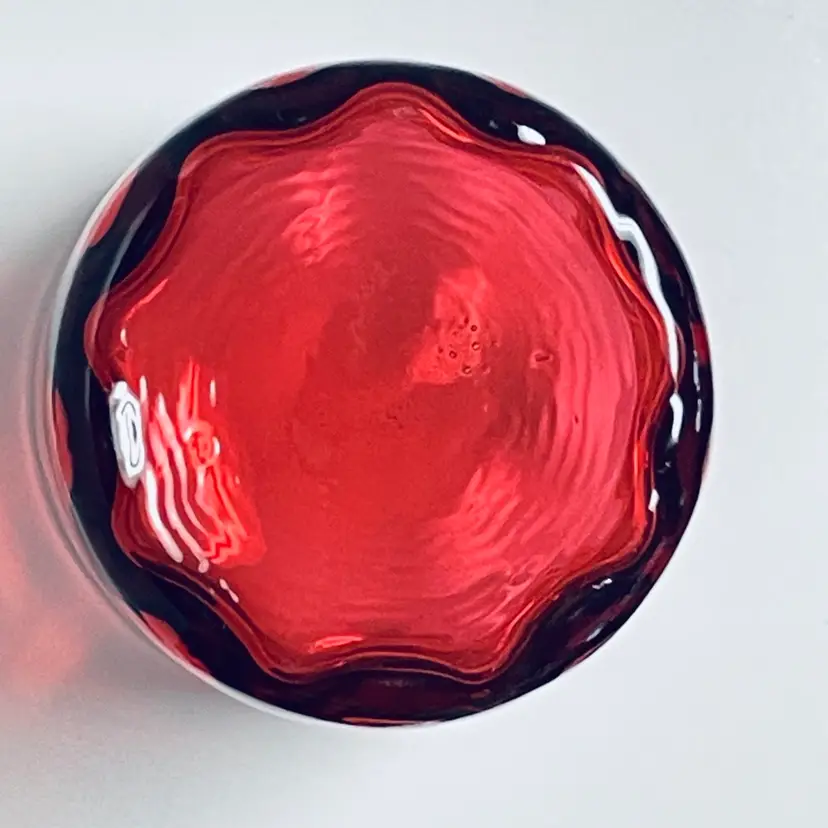 There is a tiny black mark (I think it’s a piece of ash from when the glass was being blown) that is trapped in the glass. Since the cranberry color is on the darker side in this piece, it is not that noticeable. PLEASE SEE PHOTOS