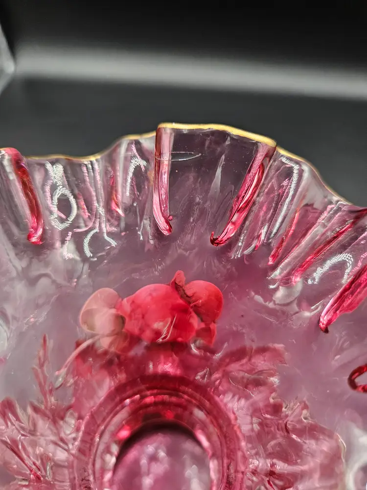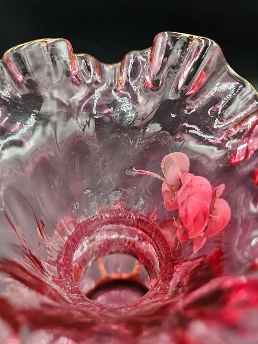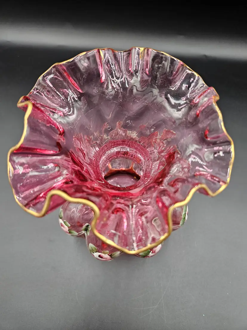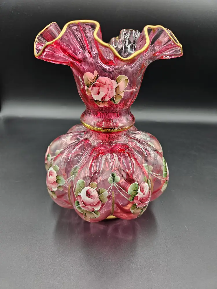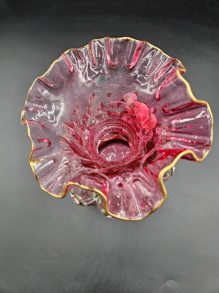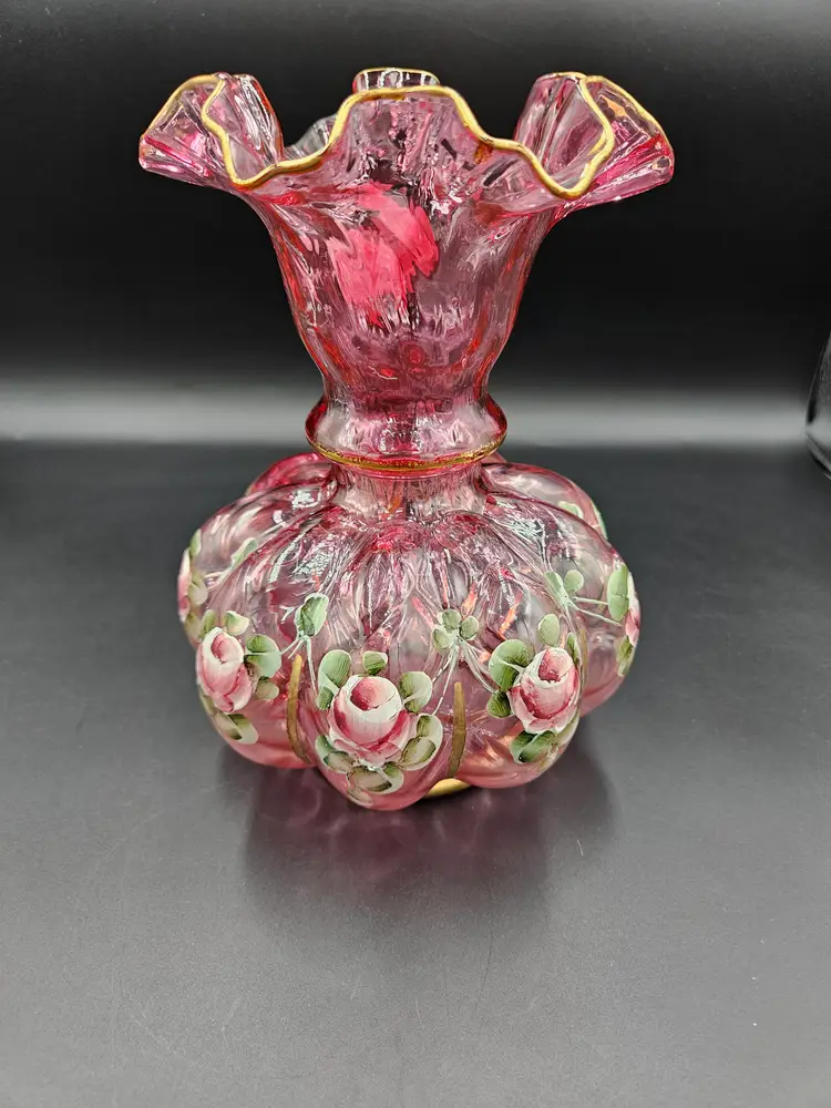 There are 5 bubbles that have chipped or lost their color near the ruffled part of the vase. The inside of the vase is slightly hazy. Paint is worn in spots.