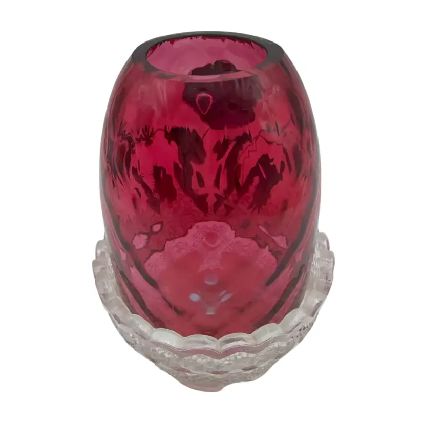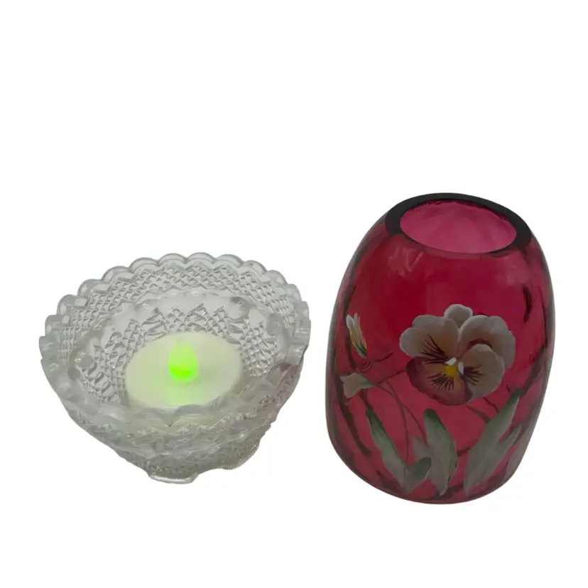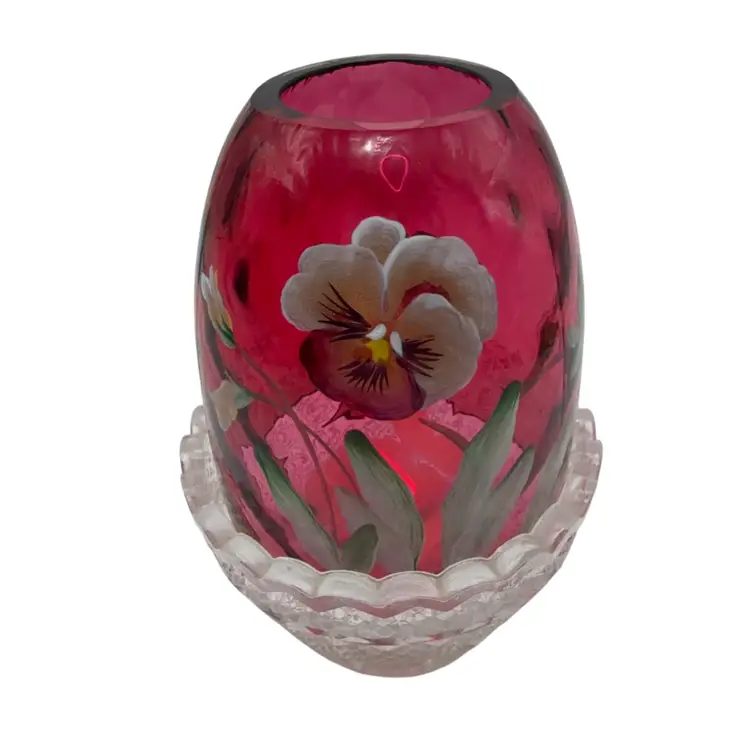 Featuring hand painted pansy florals set upon a clear glass ruffled base. Signed by D. Cutshaw and in mint condition!