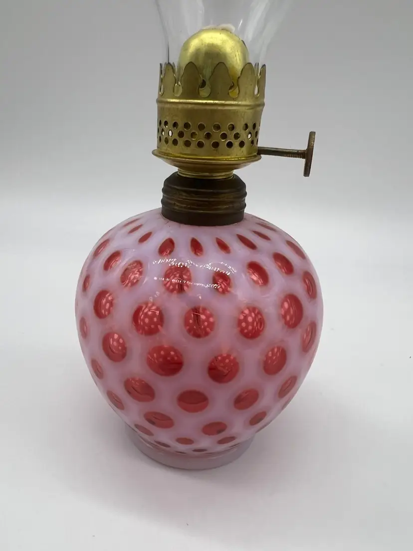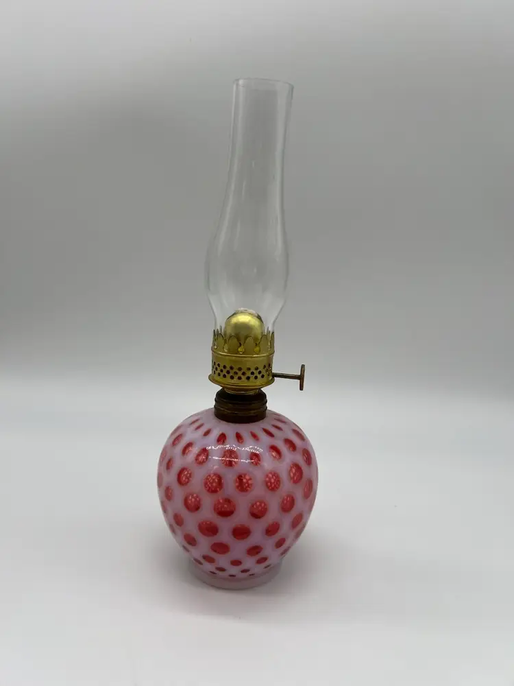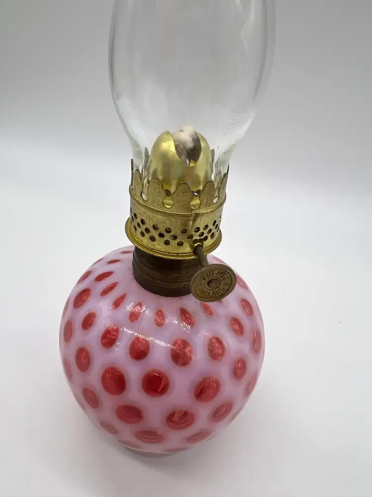 Measuring just a 9 inches to the top of the shade, this lamp showcases the iconic Coin Dot pattern, which adds texture and elegance. Ideal for display on shelves, mantels, or as a unique gift for collectors, this miniature oil lamp embodies the charm and nostalgia of vintage lighting.